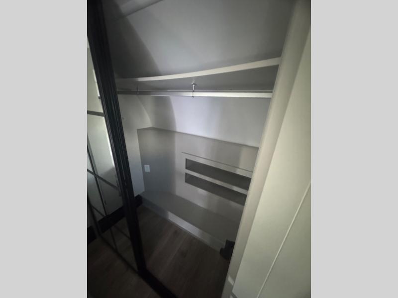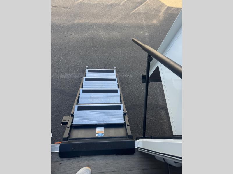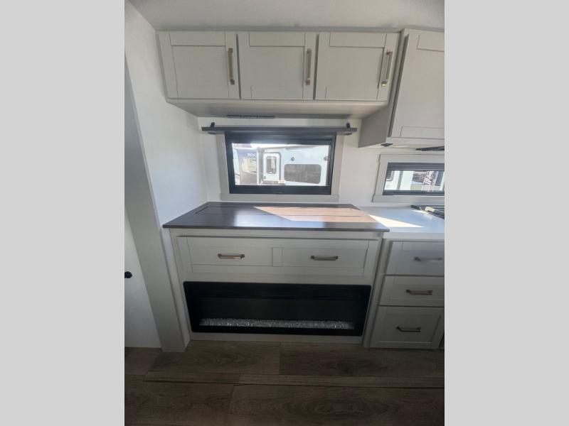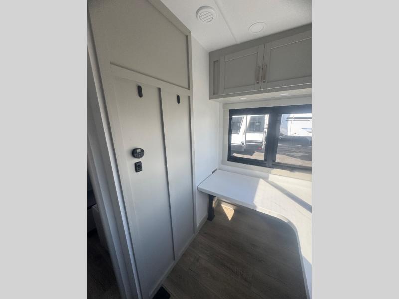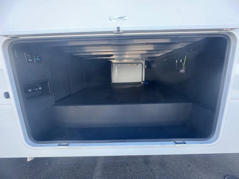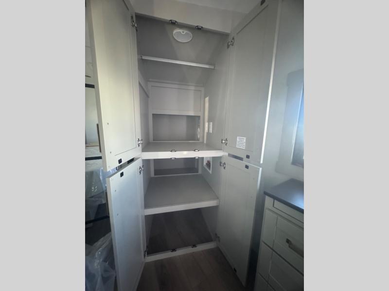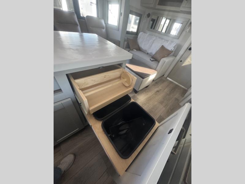 If you're looking for a feature-packed fifth wheel, this is the one! The rear multipurpose flex space can be used as an office/butler's pantry/laundry room/mudroom! There is an adjustable-height desk, storage space, plus washer and dryer prep. One of the dual entry doors is even found here for added convenience. The combined middle kitchen and living room includes dual opposing slides, a tri-fold sofa, theater seating, and a sliding desk/dining table. There is also a televator and fireplace, kitchen island with pet bowls, and an 84" pantry with adjustable shelving to name a few more features. A full bath towards the front includes a 30" x 42" shower, and the front private bedroom will feel just like home with its king bed slide out. There is also a sliding dresser top with hidden storage, bedside shelves, a front wardrobe, and washer and dryer prep here also!