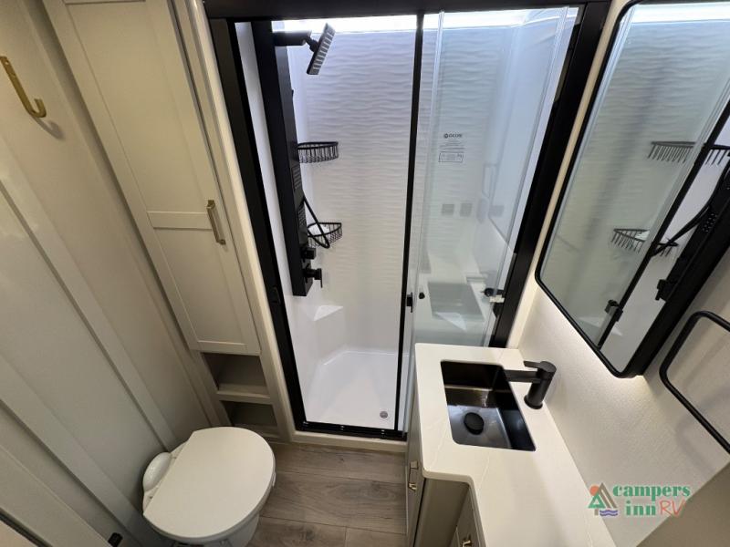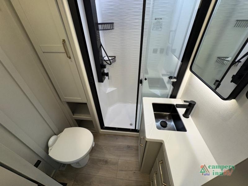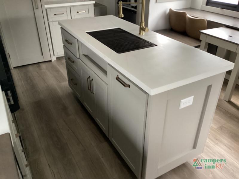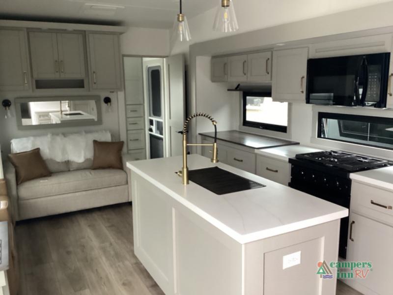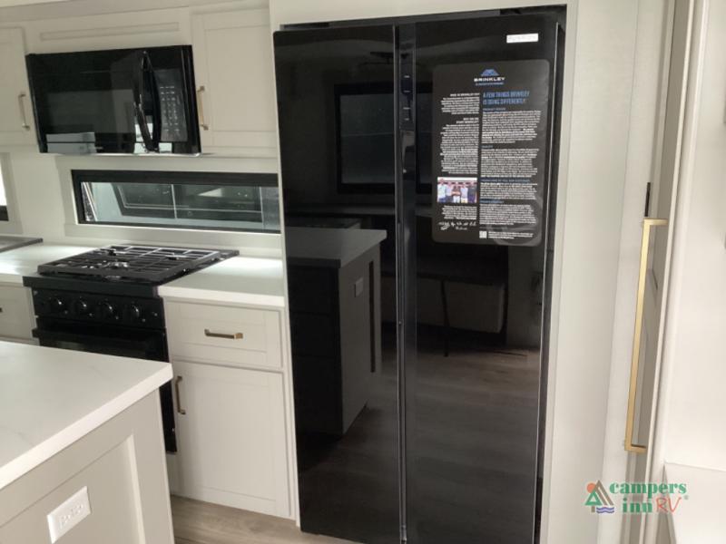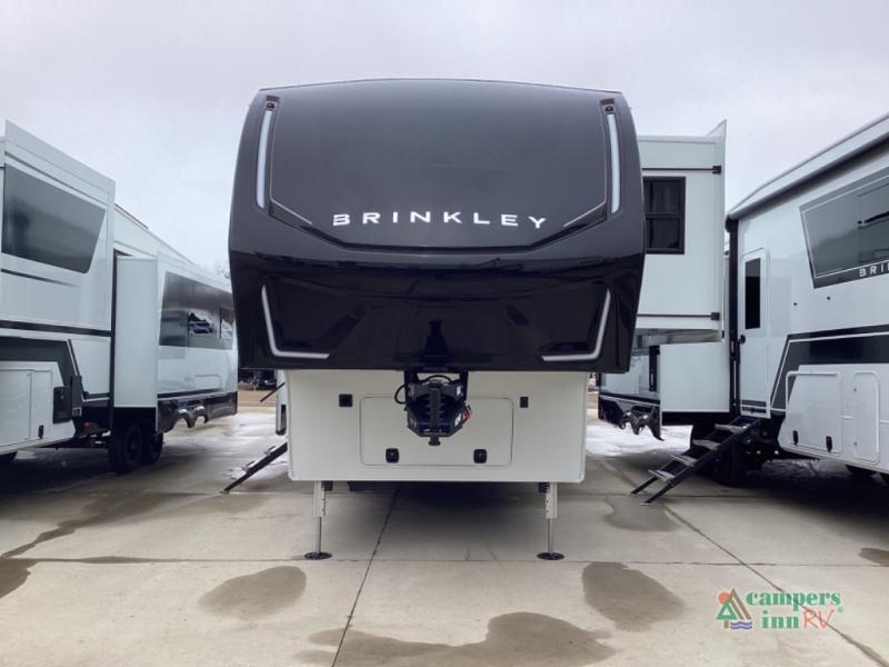 The Brinkley mid-profile Model Z fifth wheels bring you clean lines and an upscale look with plenty of style and exciting new features like the industry first brass plumbing connections. These units also feature an automotive grade front cap, plenty of exterior storage, dual exterior hot and cold showers, and wide stance leveling jacks for easy set up. Residential frameless windows provide a clean look and beautiful views, and ample electrical outlets and 6 USB/USB-C outlets allow all of your electronics and appliances to easily be used and charged.