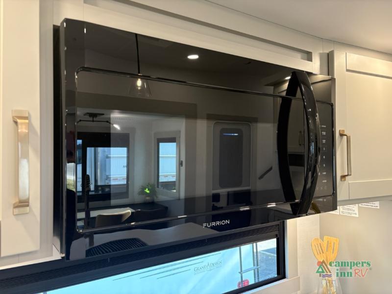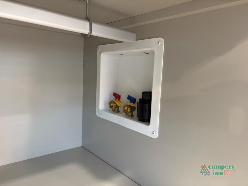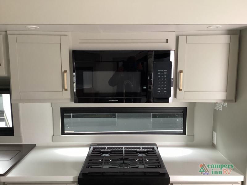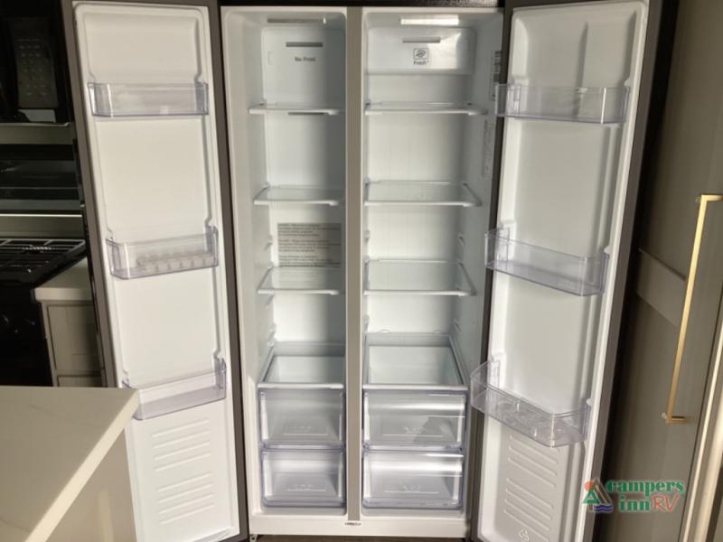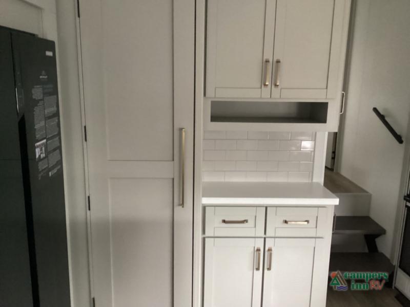 If you're looking for a feature-packed fifth wheel, this is the one! The rear multipurpose flex space can be used as an office/butler's pantry/laundry room/mudroom! There is an adjustable-height desk, storage space, plus washer and dryer prep. One of the dual entry doors is even found here for added convenience. The combined middle kitchen and living room includes dual opposing slides, a tri-fold sofa, theater seating, and a sliding desk/dining table. There is also a televator and fireplace, kitchen island with pet bowls, and an 84" pantry with adjustable shelving to name a few more features. A full bath towards the front includes a 30" x 42" shower, and the front private bedroom will feel just like home with its king bed slide out. There is also a sliding dresser top with hidden storage, bedside shelves, a front wardrobe, and washer and dryer prep here also!
