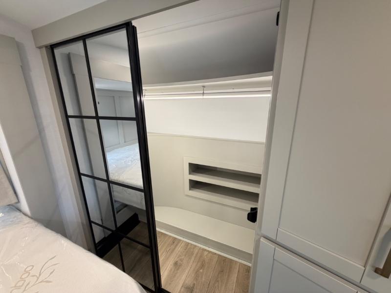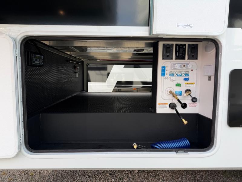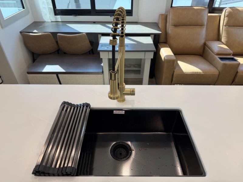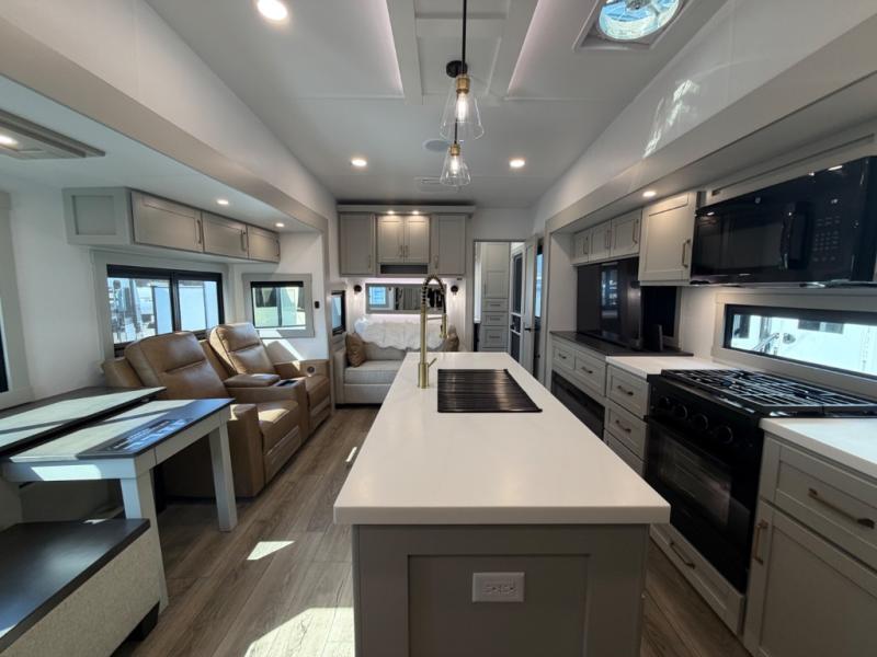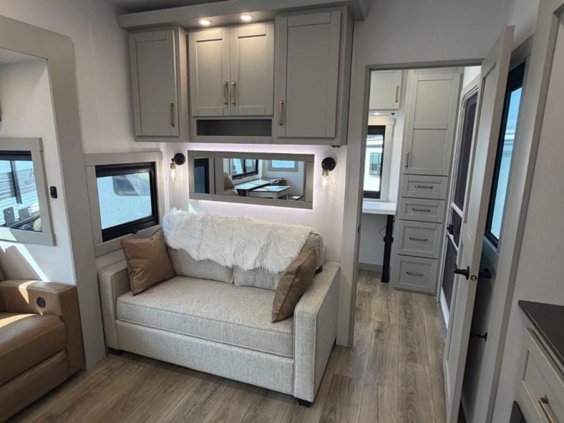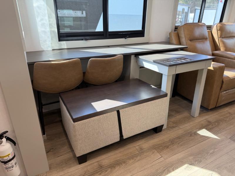 If you're looking for a feature-packed fifth wheel, this is the one! The rear multipurpose flex space can be used as an office/butler's pantry/laundry room/mudroom! There is an adjustable-height desk, storage space, plus washer and dryer prep. One of the dual entry doors is even found here for added convenience. The combined middle kitchen and living room includes dual opposing slides, a tri-fold sofa, theater seating, and a sliding desk/dining table. There is also a televator and fireplace, kitchen island with pet bowls, and an 84" pantry with adjustable shelving to name a few more features. A full bath towards the front includes a 30" x 42" shower, and the front private bedroom will feel just like home with its king bed slide out. There is also a sliding dresser top with hidden storage, bedside shelves, a front wardrobe, and washer and dryer prep here also!
