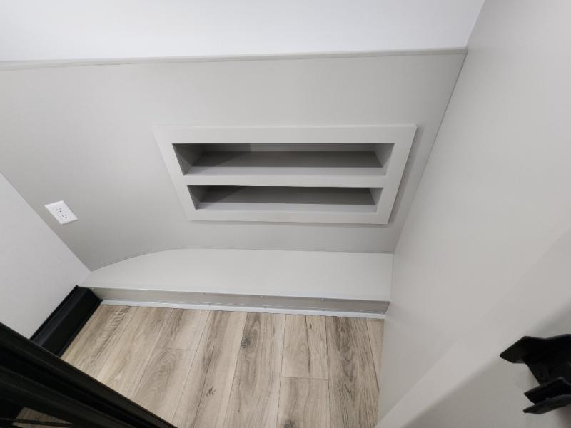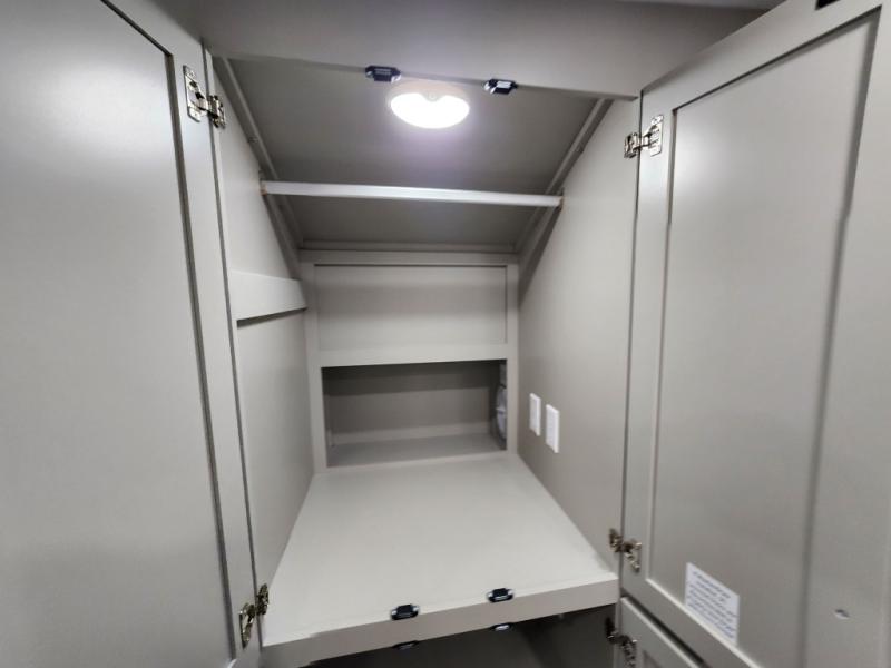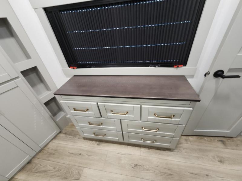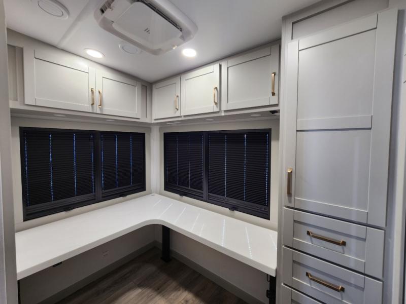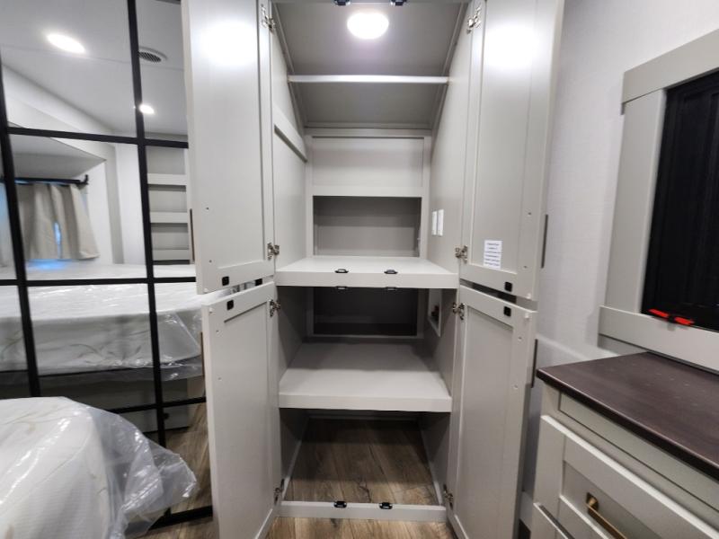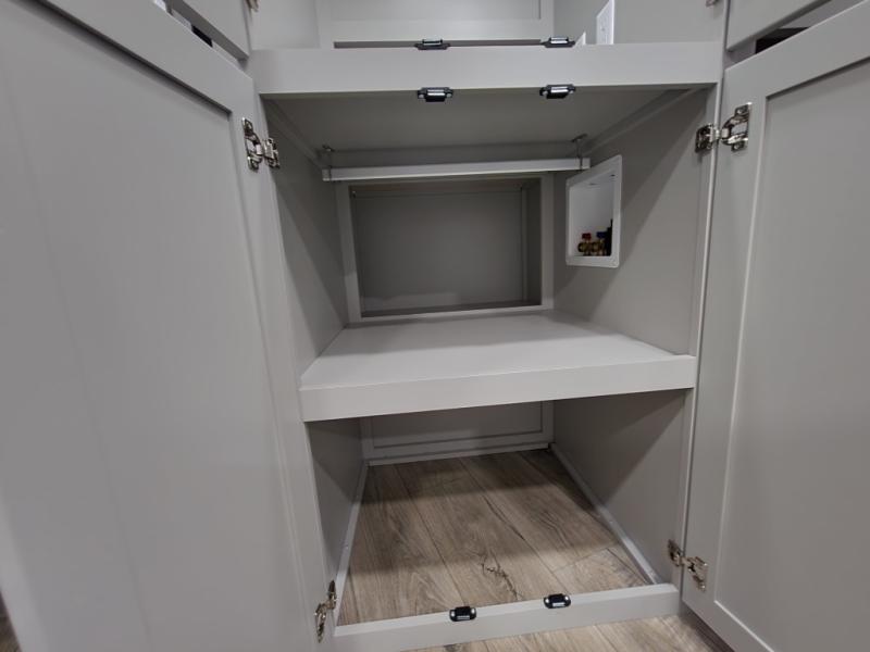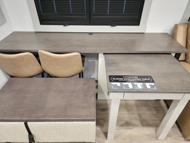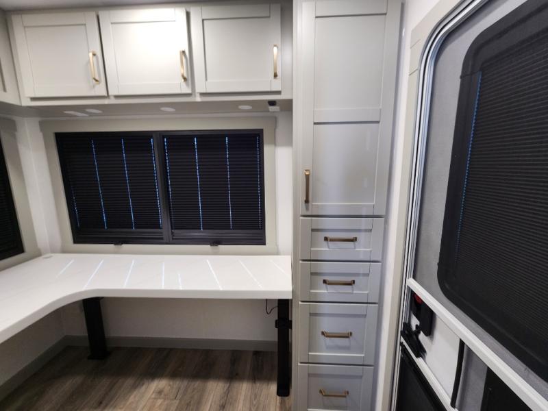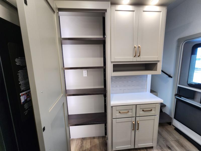 If you're looking for a feature-packed fifth wheel, this is the one! The rear multipurpose flex space can be used as an office/butler's pantry/laundry room/mudroom! There is an adjustable-height desk, storage space, plus washer and dryer prep. One of the dual entry doors is even found here for added convenience. The combined middle kitchen and living room includes dual opposing slides, a tri-fold sofa, theater seating, and a sliding desk/dining table. There is also a televator and fireplace, kitchen island with pet bowls, and an 84" pantry with adjustable shelving to name a few more features. A full bath towards the front includes a 30" x 42" shower, and the front private bedroom will feel just like home with its king bed slide out. There is also a sliding dresser top with hidden storage, bedside shelves, a front wardrobe, and washer and dryer prep here also!