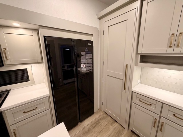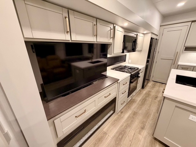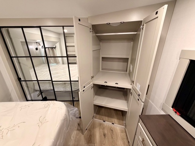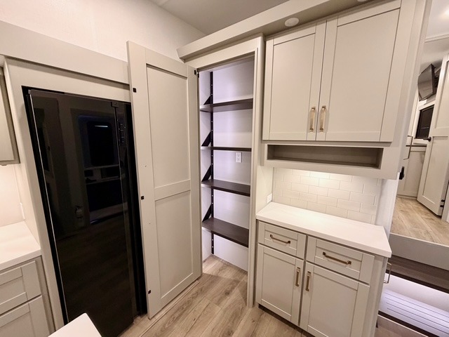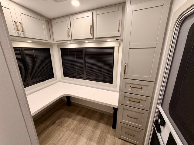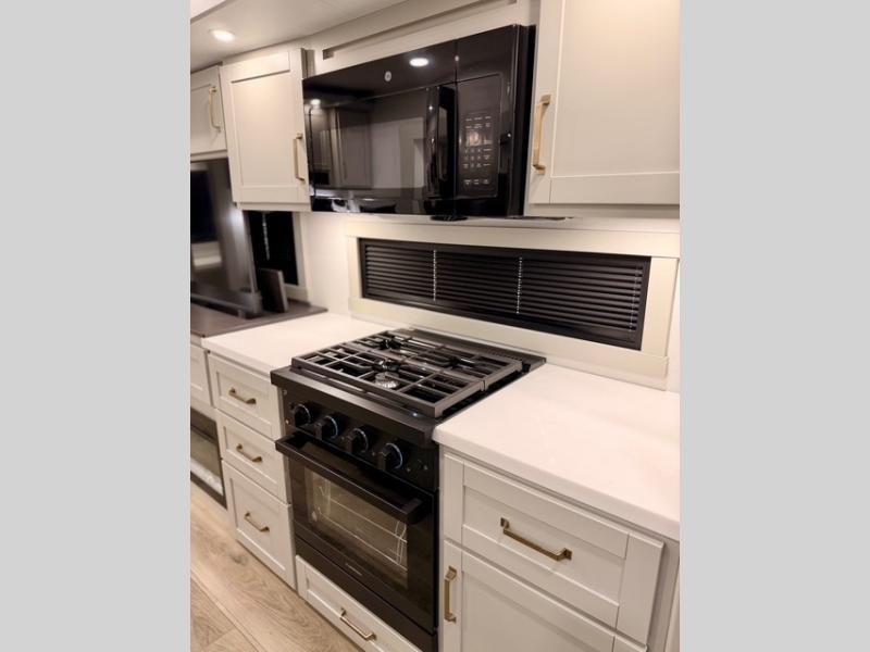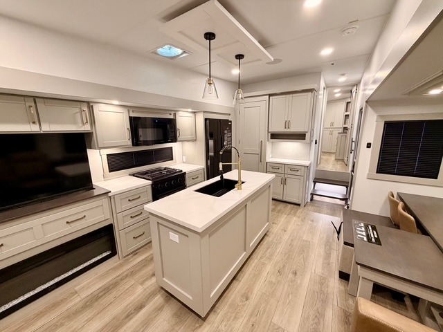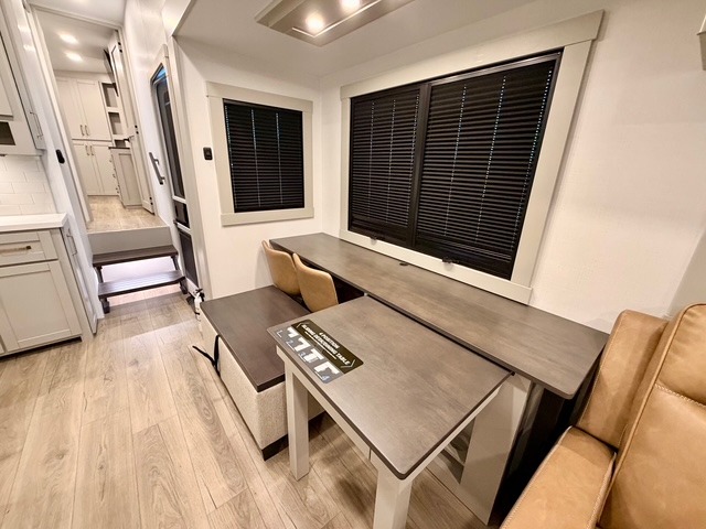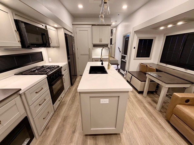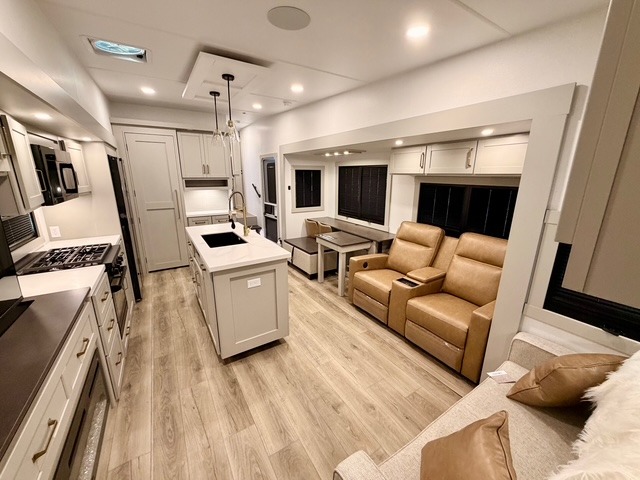If you're looking for a feature-packed fifth wheel, this is the one! The rear multipurpose flex space can be used as an office/butler's pantry/laundry room/mudroom! There is an adjustable-height desk, storage space, plus washer and dryer prep. One of the dual entry doors is even found here for added convenience. The combined middle kitchen and living room includes dual opposing slides, a tri-fold sofa, theater seating, and a sliding desk/dining table. There is also a televator and fireplace, kitchen island with pet bowls, and an 84" pantry with adjustable shelving to name a few more features. A full bath towards the front includes a 30" x 42" shower, and the front private bedroom will feel just like home with its king bed slide out. There is also a sliding dresser top with hidden storage, bedside shelves, a front wardrobe, and washer and dryer prep here also!