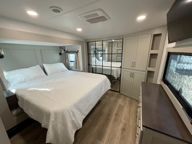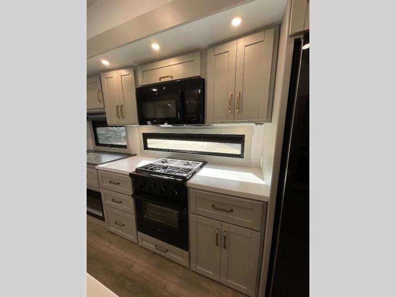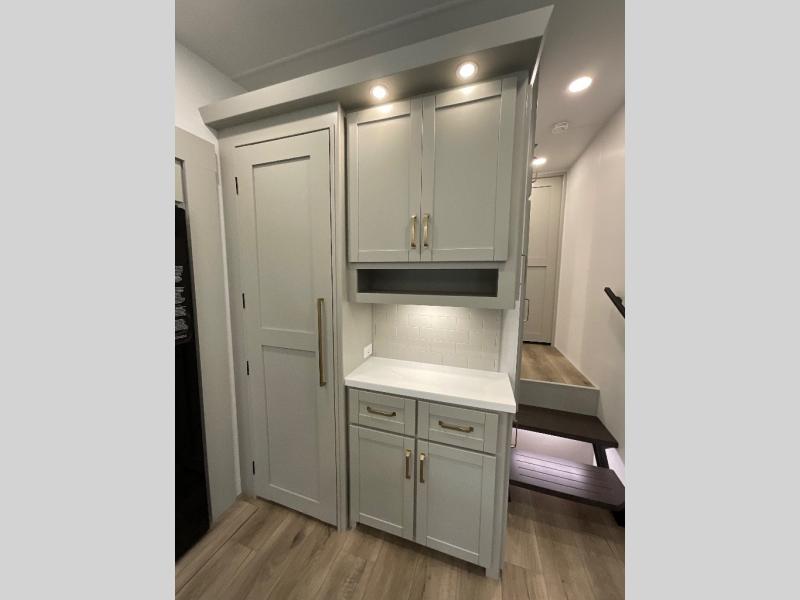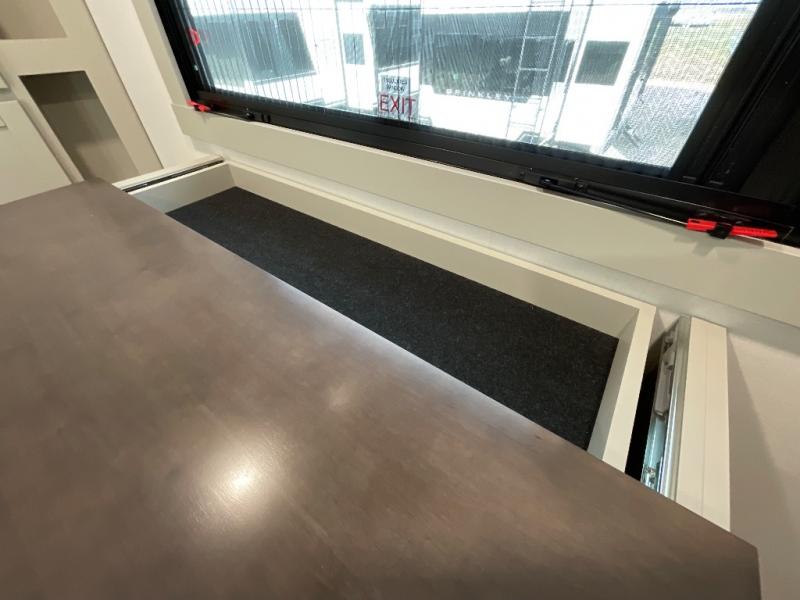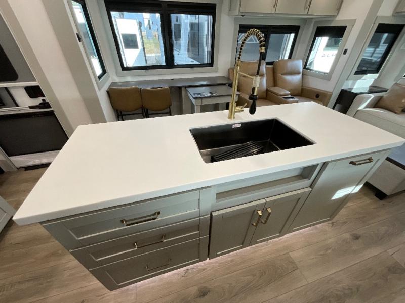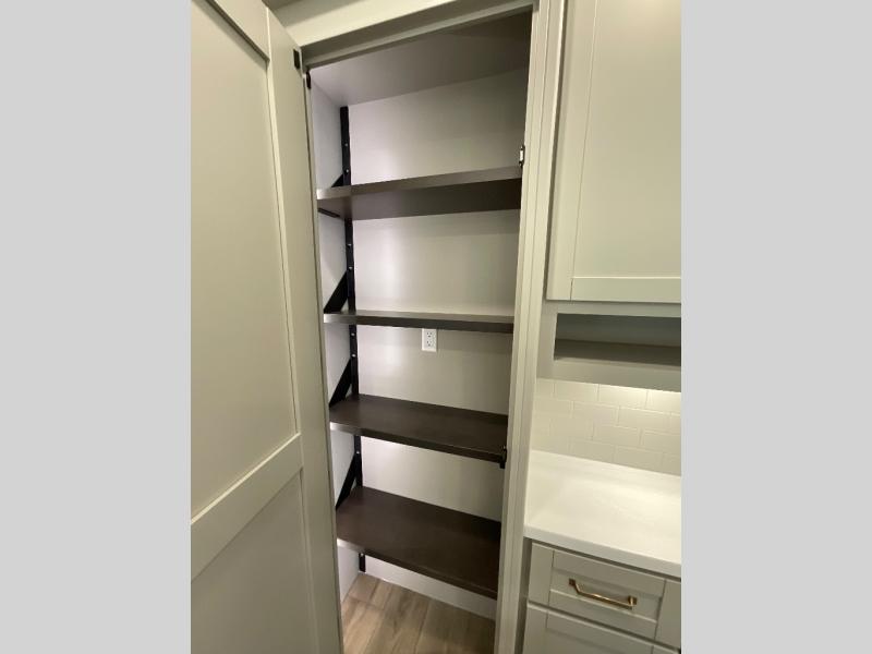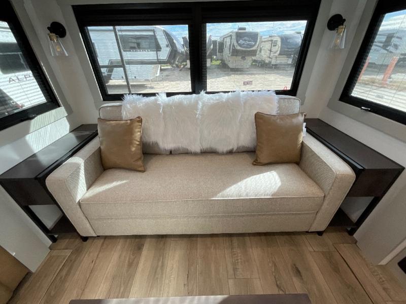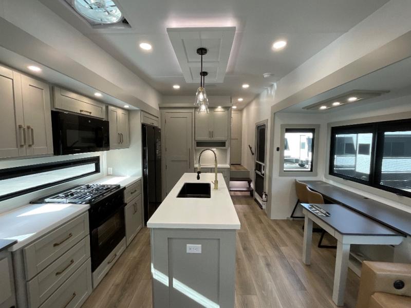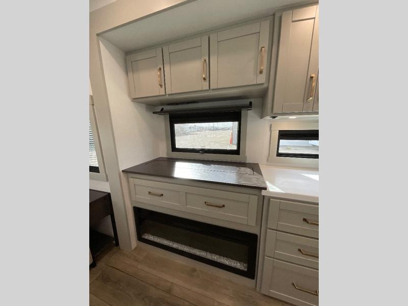 This unit is perfect for weekends at the campground or extended stays! There is ample seating with a sliding desk/dining table, 62" theater seating, and a 72" tri-fold sofa along the rear wall. You can easily relax and enjoy the telescoping TV with a cozy fireplace below. The kitchen offers all that you need to prepare and cook meals just like home with a 16-cu. ft. refrigerator for your perishables, a 30" residential microwave oven, and three burner range top and oven. You will love the kitchen island all outfitted with pull-out pet bowls and double pull-out trash bins with an integrated Stow & Go paper towel holder. There is also an 84" pantry with adjustable shelves for all of your canned and dry goods. Head up the steps to a find a full bath and a private bedroom with a king bed slide all the way up front. A sliding dresser top features hidden storage which is perfect for jewelry and other personal belongings. The front wardrobe features mirrored doors, and the corner closet has been prepped for a stackable washer and dryer if you choose to add that option.