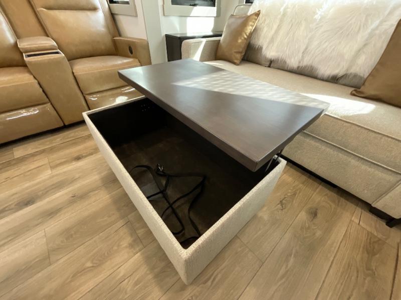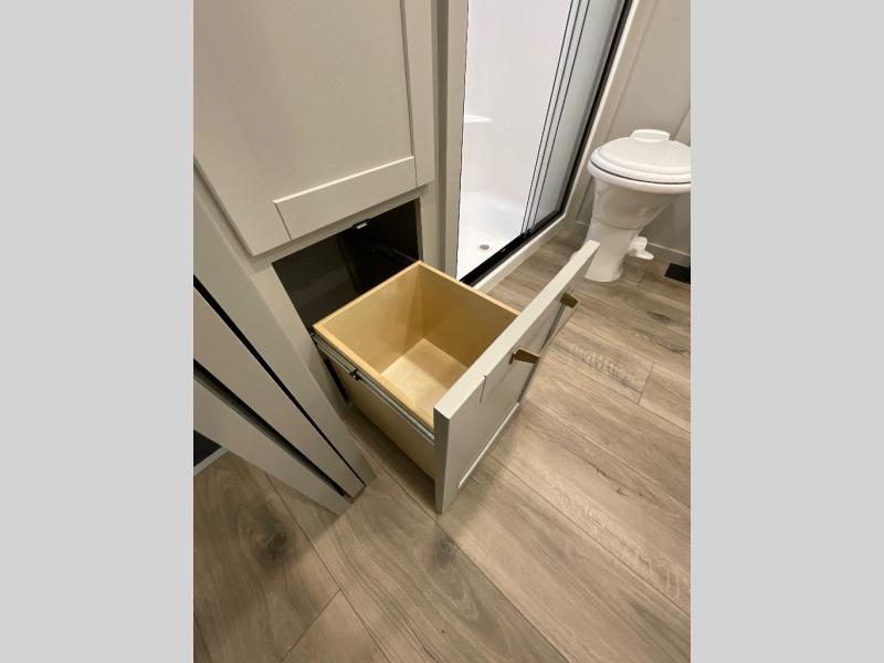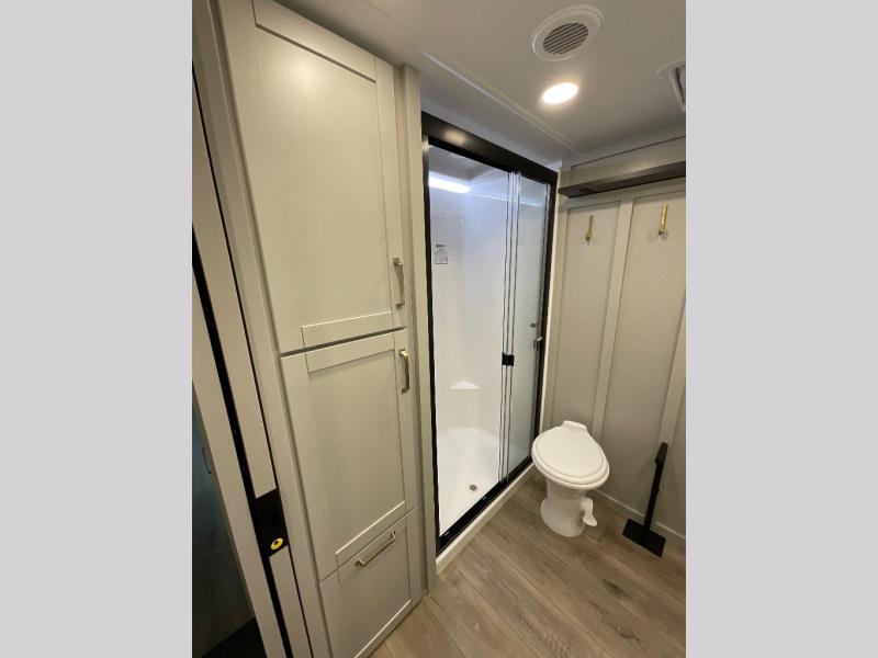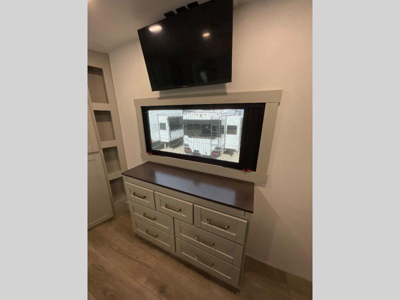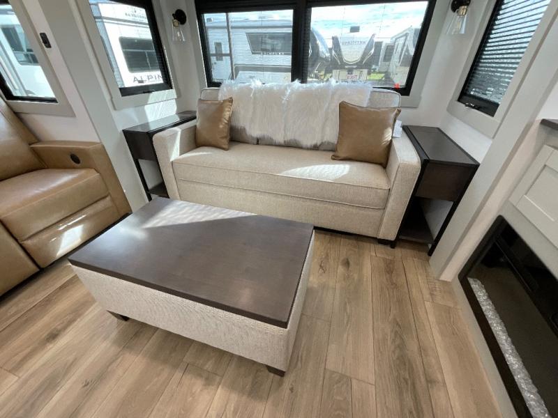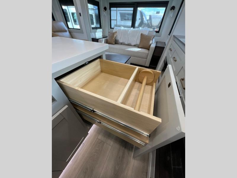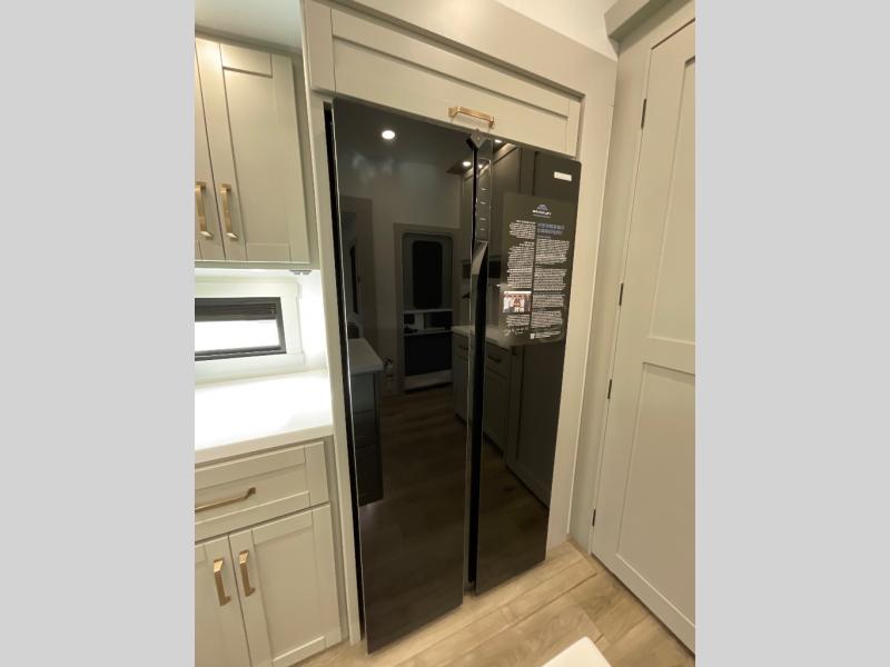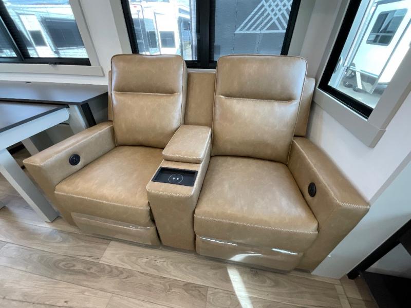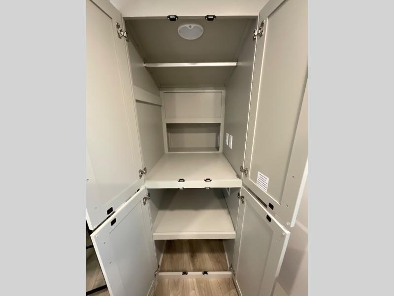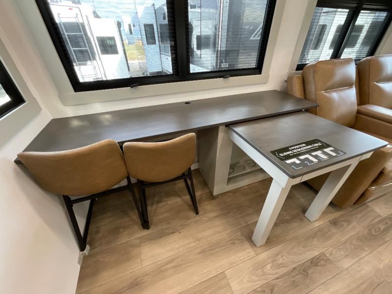 This unit is perfect for weekends at the campground or extended stays! There is ample seating with a sliding desk/dining table, 62" theater seating, and a 72" tri-fold sofa along the rear wall. You can easily relax and enjoy the telescoping TV with a cozy fireplace below. The kitchen offers all that you need to prepare and cook meals just like home with a 16-cu. ft. refrigerator for your perishables, a 30" residential microwave oven, and three burner range top and oven. You will love the kitchen island all outfitted with pull-out pet bowls and double pull-out trash bins with an integrated Stow & Go paper towel holder. There is also an 84" pantry with adjustable shelves for all of your canned and dry goods. Head up the steps to a find a full bath and a private bedroom with a king bed slide all the way up front. A sliding dresser top features hidden storage which is perfect for jewelry and other personal belongings. The front wardrobe features mirrored doors, and the corner closet has been prepped for a stackable washer and dryer if you choose to add that option.