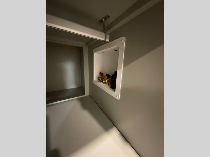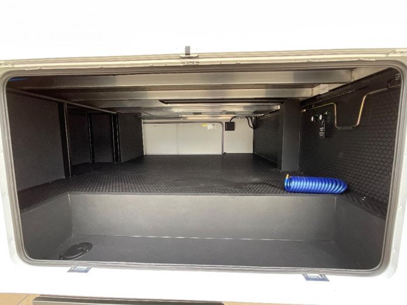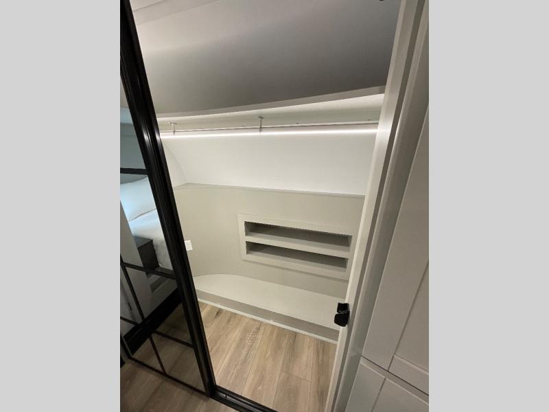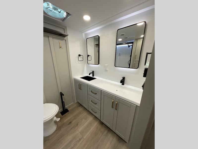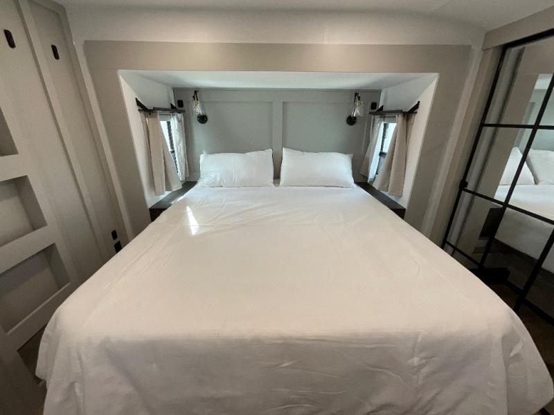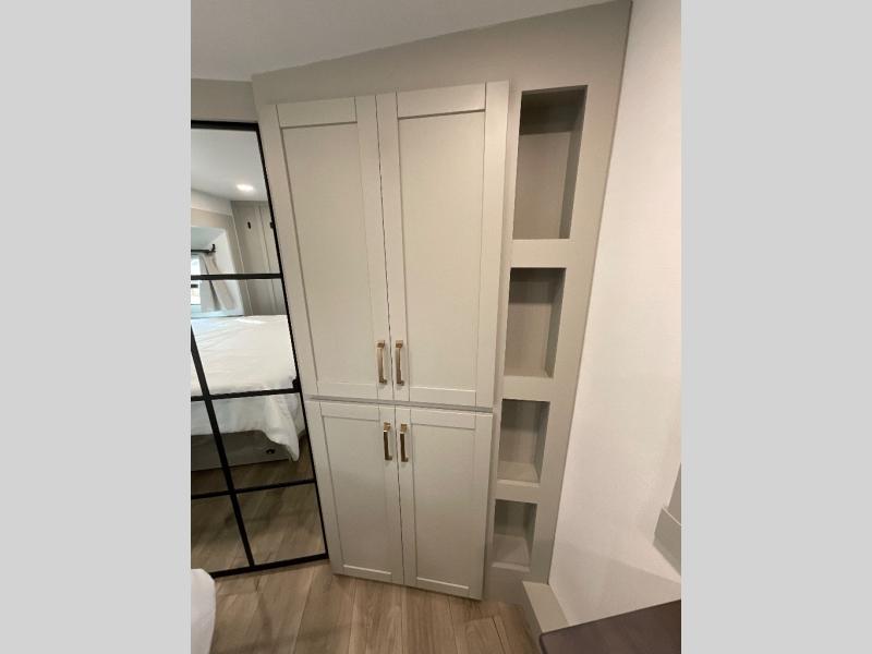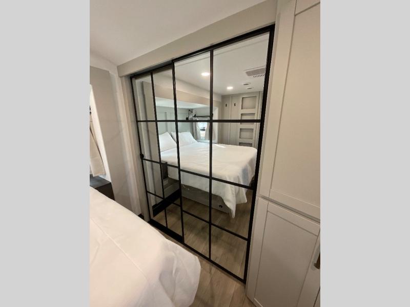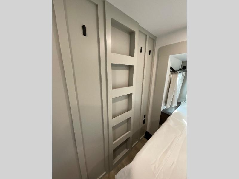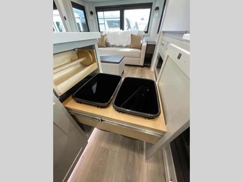 This unit is perfect for weekends at the campground or extended stays! There is ample seating with a sliding desk/dining table, 62" theater seating, and a 72" tri-fold sofa along the rear wall. You can easily relax and enjoy the telescoping TV with a cozy fireplace below. The kitchen offers all that you need to prepare and cook meals just like home with a 16-cu. ft. refrigerator for your perishables, a 30" residential microwave oven, and three burner range top and oven. You will love the kitchen island all outfitted with pull-out pet bowls and double pull-out trash bins with an integrated Stow & Go paper towel holder. There is also an 84" pantry with adjustable shelves for all of your canned and dry goods. Head up the steps to a find a full bath and a private bedroom with a king bed slide all the way up front. A sliding dresser top features hidden storage which is perfect for jewelry and other personal belongings. The front wardrobe features mirrored doors, and the corner closet has been prepped for a stackable washer and dryer if you choose to add that option.
