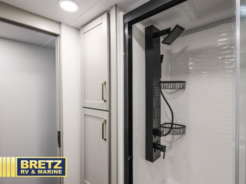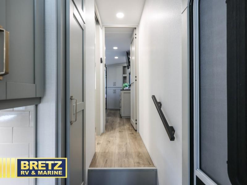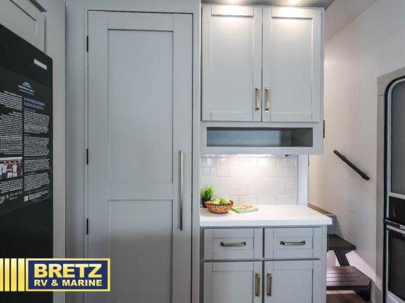 This unit is perfect for weekends at the campground or extended stays! There is ample seating with a sliding desk/dining table, 62" theater seating, and a 72" tri-fold sofa along the rear wall. You can easily relax and enjoy the telescoping TV with a cozy fireplace below. The kitchen offers all that you need to prepare and cook meals just like home with a 16-cu. ft. refrigerator for your perishables, a 30" residential microwave oven, and three burner range top and oven. You will love the kitchen island all outfitted with pull-out pet bowls and double pull-out trash bins with an integrated Stow & Go paper towel holder. There is also an 84" pantry with adjustable shelves for all of your canned and dry goods. Head up the steps to a find a full bath and a private bedroom with a king bed slide all the way up front. A sliding dresser top features hidden storage which is perfect for jewelry and other personal belongings. The front wardrobe features mirrored doors, and the corner closet has been prepped for a stackable washer and dryer if you choose to add that option.