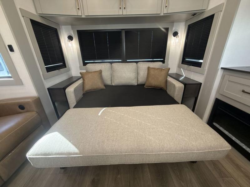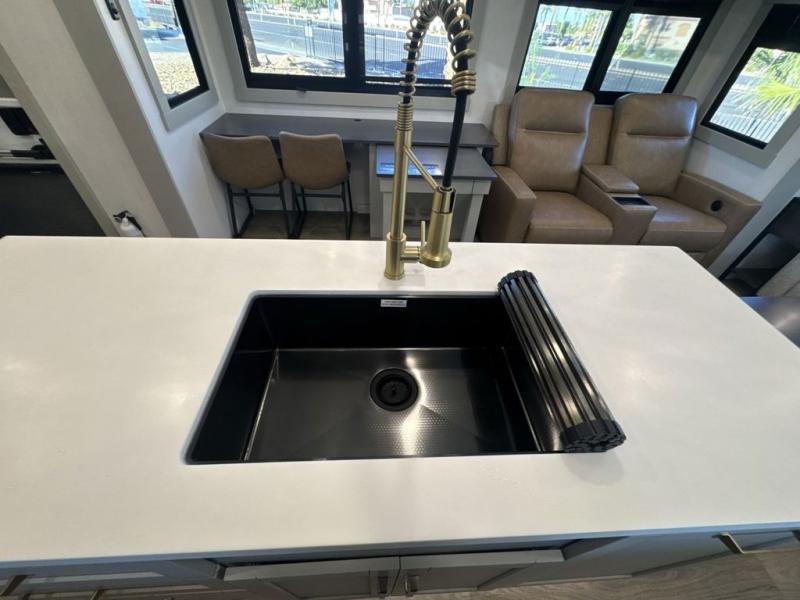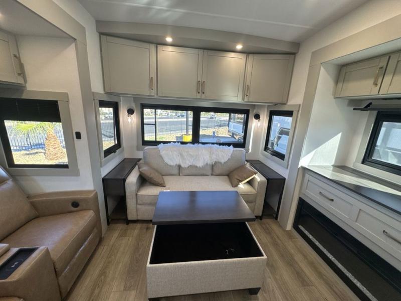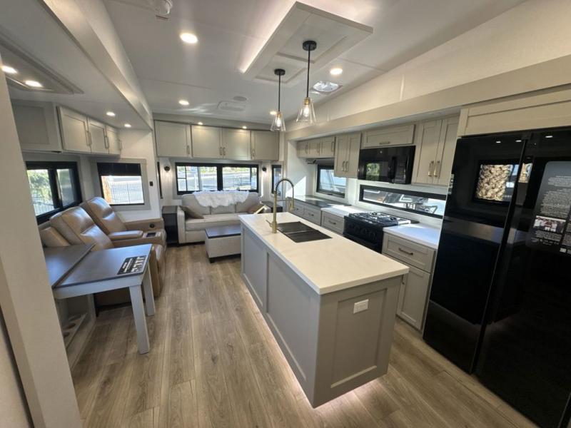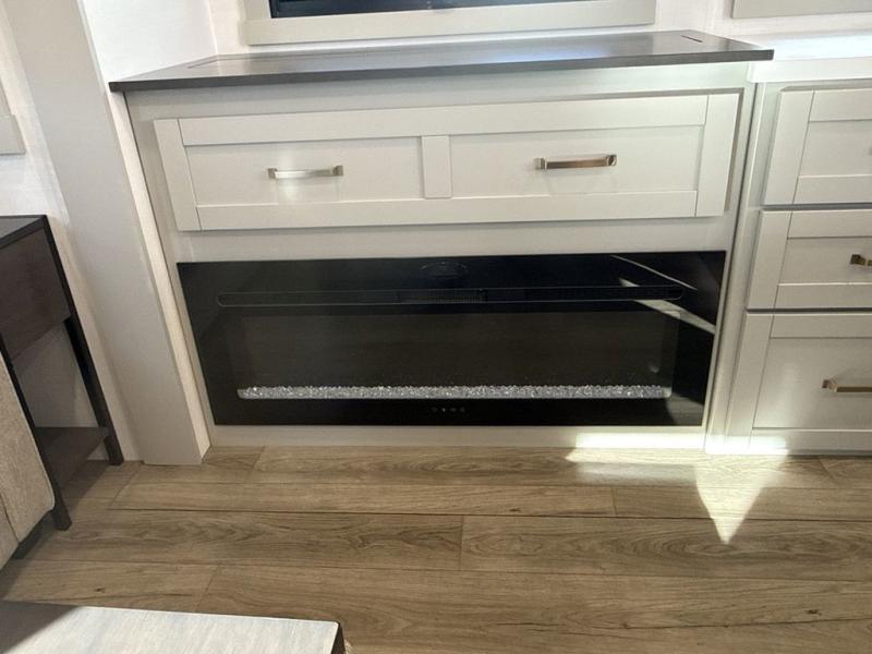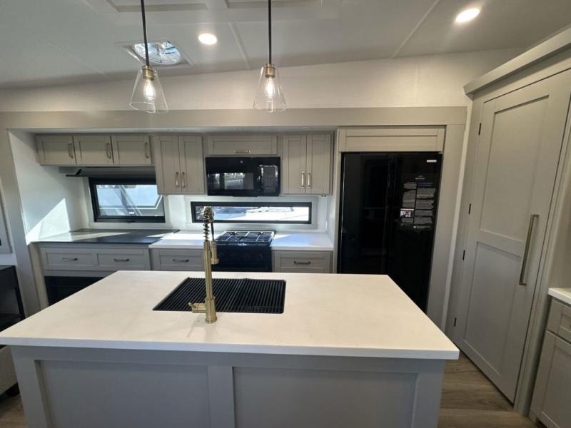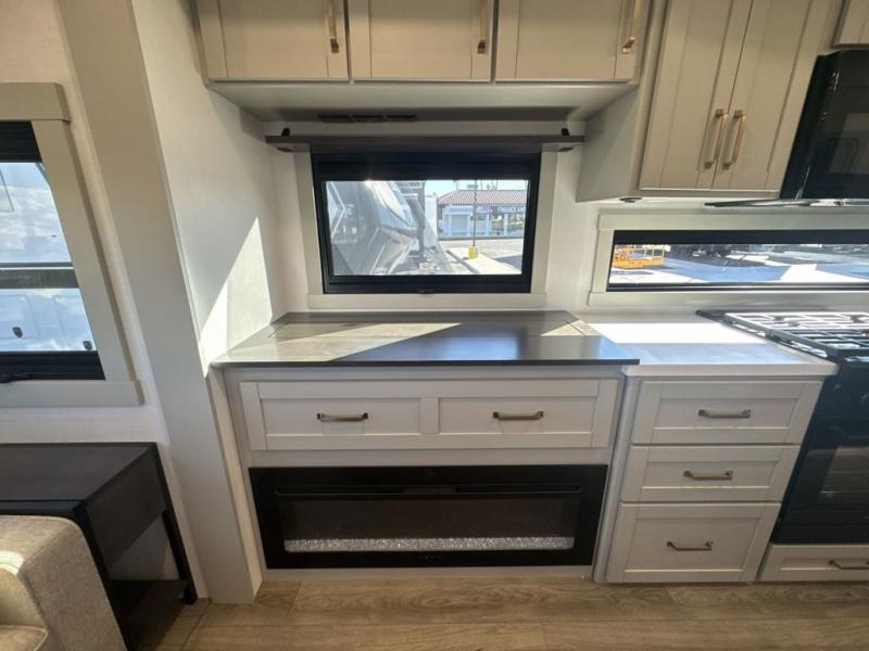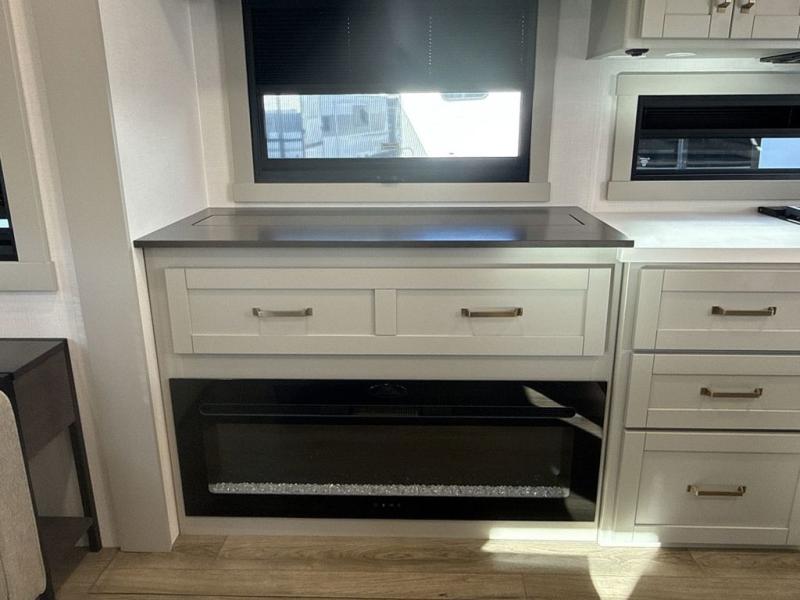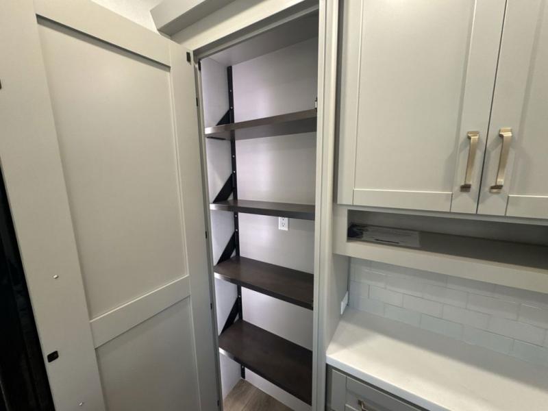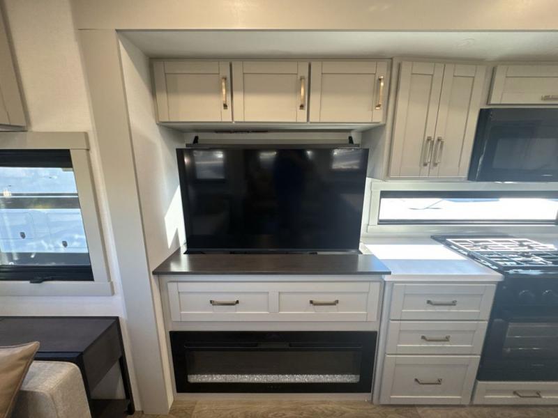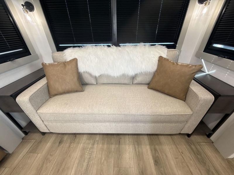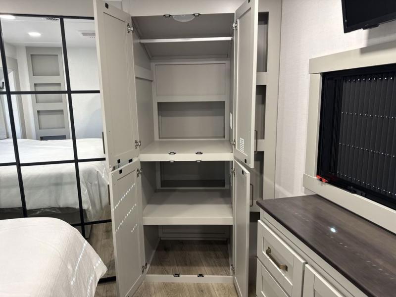 This unit is perfect for weekends at the campground or extended stays! There is ample seating with a sliding desk/dining table, 62" theater seating, and a 72" tri-fold sofa along the rear wall. You can easily relax and enjoy the telescoping TV with a cozy fireplace below. The kitchen offers all that you need to prepare and cook meals just like home with a 16-cu. ft. refrigerator for your perishables, a 30" residential microwave oven, and three burner range top and oven. You will love the kitchen island all outfitted with pull-out pet bowls and double pull-out trash bins with an integrated Stow & Go paper towel holder. There is also an 84" pantry with adjustable shelves for all of your canned and dry goods. Head up the steps to a find a full bath and a private bedroom with a king bed slide all the way up front. A sliding dresser top features hidden storage which is perfect for jewelry and other personal belongings. The front wardrobe features mirrored doors, and the corner closet has been prepped for a stackable washer and dryer if you choose to add that option.