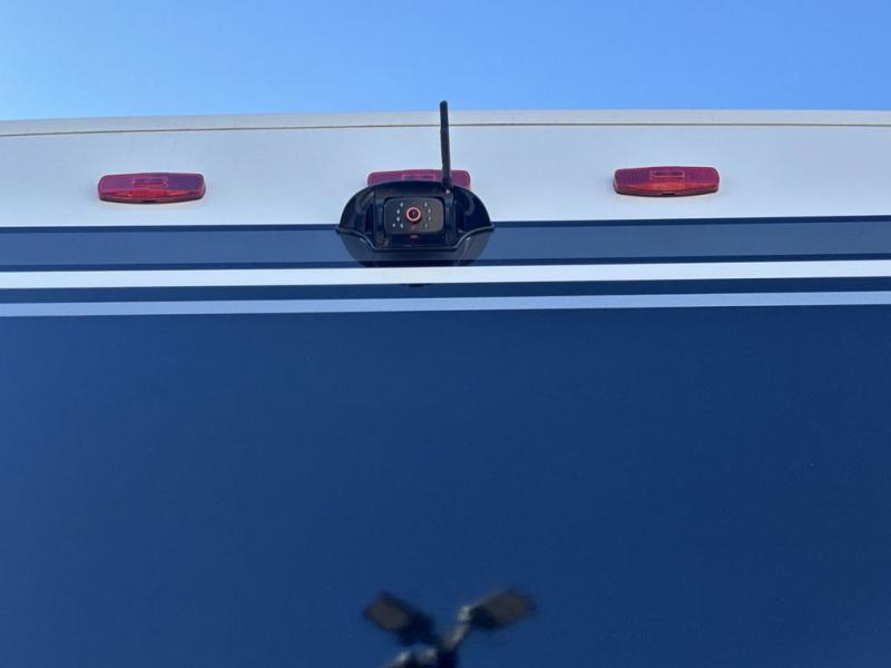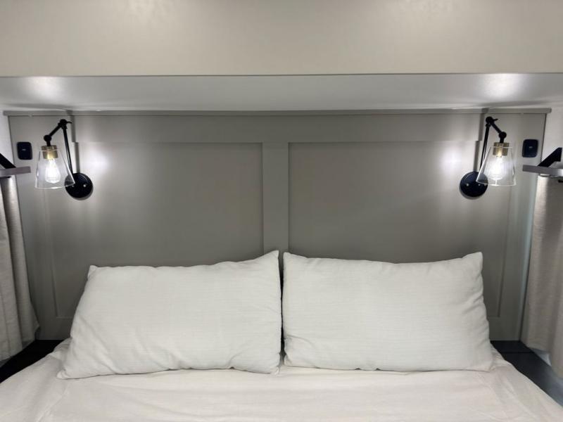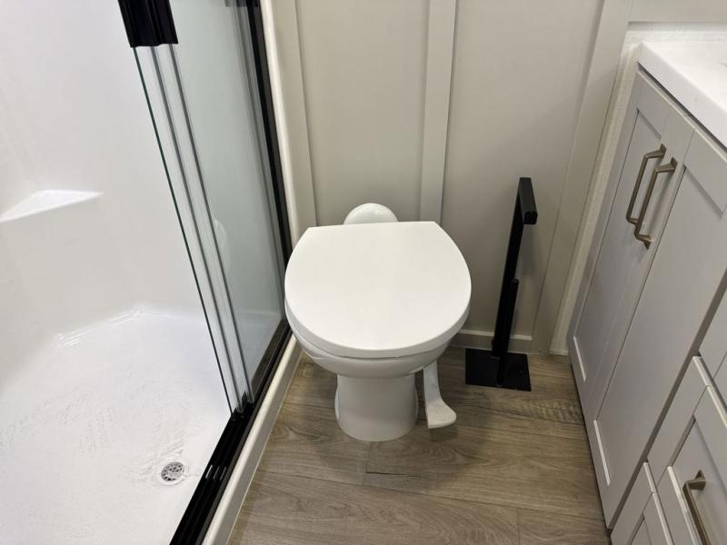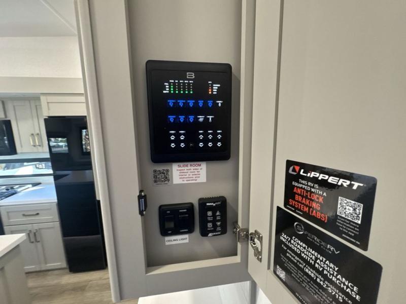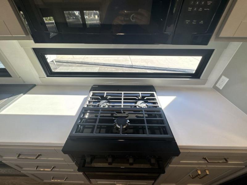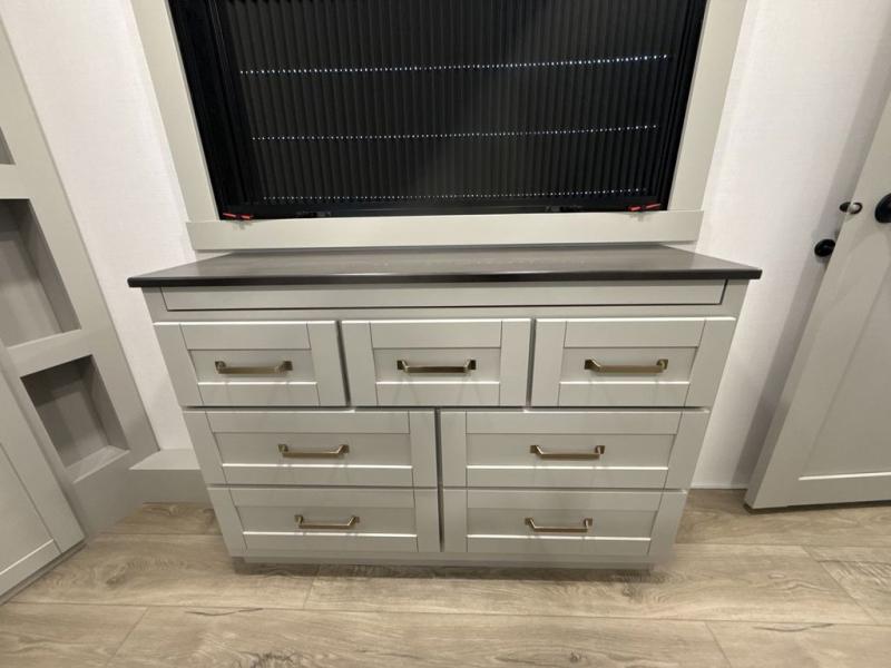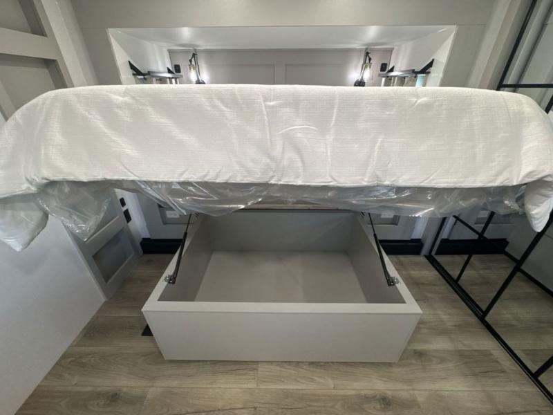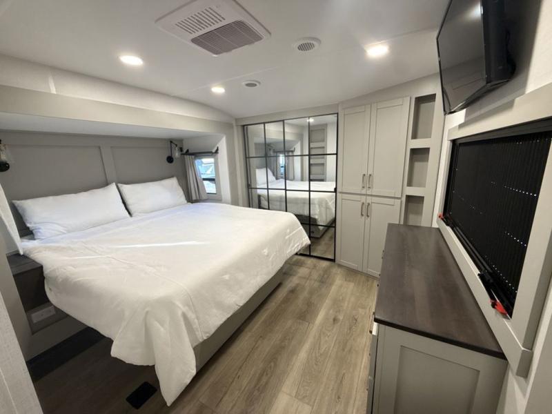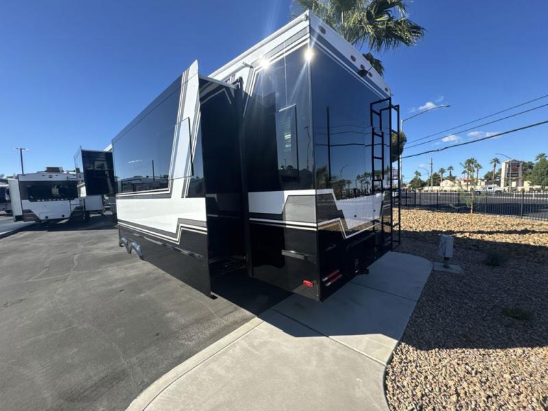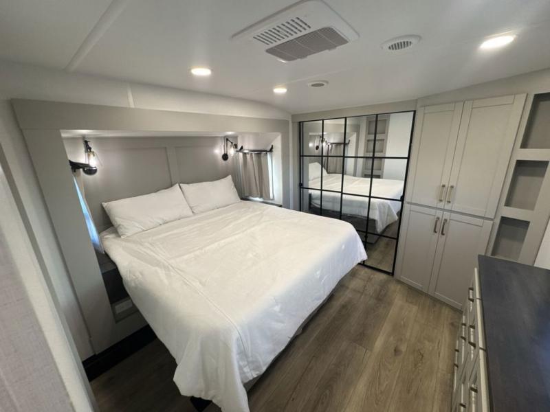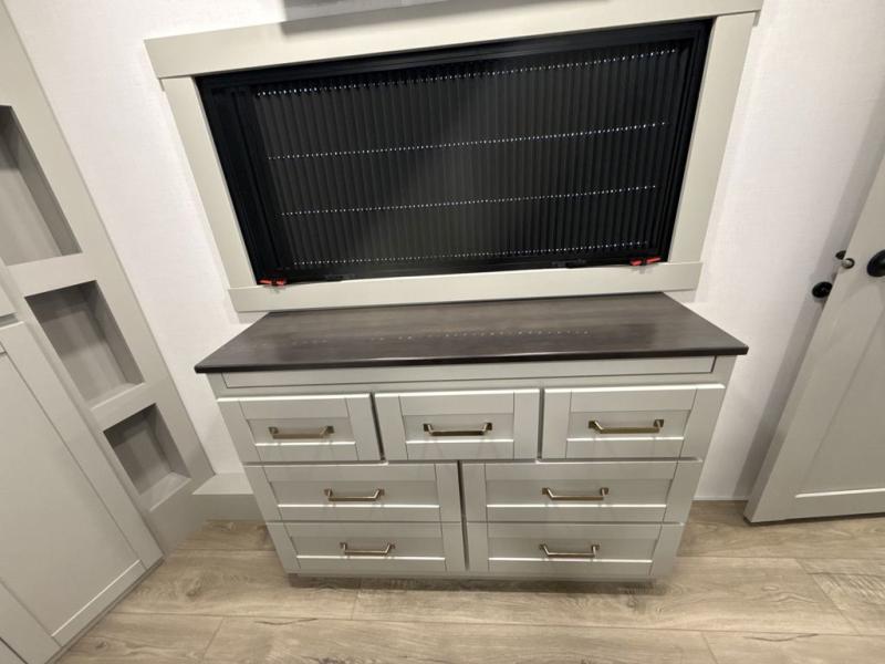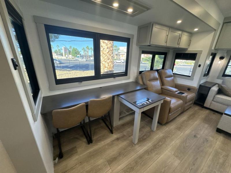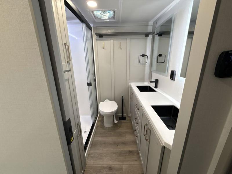 This unit is perfect for weekends at the campground or extended stays! There is ample seating with a sliding desk/dining table, 62" theater seating, and a 72" tri-fold sofa along the rear wall. You can easily relax and enjoy the telescoping TV with a cozy fireplace below. The kitchen offers all that you need to prepare and cook meals just like home with a 16-cu. ft. refrigerator for your perishables, a 30" residential microwave oven, and three burner range top and oven. You will love the kitchen island all outfitted with pull-out pet bowls and double pull-out trash bins with an integrated Stow & Go paper towel holder. There is also an 84" pantry with adjustable shelves for all of your canned and dry goods. Head up the steps to a find a full bath and a private bedroom with a king bed slide all the way up front. A sliding dresser top features hidden storage which is perfect for jewelry and other personal belongings. The front wardrobe features mirrored doors, and the corner closet has been prepped for a stackable washer and dryer if you choose to add that option.