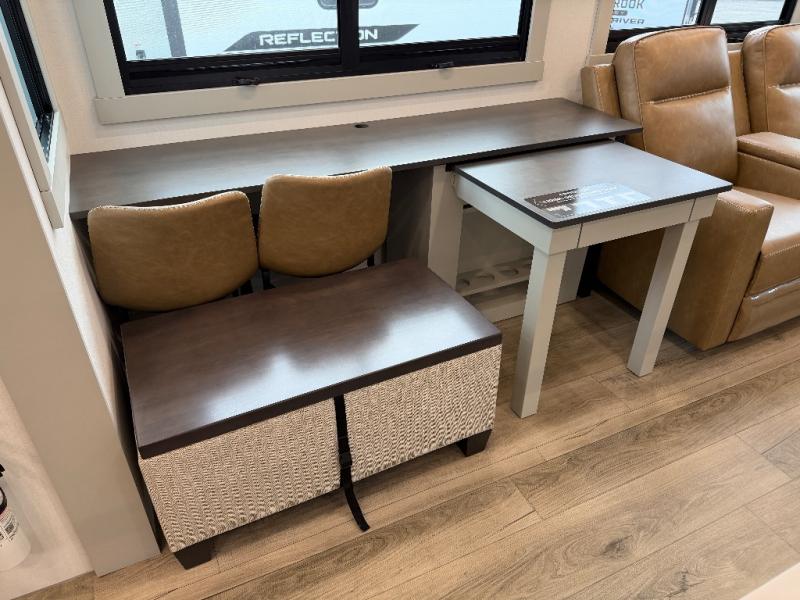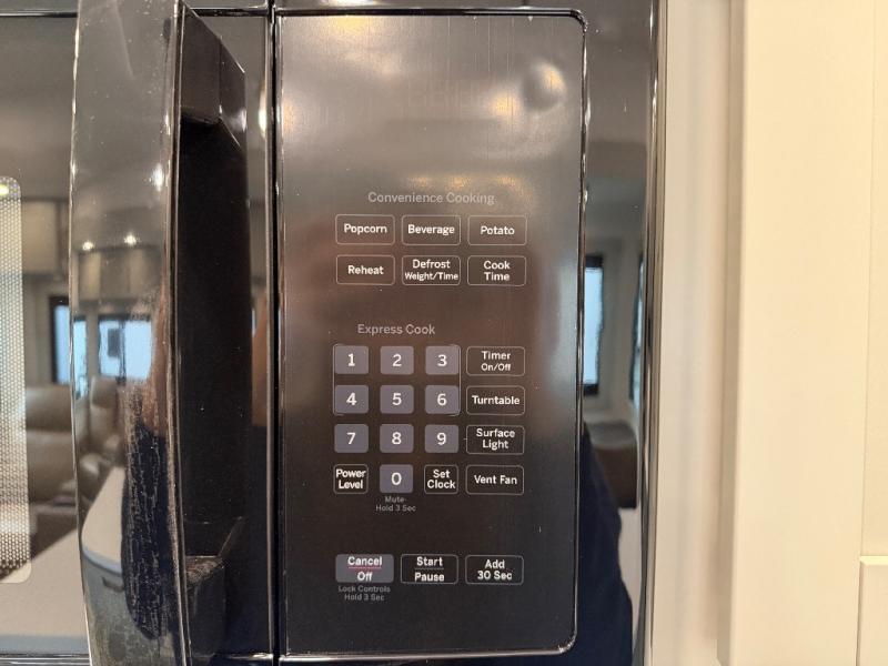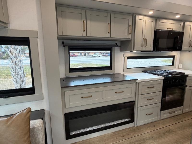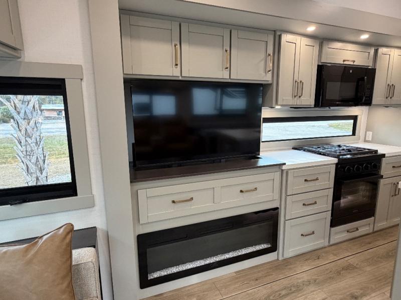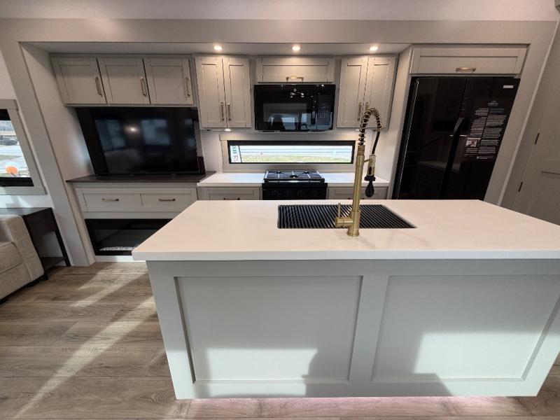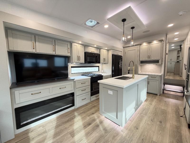 This unit is perfect for weekends at the campground or extended stays! There is ample seating with a sliding desk/dining table, 62" theater seating, and a 72" tri-fold sofa along the rear wall. You can easily relax and enjoy the telescoping TV with a cozy fireplace below. The kitchen offers all that you need to prepare and cook meals just like home with a 16-cu. ft. refrigerator for your perishables, a 30" residential microwave oven, and three burner range top and oven. You will love the kitchen island all outfitted with pull-out pet bowls and double pull-out trash bins with an integrated Stow & Go paper towel holder. There is also an 84" pantry with adjustable shelves for all of your canned and dry goods. Head up the steps to a find a full bath and a private bedroom with a king bed slide all the way up front. A sliding dresser top features hidden storage which is perfect for jewelry and other personal belongings. The front wardrobe features mirrored doors, and the corner closet has been prepped for a stackable washer and dryer if you choose to add that option.