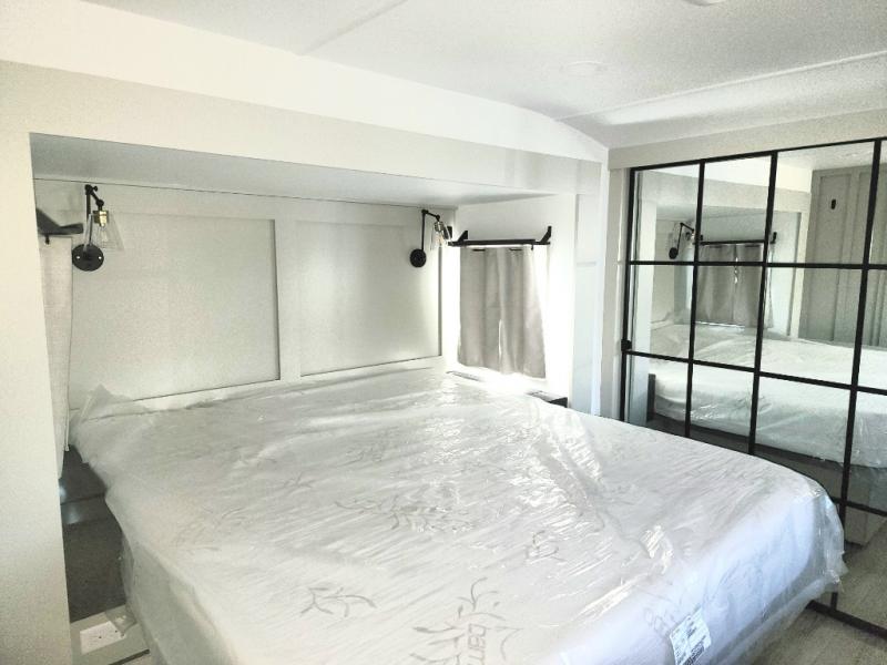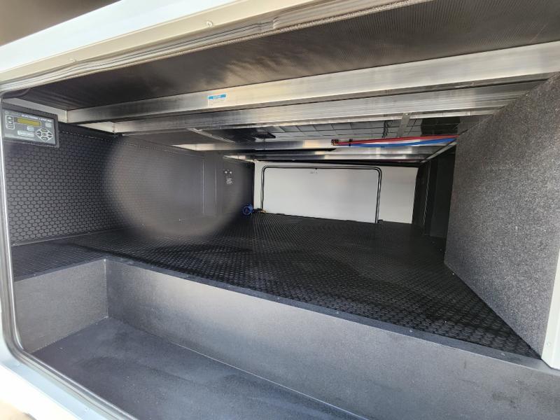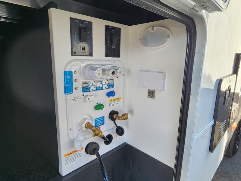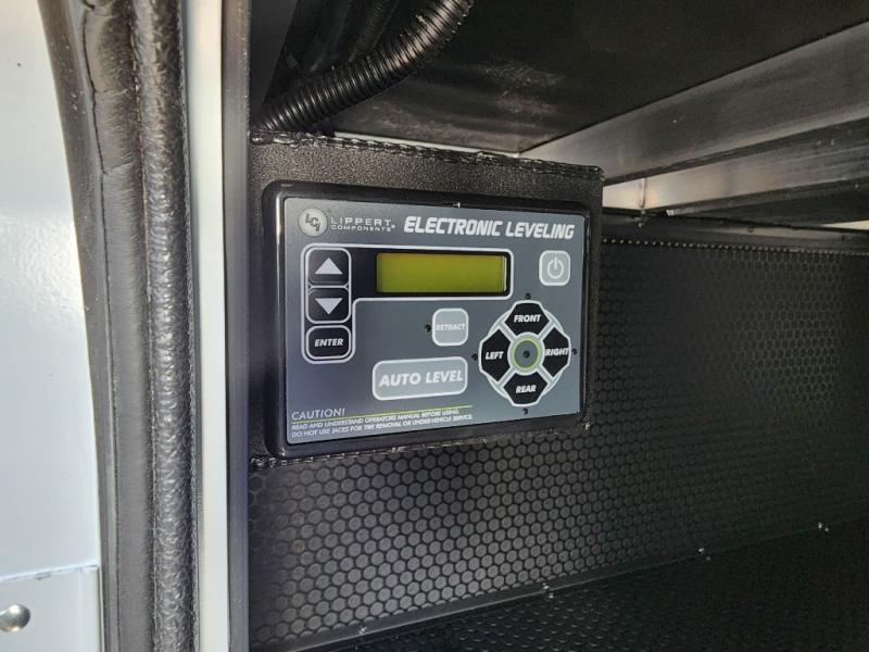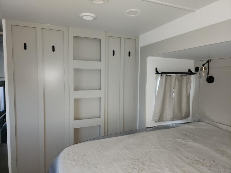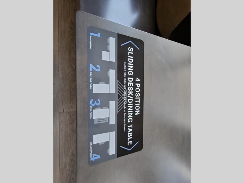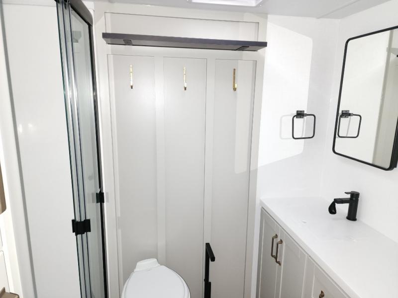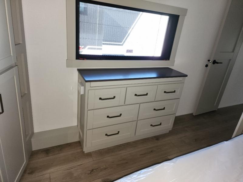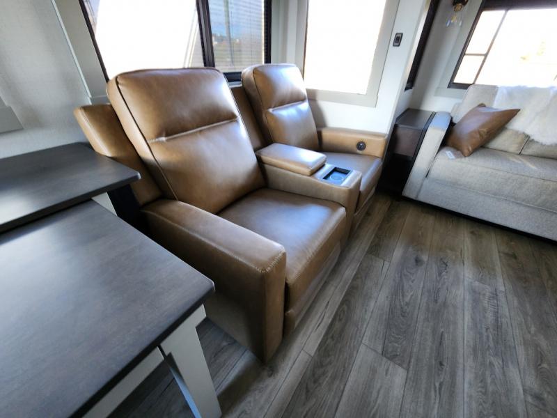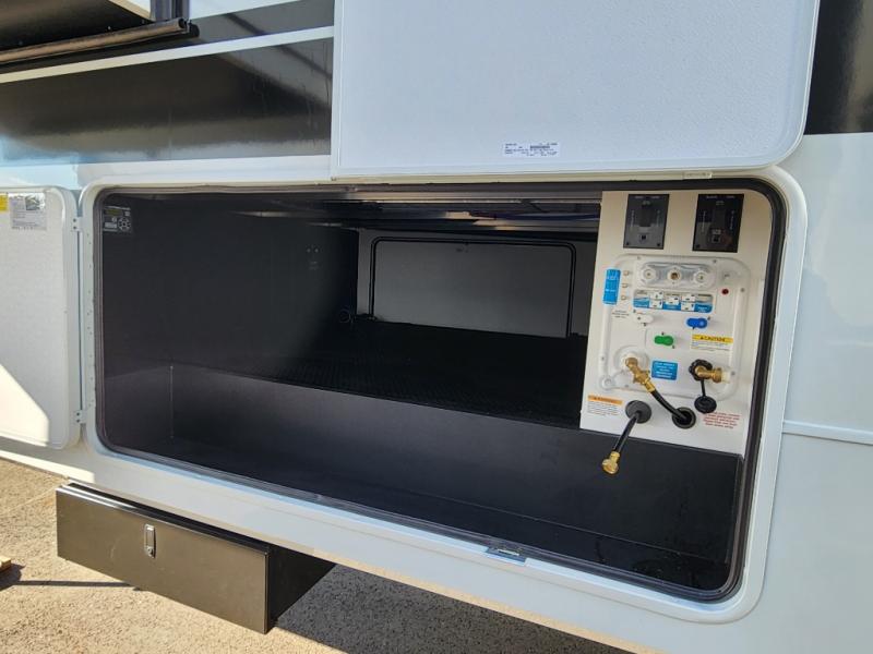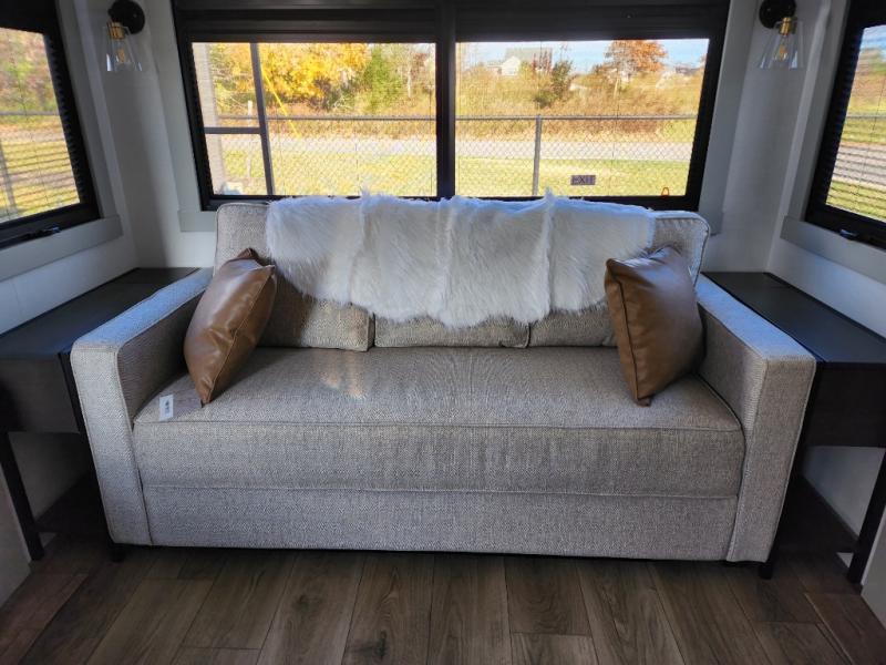 This unit is perfect for weekends at the campground or extended stays! There is ample seating with a sliding desk/dining table, 62" theater seating, and a 72" tri-fold sofa along the rear wall. You can easily relax and enjoy the telescoping TV with a cozy fireplace below. The kitchen offers all that you need to prepare and cook meals just like home with a 16-cu. ft. refrigerator for your perishables, a 30" residential microwave oven, and three burner range top and oven. You will love the kitchen island all outfitted with pull-out pet bowls and double pull-out trash bins with an integrated Stow & Go paper towel holder. There is also an 84" pantry with adjustable shelves for all of your canned and dry goods. Head up the steps to a find a full bath and a private bedroom with a king bed slide all the way up front. A sliding dresser top features hidden storage which is perfect for jewelry and other personal belongings. The front wardrobe features mirrored doors, and the corner closet has been prepped for a stackable washer and dryer if you choose to add that option.