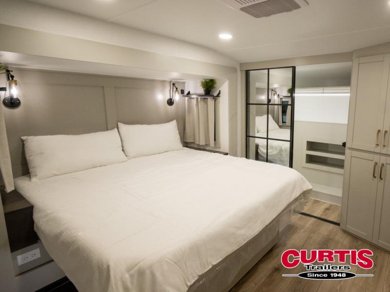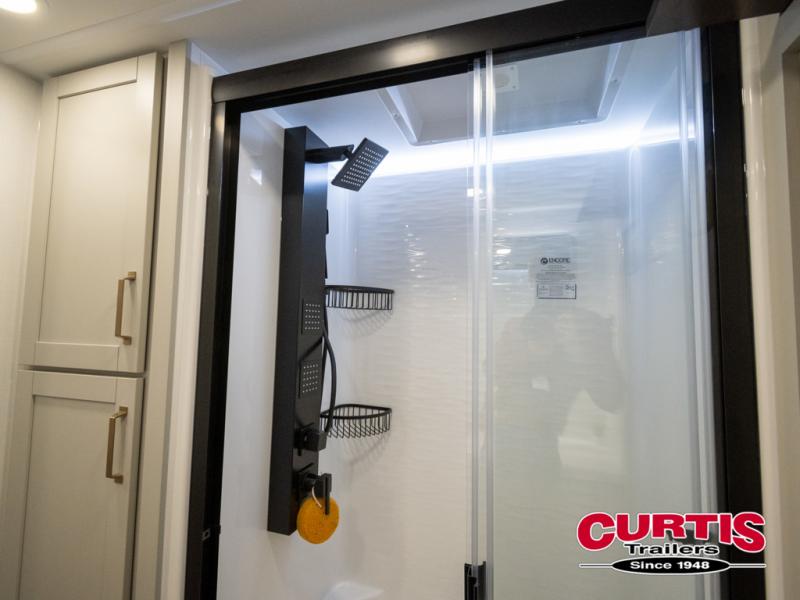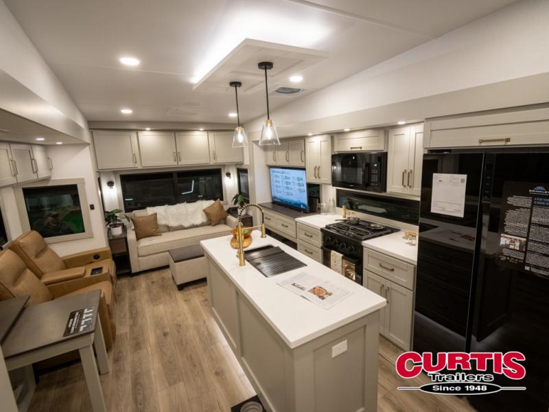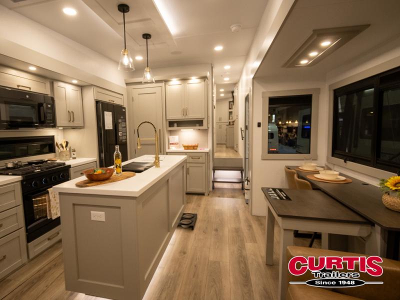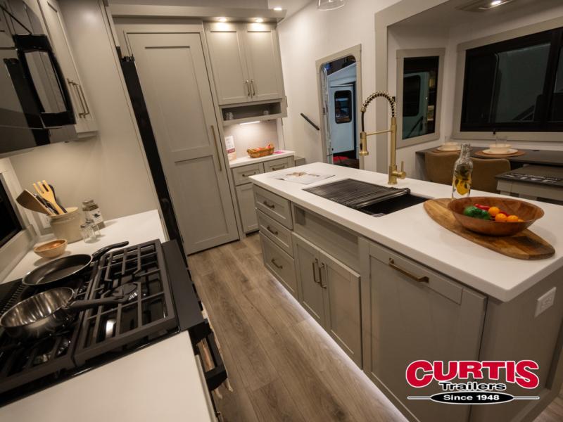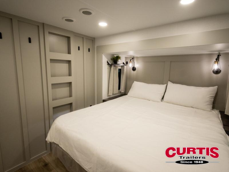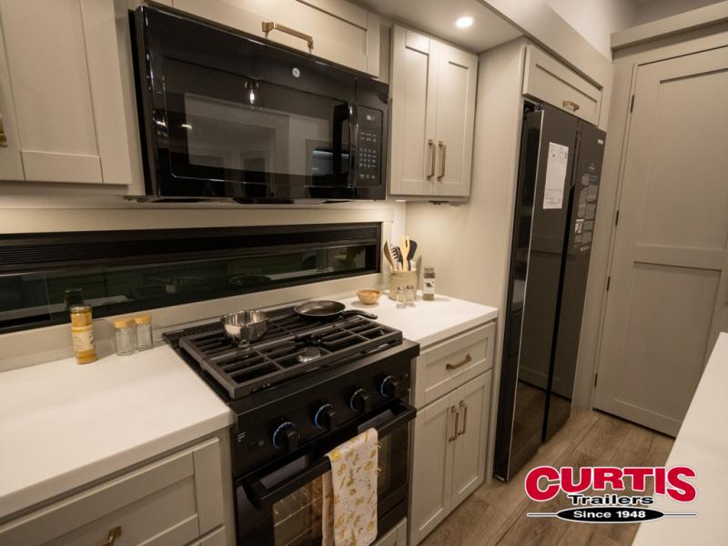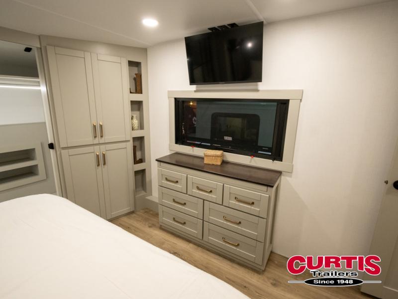 This unit is perfect for weekends at the campground or extended stays! There is ample seating with a sliding desk/dining table, 62" theater seating, and a 72" tri-fold sofa along the rear wall. You can easily relax and enjoy the telescoping TV with a cozy fireplace below. The kitchen offers all that you need to prepare and cook meals just like home with a 16-cu. ft. refrigerator for your perishables, a 30" residential microwave oven, and three burner range top and oven. You will love the kitchen island all outfitted with pull-out pet bowls and double pull-out trash bins with an integrated Stow & Go paper towel holder. There is also an 84" pantry with adjustable shelves for all of your canned and dry goods. Head up the steps to a find a full bath and a private bedroom with a king bed slide all the way up front. A sliding dresser top features hidden storage which is perfect for jewelry and other personal belongings. The front wardrobe features mirrored doors, and the corner closet has been prepped for a stackable washer and dryer if you choose to add that option.