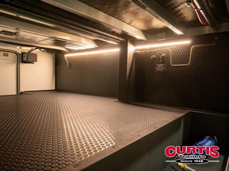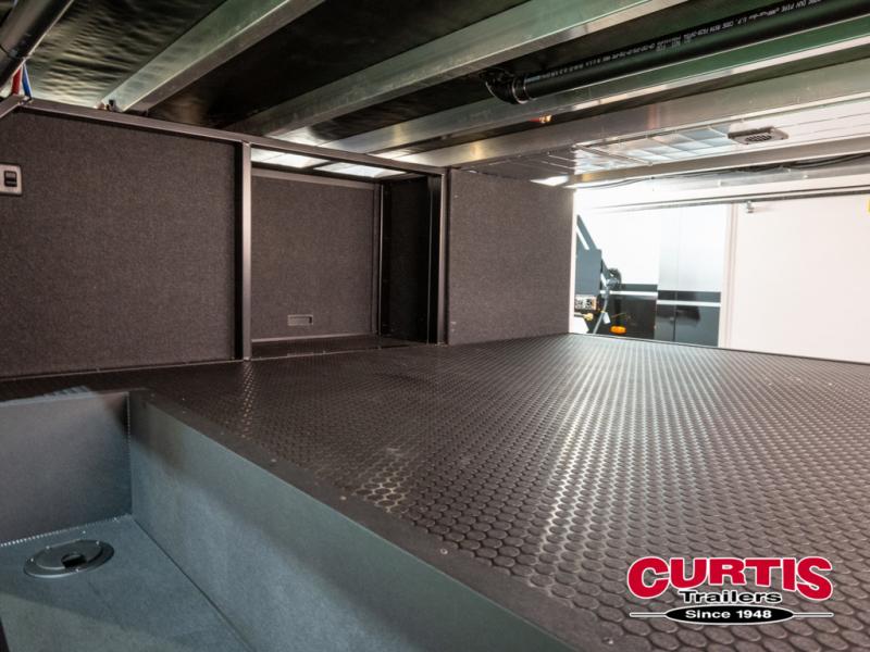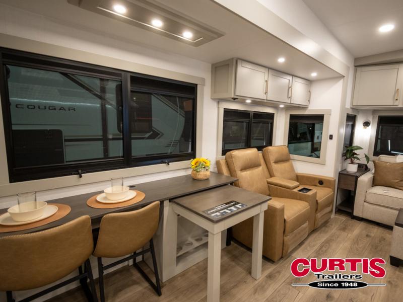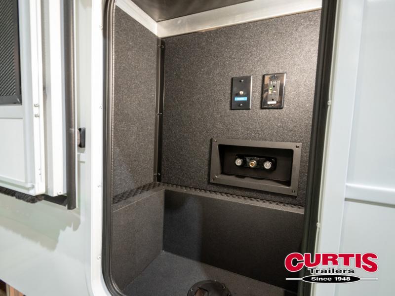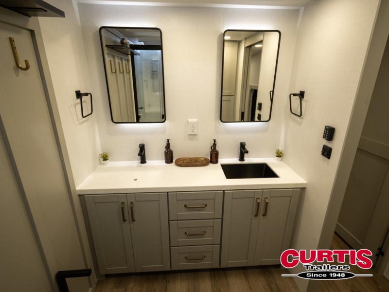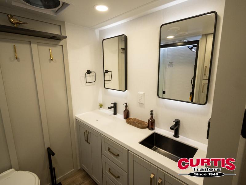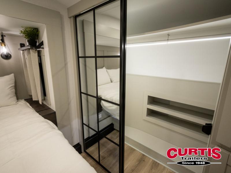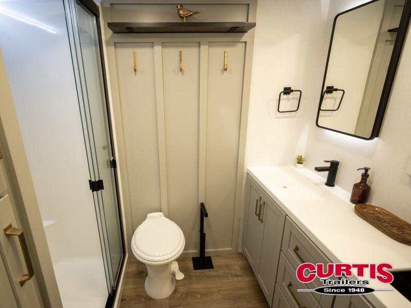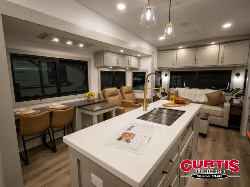 This unit is perfect for weekends at the campground or extended stays! There is ample seating with a sliding desk/dining table, 62" theater seating, and a 72" tri-fold sofa along the rear wall. You can easily relax and enjoy the telescoping TV with a cozy fireplace below. The kitchen offers all that you need to prepare and cook meals just like home with a 16-cu. ft. refrigerator for your perishables, a 30" residential microwave oven, and three burner range top and oven. You will love the kitchen island all outfitted with pull-out pet bowls and double pull-out trash bins with an integrated Stow & Go paper towel holder. There is also an 84" pantry with adjustable shelves for all of your canned and dry goods. Head up the steps to a find a full bath and a private bedroom with a king bed slide all the way up front. A sliding dresser top features hidden storage which is perfect for jewelry and other personal belongings. The front wardrobe features mirrored doors, and the corner closet has been prepped for a stackable washer and dryer if you choose to add that option.