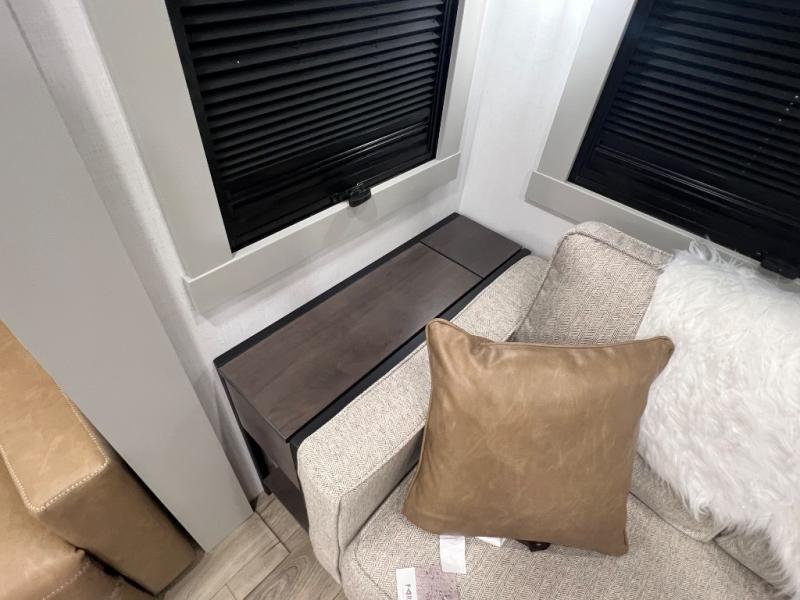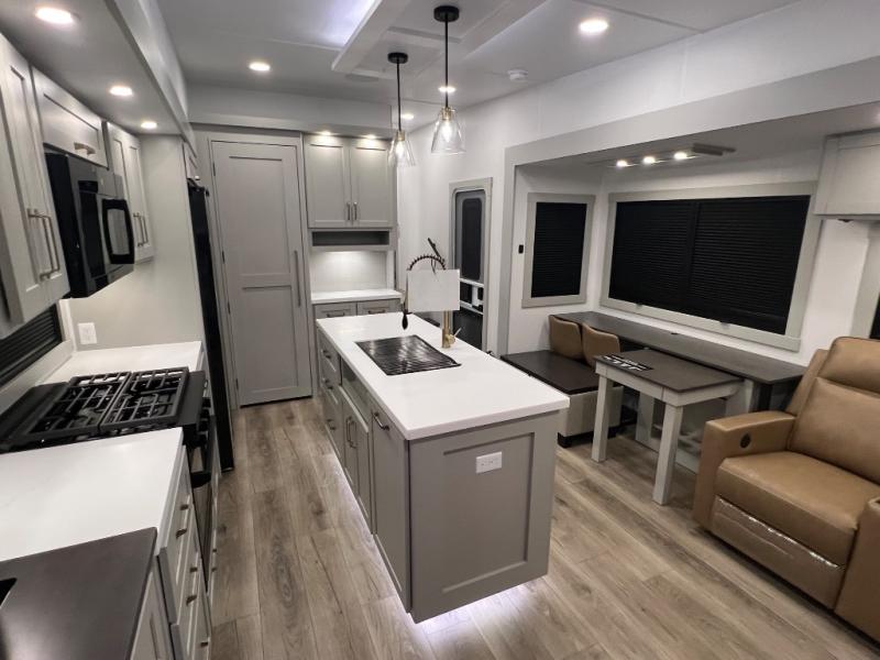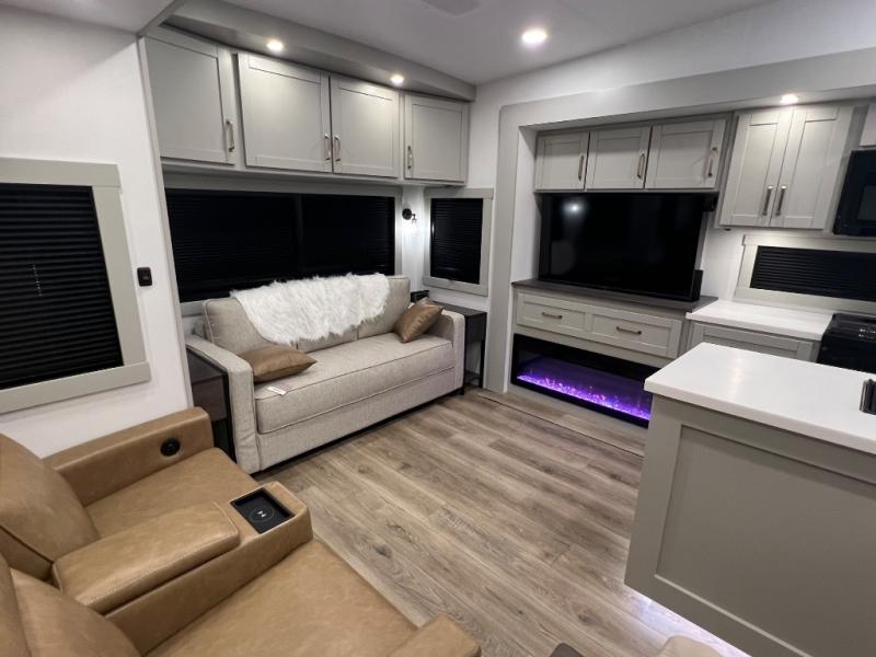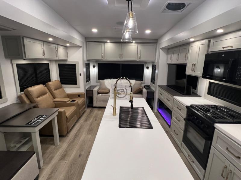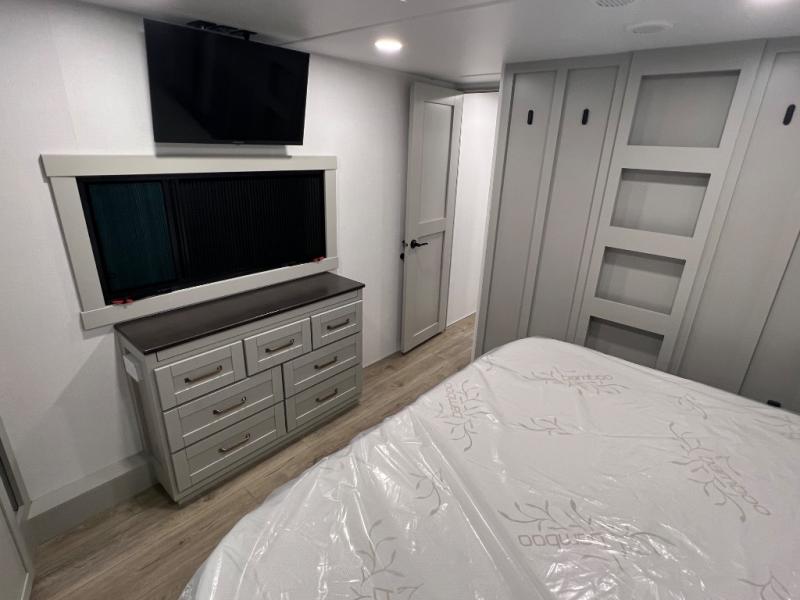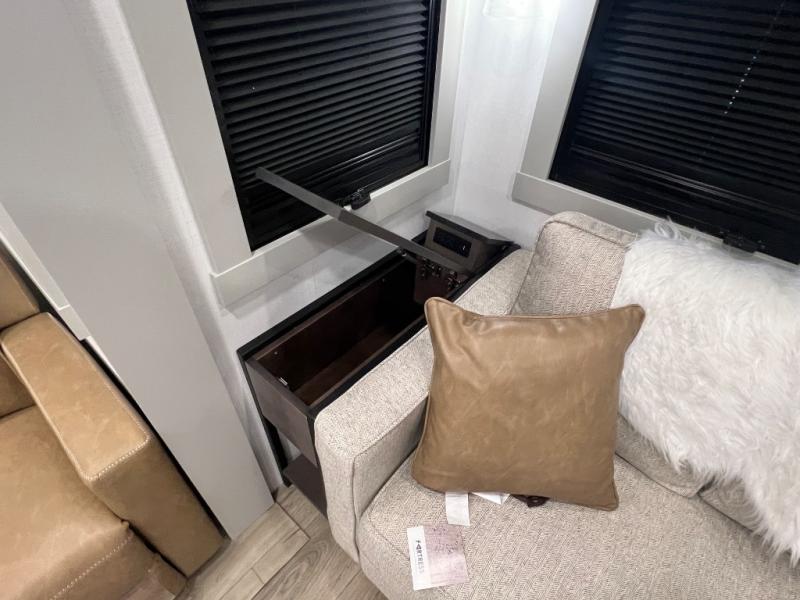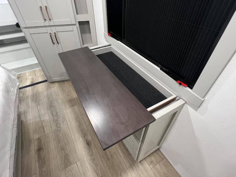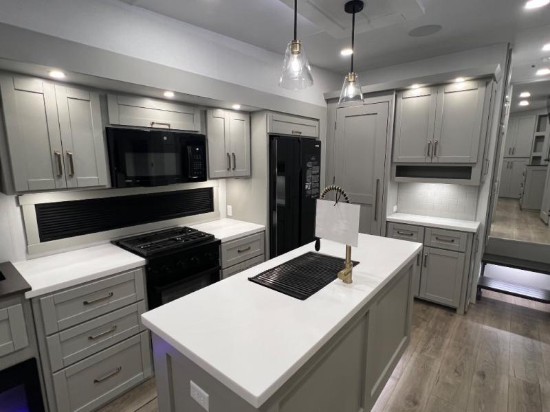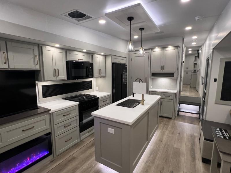 This unit is perfect for weekends at the campground or extended stays! There is ample seating with a sliding desk/dining table, 62" theater seating, and a 72" tri-fold sofa along the rear wall. You can easily relax and enjoy the telescoping TV with a cozy fireplace below. The kitchen offers all that you need to prepare and cook meals just like home with a 16-cu. ft. refrigerator for your perishables, a 30" residential microwave oven, and three burner range top and oven. You will love the kitchen island all outfitted with pull-out pet bowls and double pull-out trash bins with an integrated Stow & Go paper towel holder. There is also an 84" pantry with adjustable shelves for all of your canned and dry goods. Head up the steps to a find a full bath and a private bedroom with a king bed slide all the way up front. A sliding dresser top features hidden storage which is perfect for jewelry and other personal belongings. The front wardrobe features mirrored doors, and the corner closet has been prepped for a stackable washer and dryer if you choose to add that option.