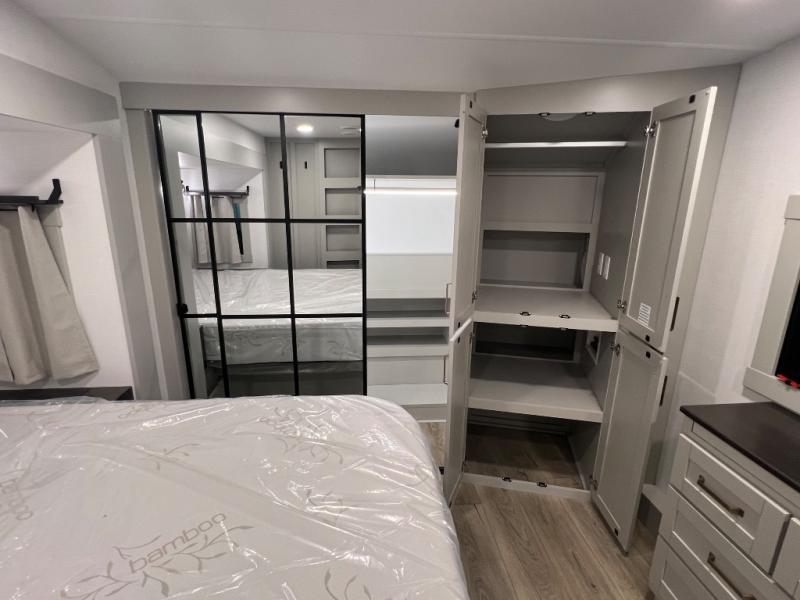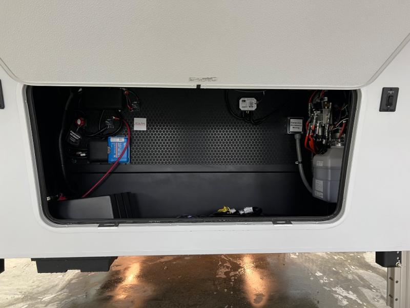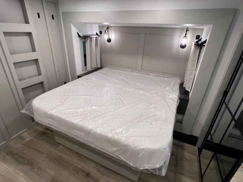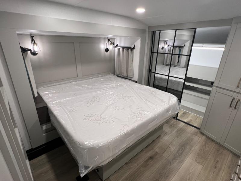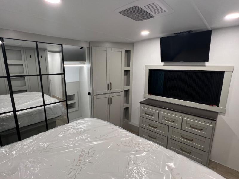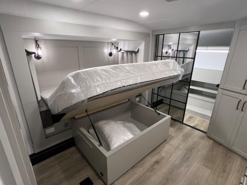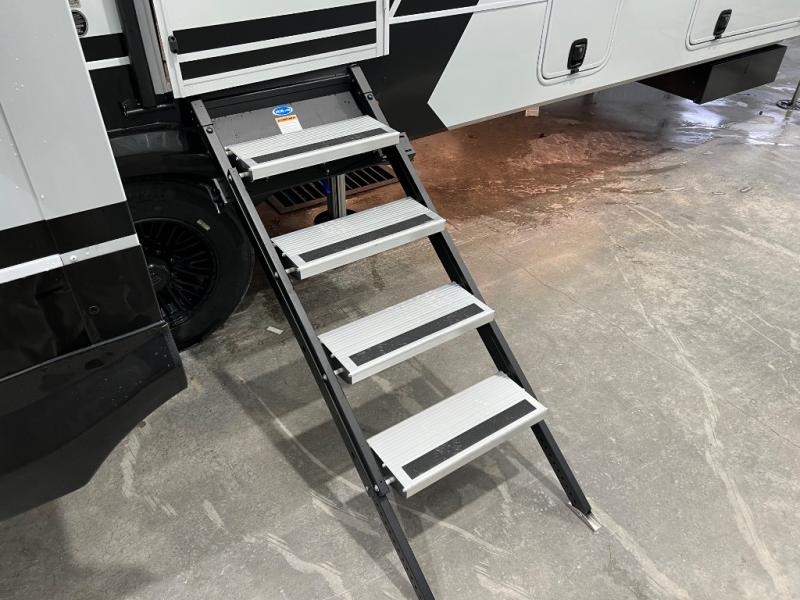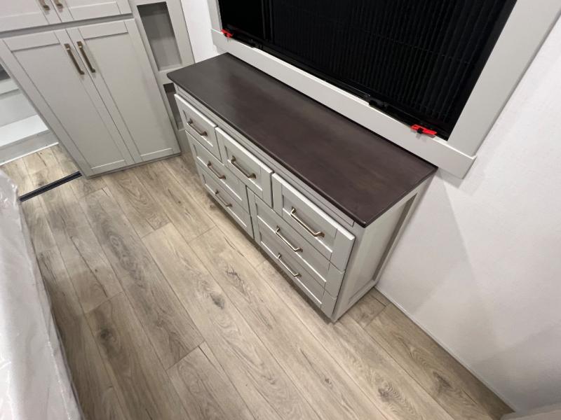 This unit is perfect for weekends at the campground or extended stays! There is ample seating with a sliding desk/dining table, 62" theater seating, and a 72" tri-fold sofa along the rear wall. You can easily relax and enjoy the telescoping TV with a cozy fireplace below. The kitchen offers all that you need to prepare and cook meals just like home with a 16-cu. ft. refrigerator for your perishables, a 30" residential microwave oven, and three burner range top and oven. You will love the kitchen island all outfitted with pull-out pet bowls and double pull-out trash bins with an integrated Stow & Go paper towel holder. There is also an 84" pantry with adjustable shelves for all of your canned and dry goods. Head up the steps to a find a full bath and a private bedroom with a king bed slide all the way up front. A sliding dresser top features hidden storage which is perfect for jewelry and other personal belongings. The front wardrobe features mirrored doors, and the corner closet has been prepped for a stackable washer and dryer if you choose to add that option.