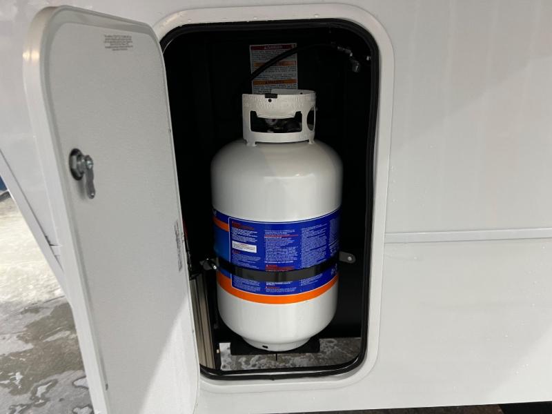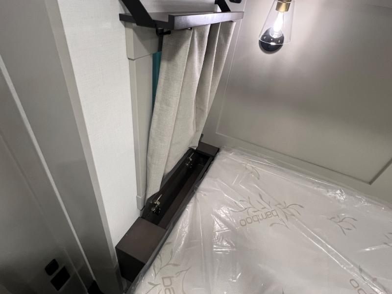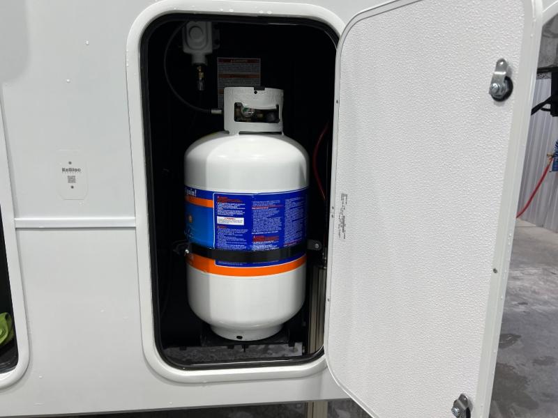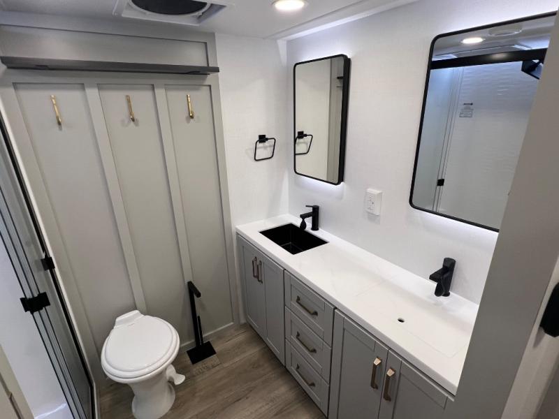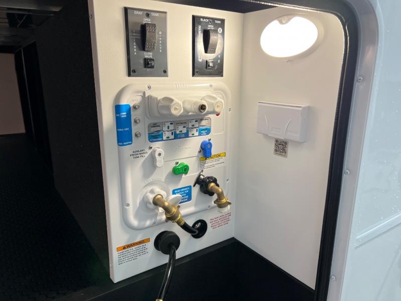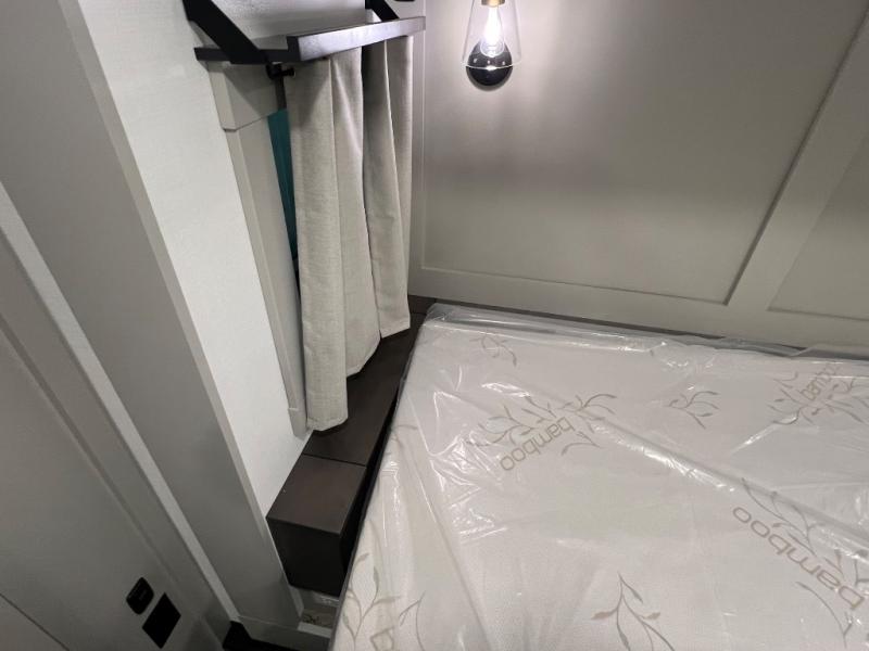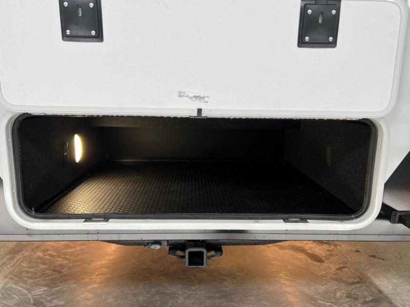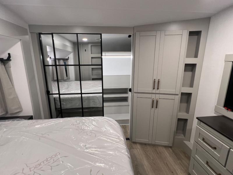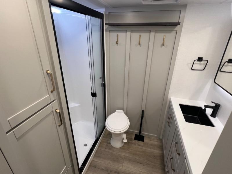 This unit is perfect for weekends at the campground or extended stays! There is ample seating with a sliding desk/dining table, 62" theater seating, and a 72" tri-fold sofa along the rear wall. You can easily relax and enjoy the telescoping TV with a cozy fireplace below. The kitchen offers all that you need to prepare and cook meals just like home with a 16-cu. ft. refrigerator for your perishables, a 30" residential microwave oven, and three burner range top and oven. You will love the kitchen island all outfitted with pull-out pet bowls and double pull-out trash bins with an integrated Stow & Go paper towel holder. There is also an 84" pantry with adjustable shelves for all of your canned and dry goods. Head up the steps to a find a full bath and a private bedroom with a king bed slide all the way up front. A sliding dresser top features hidden storage which is perfect for jewelry and other personal belongings. The front wardrobe features mirrored doors, and the corner closet has been prepped for a stackable washer and dryer if you choose to add that option.
