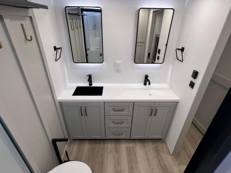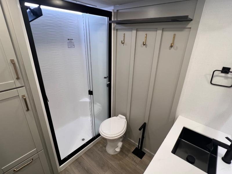 The Brinkley mid-profile Model Z fifth wheels bring you clean lines and an upscale look with plenty of style and exciting new features like the industry first brass plumbing connections. These units also feature an automotive grade front cap, plenty of exterior storage, dual exterior hot and cold showers, and wide stance leveling jacks for easy set up. Residential frameless windows provide a clean look and beautiful views, and ample electrical outlets and 6 USB/USB-C outlets allow all of your electronics and appliances to easily be used and charged.