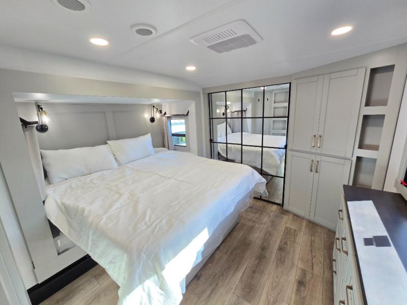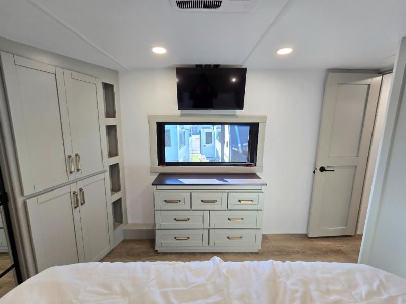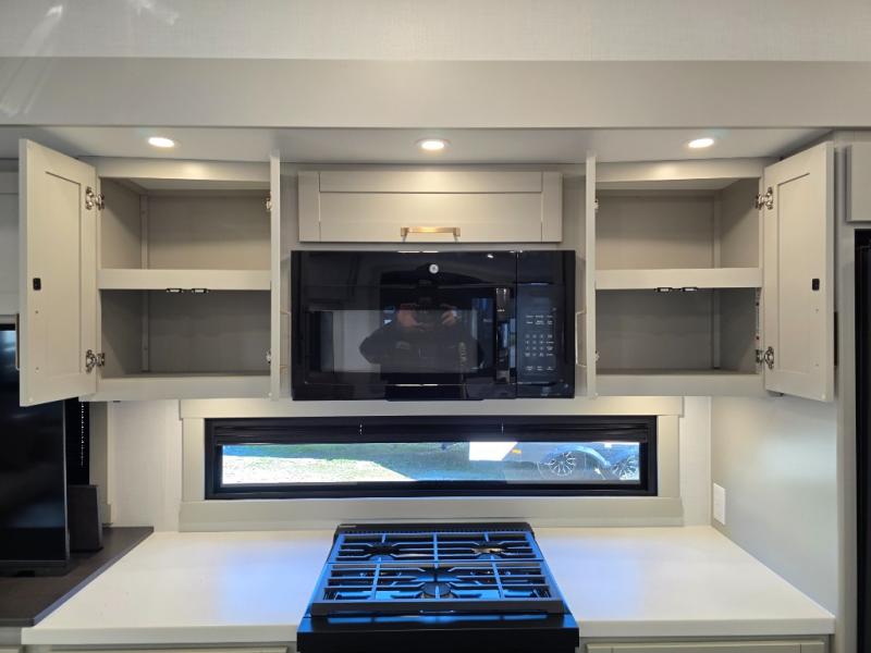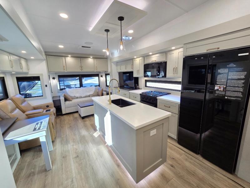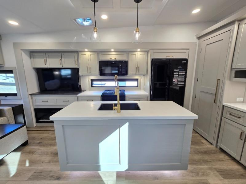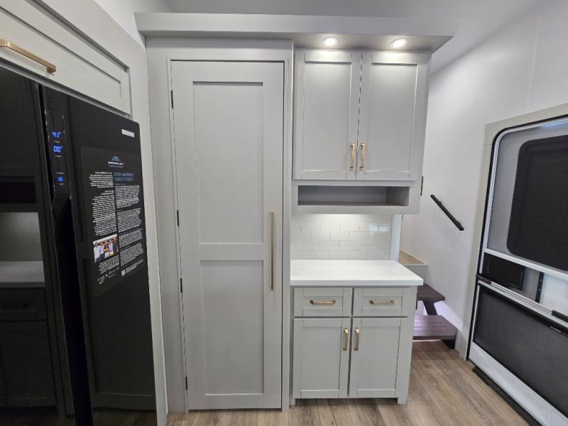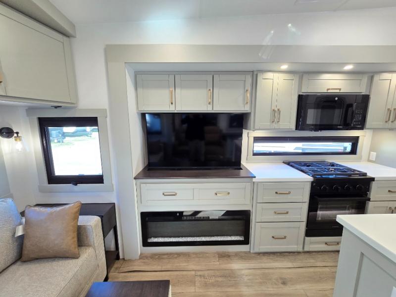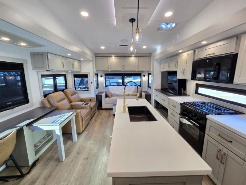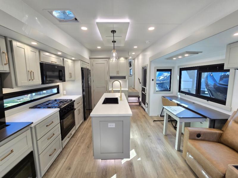 This unit is perfect for weekends at the campground or extended stays! There is ample seating with a sliding desk/dining table, 62" theater seating, and a 72" tri-fold sofa along the rear wall. You can easily relax and enjoy the telescoping TV with a cozy fireplace below. The kitchen offers all that you need to prepare and cook meals just like home with a 16-cu. ft. refrigerator for your perishables, a 30" residential microwave oven, and three burner range top and oven. You will love the kitchen island all outfitted with pull-out pet bowls and double pull-out trash bins with an integrated Stow & Go paper towel holder. There is also an 84" pantry with adjustable shelves for all of your canned and dry goods. Head up the steps to a find a full bath and a private bedroom with a king bed slide all the way up front. A sliding dresser top features hidden storage which is perfect for jewelry and other personal belongings. The front wardrobe features mirrored doors, and the corner closet has been prepped for a stackable washer and dryer if you choose to add that option.