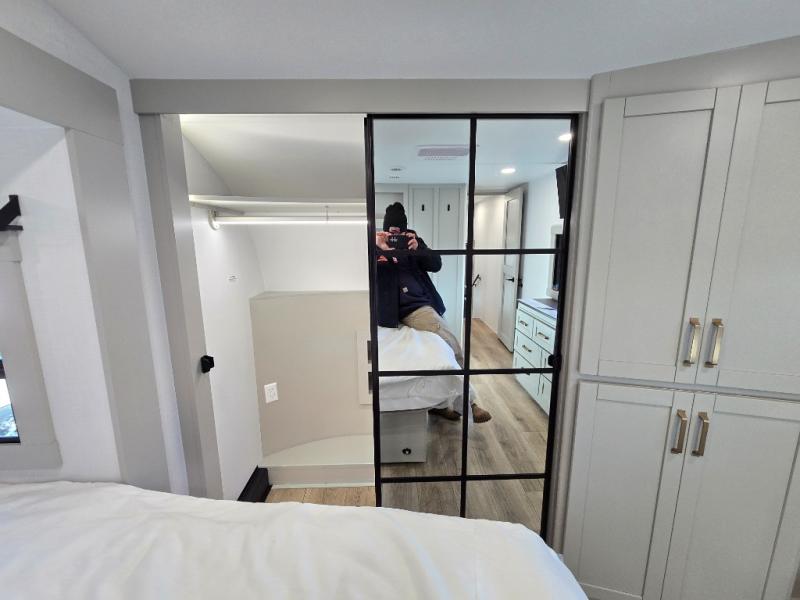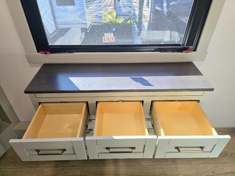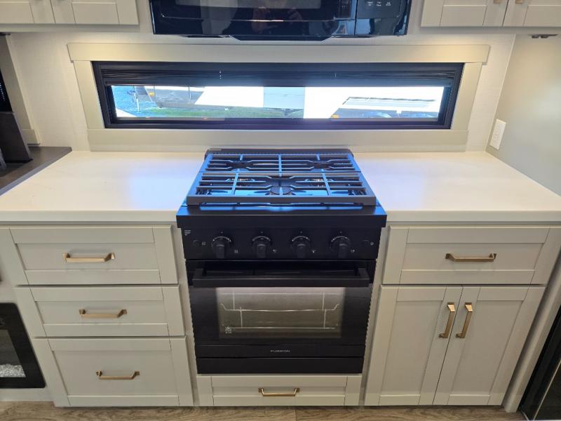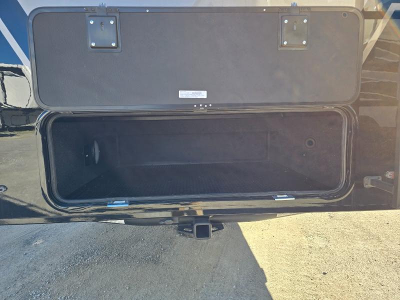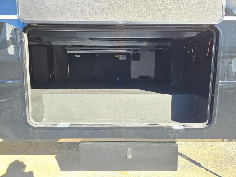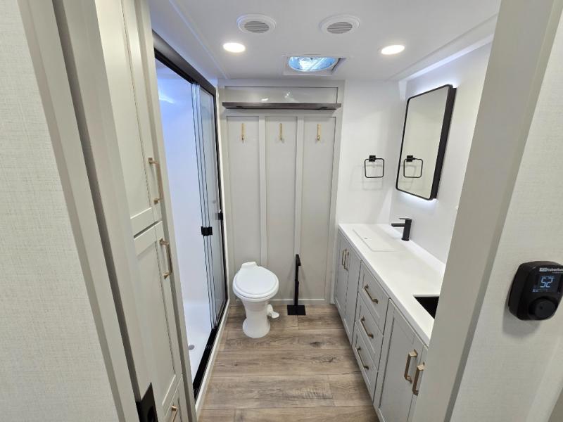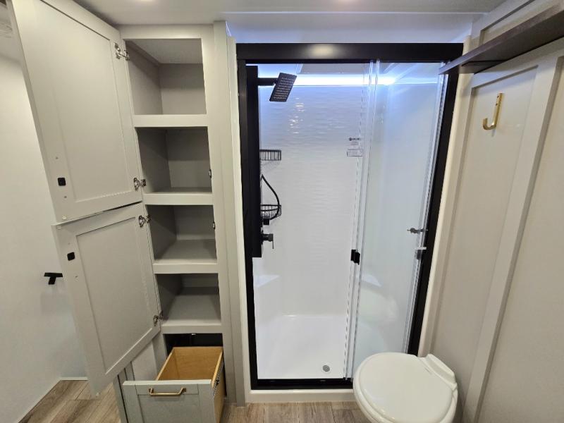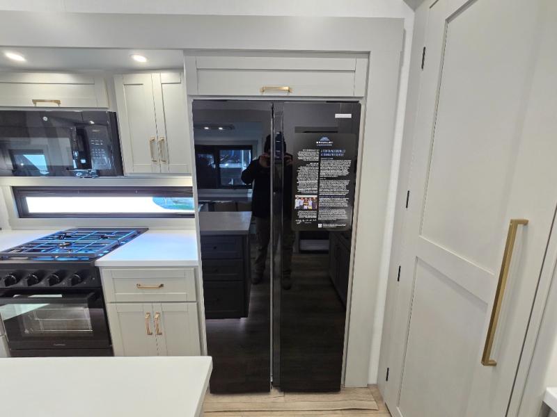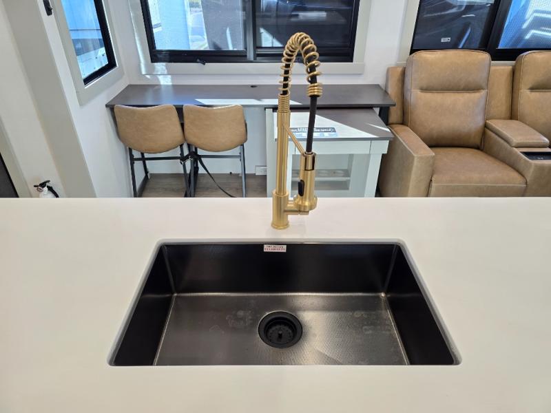 This unit is perfect for weekends at the campground or extended stays! There is ample seating with a sliding desk/dining table, 62" theater seating, and a 72" tri-fold sofa along the rear wall. You can easily relax and enjoy the telescoping TV with a cozy fireplace below. The kitchen offers all that you need to prepare and cook meals just like home with a 16-cu. ft. refrigerator for your perishables, a 30" residential microwave oven, and three burner range top and oven. You will love the kitchen island all outfitted with pull-out pet bowls and double pull-out trash bins with an integrated Stow & Go paper towel holder. There is also an 84" pantry with adjustable shelves for all of your canned and dry goods. Head up the steps to a find a full bath and a private bedroom with a king bed slide all the way up front. A sliding dresser top features hidden storage which is perfect for jewelry and other personal belongings. The front wardrobe features mirrored doors, and the corner closet has been prepped for a stackable washer and dryer if you choose to add that option.