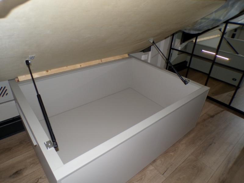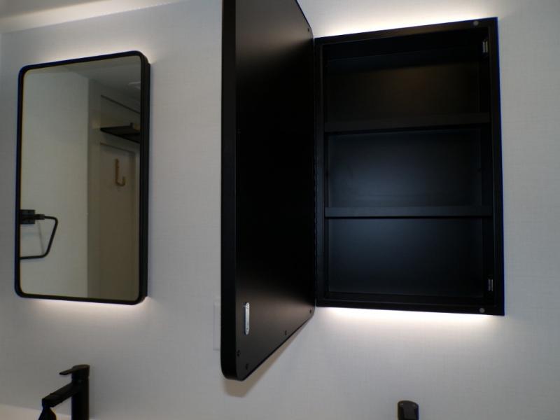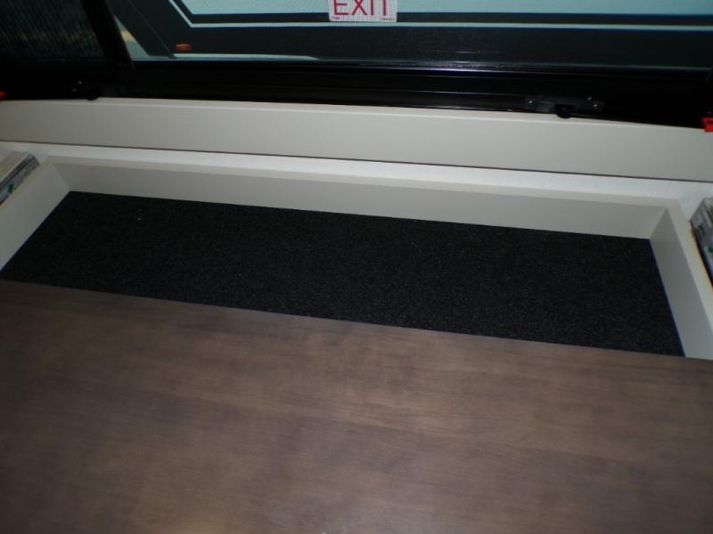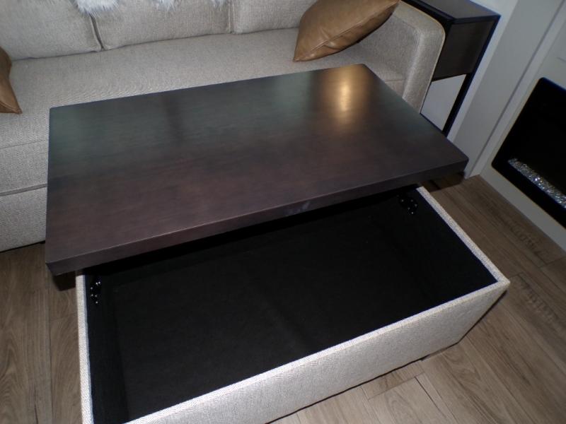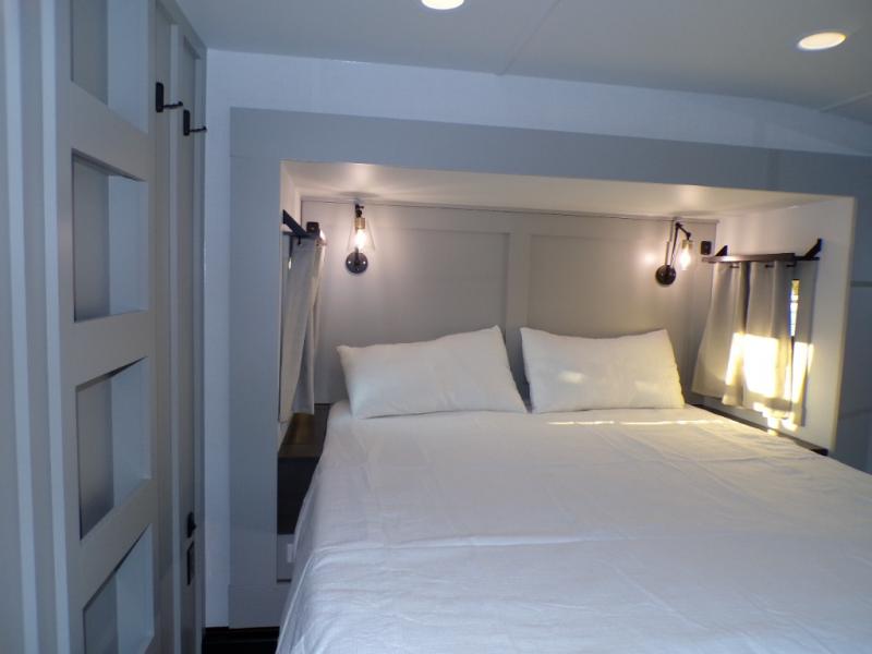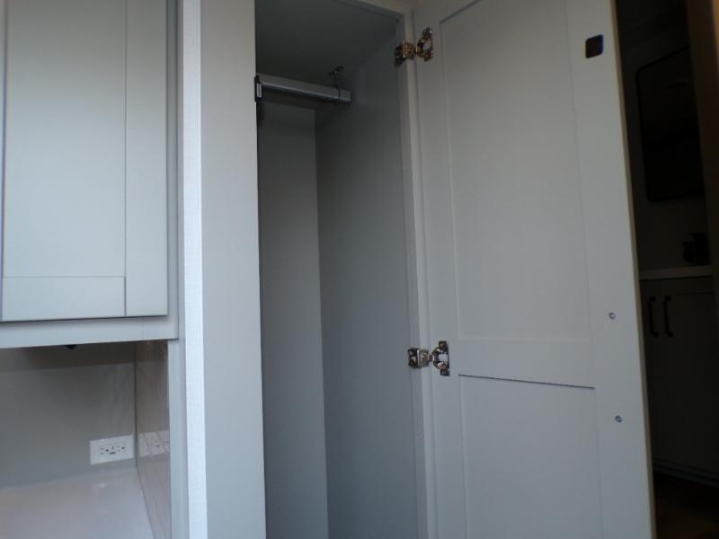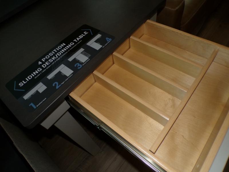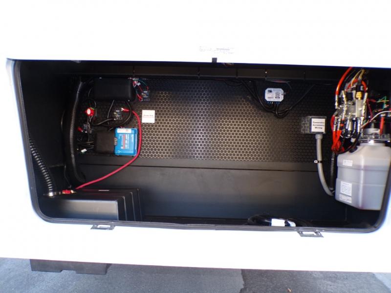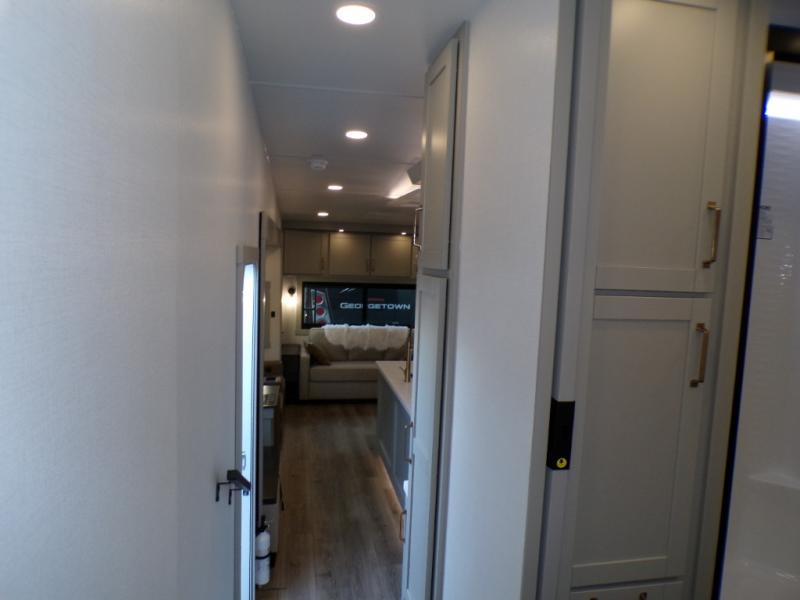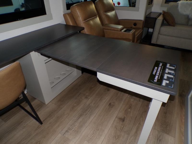 This unit is perfect for weekends at the campground or extended stays! There is ample seating with a sliding desk/dining table, 62" theater seating, and a 72" tri-fold sofa along the rear wall. You can easily relax and enjoy the telescoping TV with a cozy fireplace below. The kitchen offers all that you need to prepare and cook meals just like home with a 16-cu. ft. refrigerator for your perishables, a 30" residential microwave oven, and three burner range top and oven. You will love the kitchen island all outfitted with pull-out pet bowls and double pull-out trash bins with an integrated Stow & Go paper towel holder. There is also an 84" pantry with adjustable shelves for all of your canned and dry goods. Head up the steps to a find a full bath and a private bedroom with a king bed slide all the way up front. A sliding dresser top features hidden storage which is perfect for jewelry and other personal belongings. The front wardrobe features mirrored doors, and the corner closet has been prepped for a stackable washer and dryer if you choose to add that option.