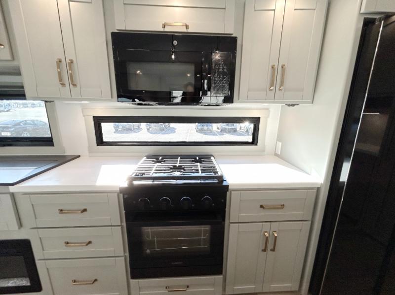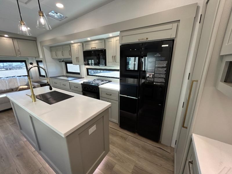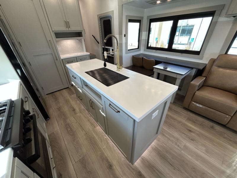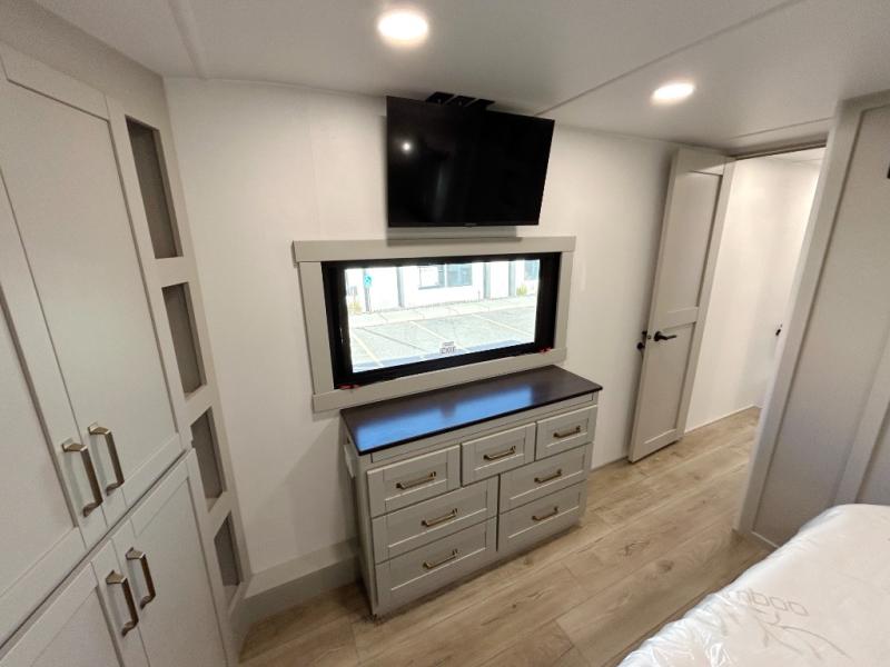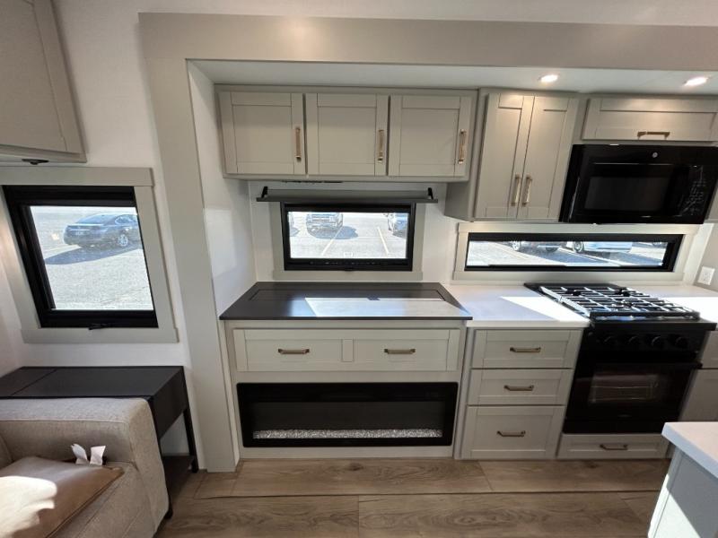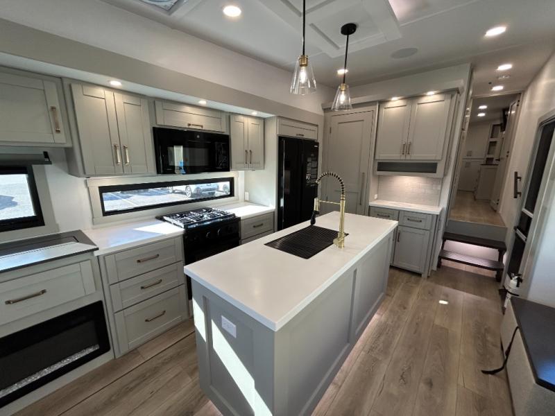 This unit is perfect for weekends at the campground or extended stays! There is ample seating with a sliding desk/dining table, 62" theater seating, and a 72" tri-fold sofa along the rear wall. You can easily relax and enjoy the telescoping TV with a cozy fireplace below. The kitchen offers all that you need to prepare and cook meals just like home with a 16-cu. ft. refrigerator for your perishables, a 30" residential microwave oven, and three burner range top and oven. You will love the kitchen island all outfitted with pull-out pet bowls and double pull-out trash bins with an integrated Stow & Go paper towel holder. There is also an 84" pantry with adjustable shelves for all of your canned and dry goods. Head up the steps to a find a full bath and a private bedroom with a king bed slide all the way up front. A sliding dresser top features hidden storage which is perfect for jewelry and other personal belongings. The front wardrobe features mirrored doors, and the corner closet has been prepped for a stackable washer and dryer if you choose to add that option.