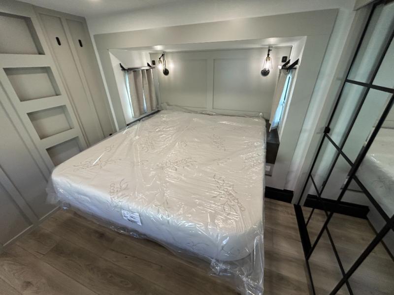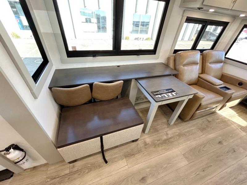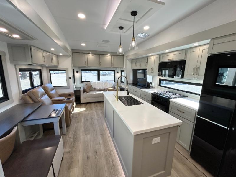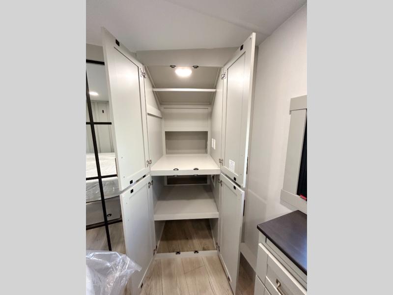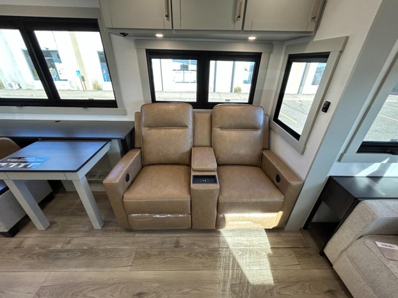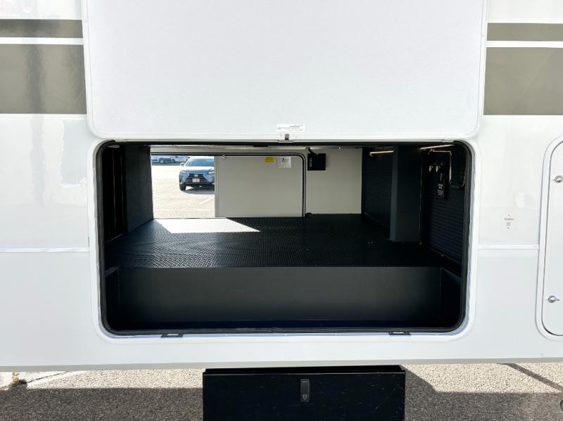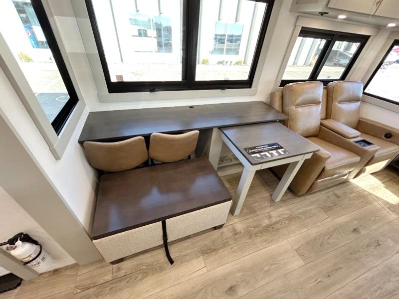 This unit is perfect for weekends at the campground or extended stays! There is ample seating with a sliding desk/dining table, 62" theater seating, and a 72" tri-fold sofa along the rear wall. You can easily relax and enjoy the telescoping TV with a cozy fireplace below. The kitchen offers all that you need to prepare and cook meals just like home with a 16-cu. ft. refrigerator for your perishables, a 30" residential microwave oven, and three burner range top and oven. You will love the kitchen island all outfitted with pull-out pet bowls and double pull-out trash bins with an integrated Stow & Go paper towel holder. There is also an 84" pantry with adjustable shelves for all of your canned and dry goods. Head up the steps to a find a full bath and a private bedroom with a king bed slide all the way up front. A sliding dresser top features hidden storage which is perfect for jewelry and other personal belongings. The front wardrobe features mirrored doors, and the corner closet has been prepped for a stackable washer and dryer if you choose to add that option.