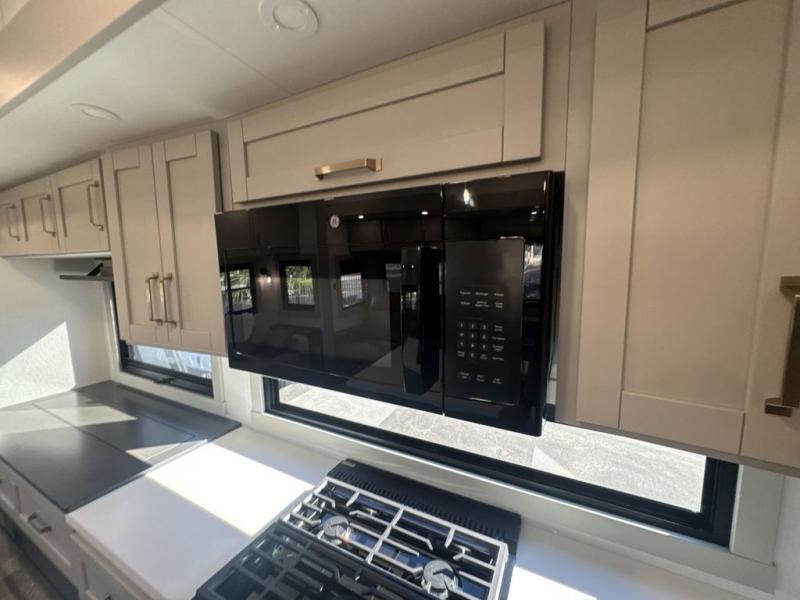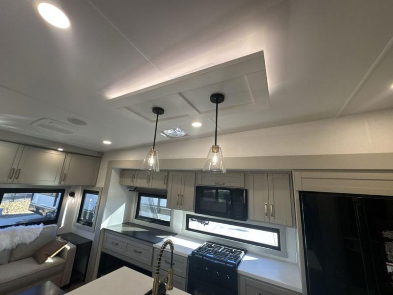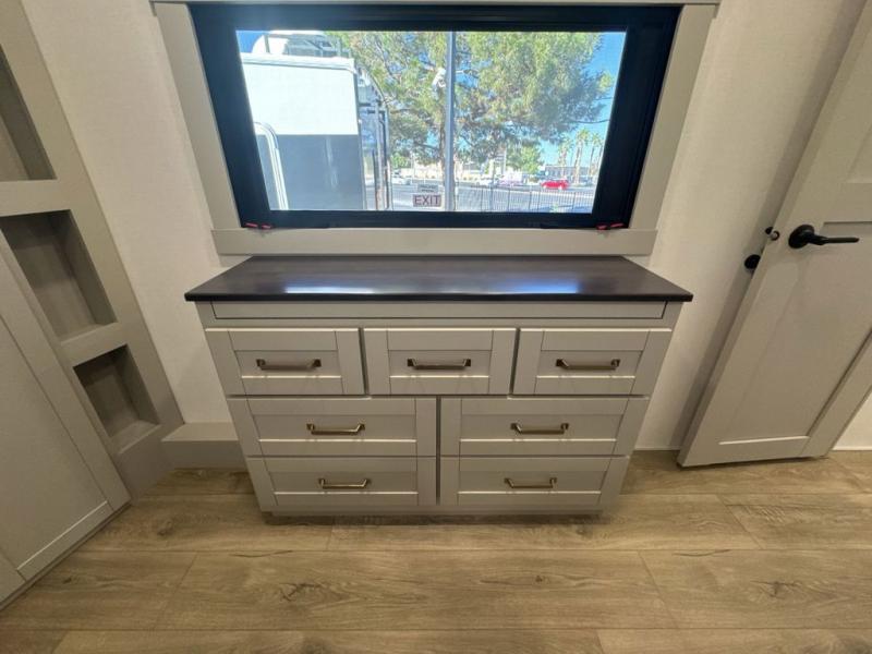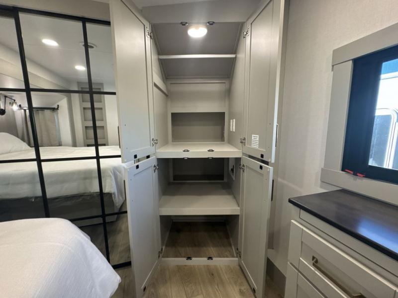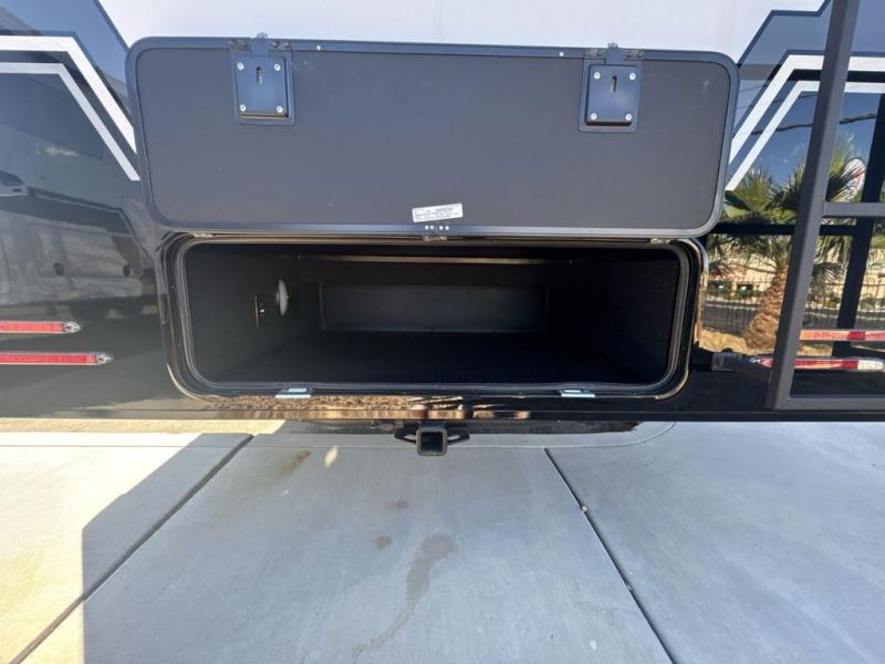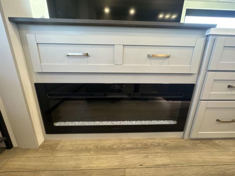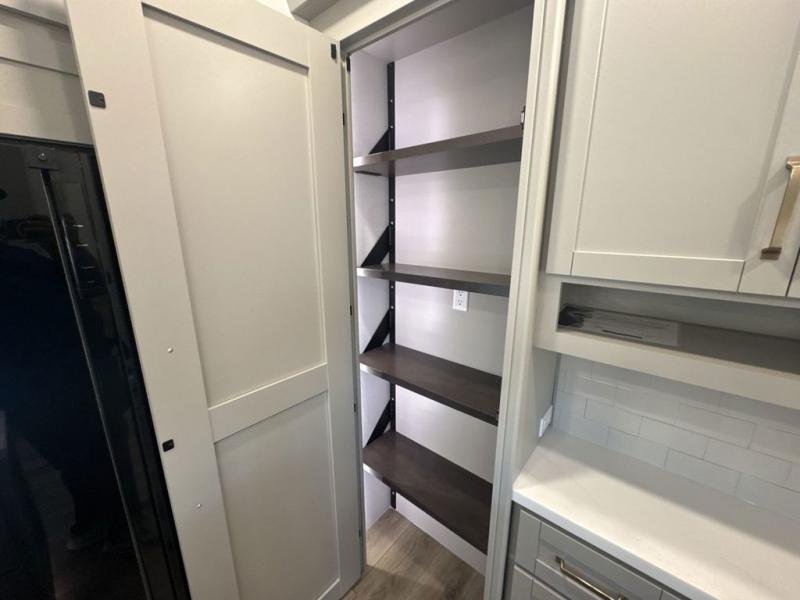 This unit is perfect for weekends at the campground or extended stays! There is ample seating with a sliding desk/dining table, 62" theater seating, and a 72" tri-fold sofa along the rear wall. You can easily relax and enjoy the telescoping TV with a cozy fireplace below. The kitchen offers all that you need to prepare and cook meals just like home with a 16-cu. ft. refrigerator for your perishables, a 30" residential microwave oven, and three burner range top and oven. You will love the kitchen island all outfitted with pull-out pet bowls and double pull-out trash bins with an integrated Stow & Go paper towel holder. There is also an 84" pantry with adjustable shelves for all of your canned and dry goods. Head up the steps to a find a full bath and a private bedroom with a king bed slide all the way up front. A sliding dresser top features hidden storage which is perfect for jewelry and other personal belongings. The front wardrobe features mirrored doors, and the corner closet has been prepped for a stackable washer and dryer if you choose to add that option.