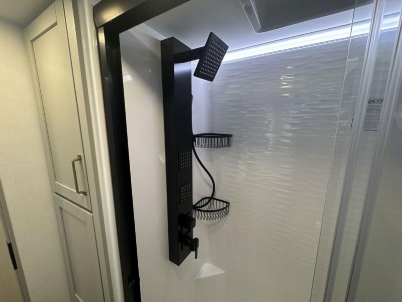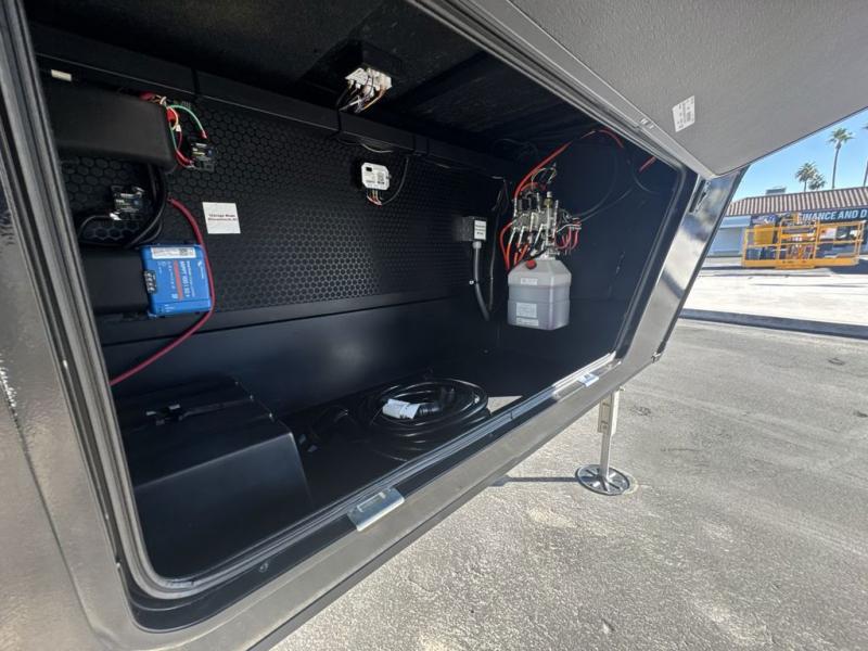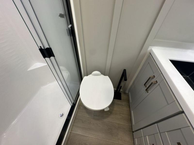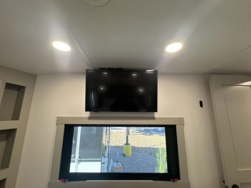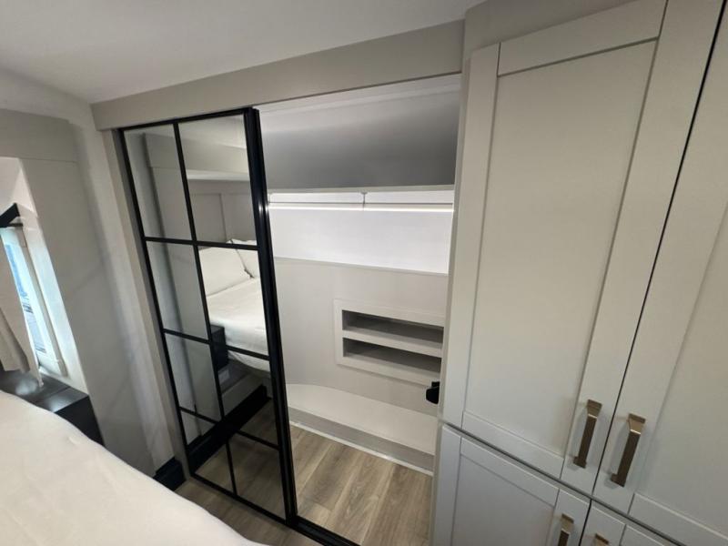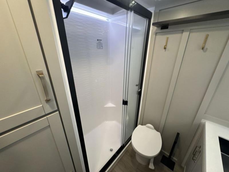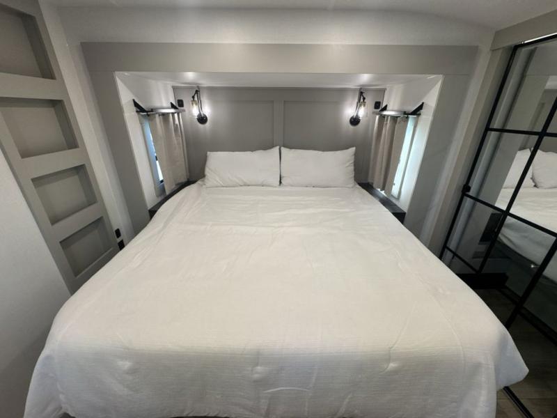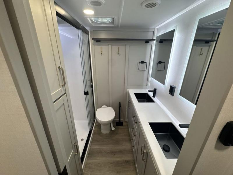 This unit is perfect for weekends at the campground or extended stays! There is ample seating with a sliding desk/dining table, 62" theater seating, and a 72" tri-fold sofa along the rear wall. You can easily relax and enjoy the telescoping TV with a cozy fireplace below. The kitchen offers all that you need to prepare and cook meals just like home with a 16-cu. ft. refrigerator for your perishables, a 30" residential microwave oven, and three burner range top and oven. You will love the kitchen island all outfitted with pull-out pet bowls and double pull-out trash bins with an integrated Stow & Go paper towel holder. There is also an 84" pantry with adjustable shelves for all of your canned and dry goods. Head up the steps to a find a full bath and a private bedroom with a king bed slide all the way up front. A sliding dresser top features hidden storage which is perfect for jewelry and other personal belongings. The front wardrobe features mirrored doors, and the corner closet has been prepped for a stackable washer and dryer if you choose to add that option.