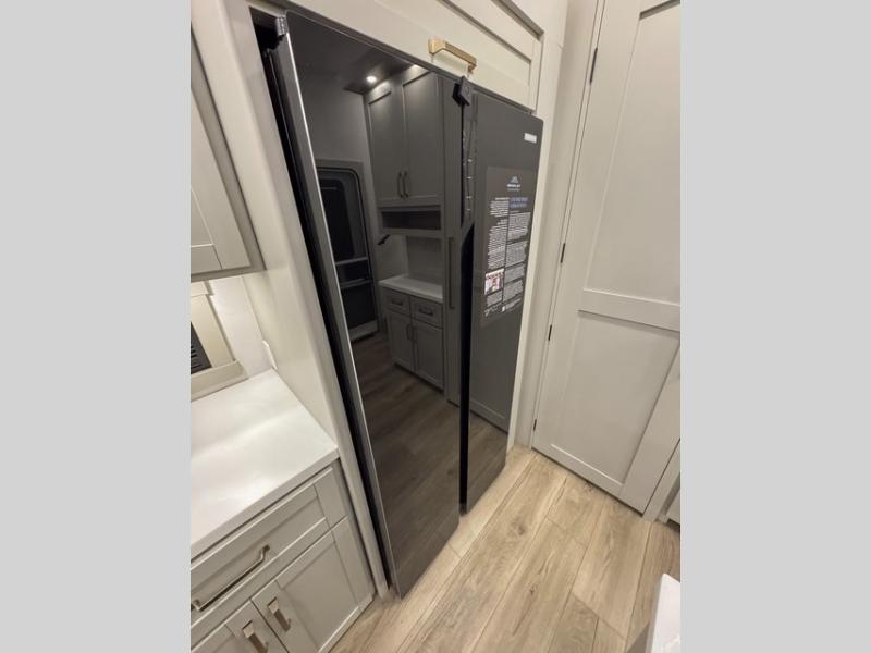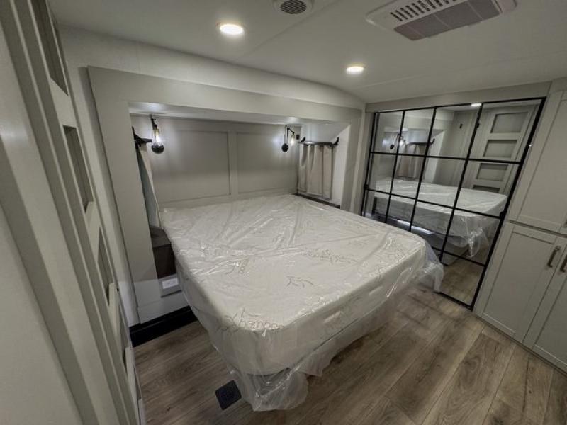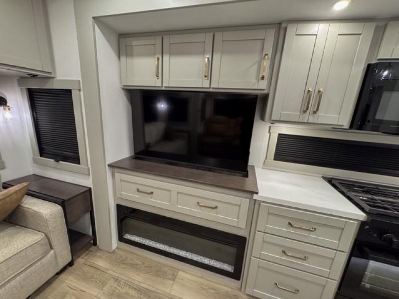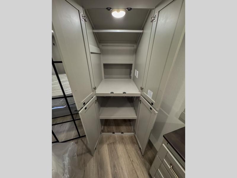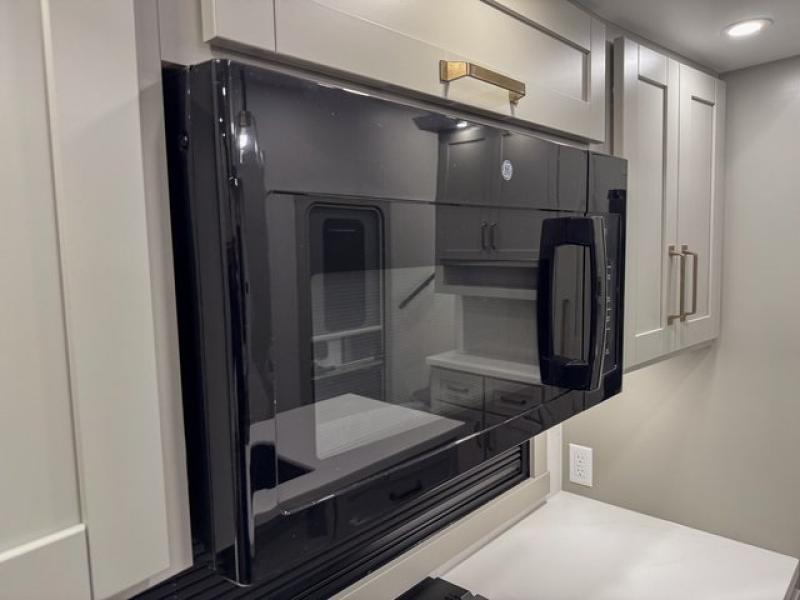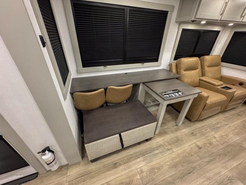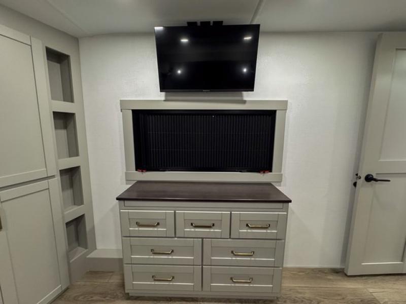 This unit is perfect for weekends at the campground or extended stays! There is ample seating with a sliding desk/dining table, 62" theater seating, and a 72" tri-fold sofa along the rear wall. You can easily relax and enjoy the telescoping TV with a cozy fireplace below. The kitchen offers all that you need to prepare and cook meals just like home with a 16-cu. ft. refrigerator for your perishables, a 30" residential microwave oven, and three burner range top and oven. You will love the kitchen island all outfitted with pull-out pet bowls and double pull-out trash bins with an integrated Stow & Go paper towel holder. There is also an 84" pantry with adjustable shelves for all of your canned and dry goods. Head up the steps to a find a full bath and a private bedroom with a king bed slide all the way up front. A sliding dresser top features hidden storage which is perfect for jewelry and other personal belongings. The front wardrobe features mirrored doors, and the corner closet has been prepped for a stackable washer and dryer if you choose to add that option.