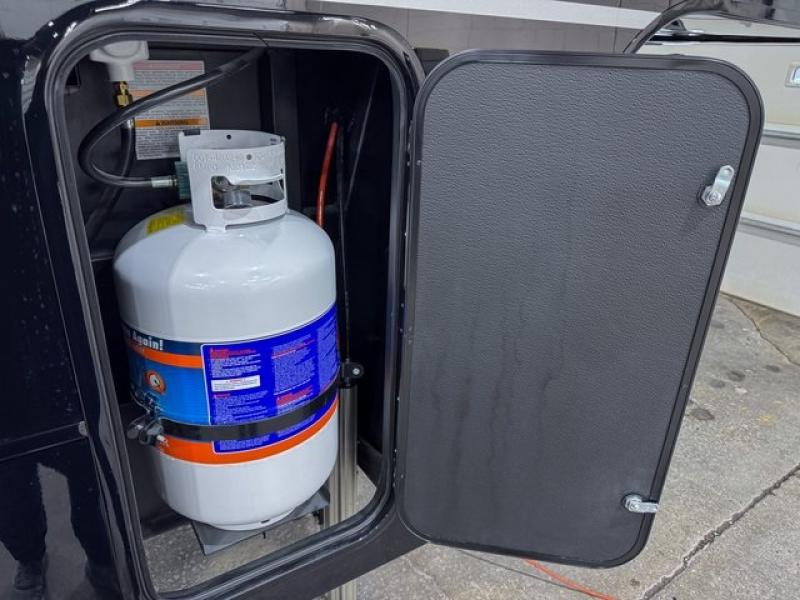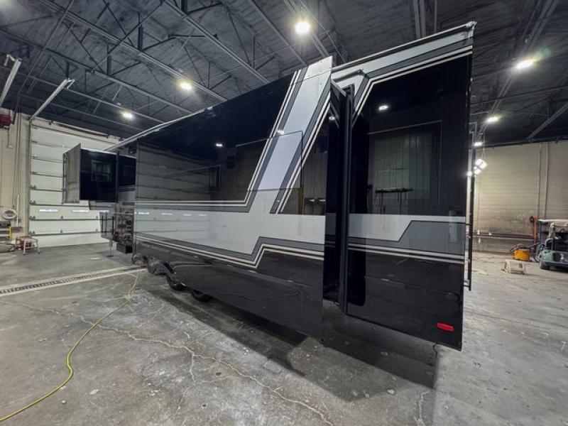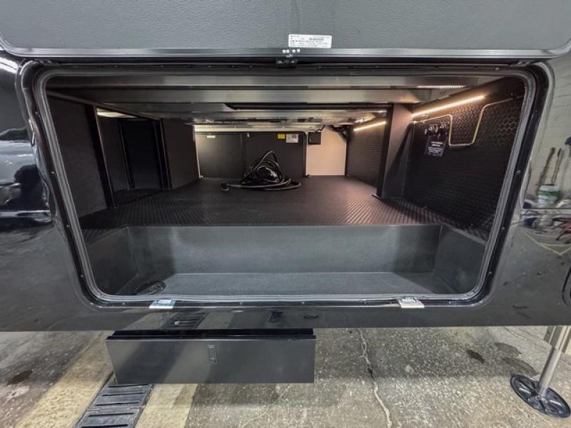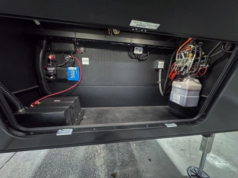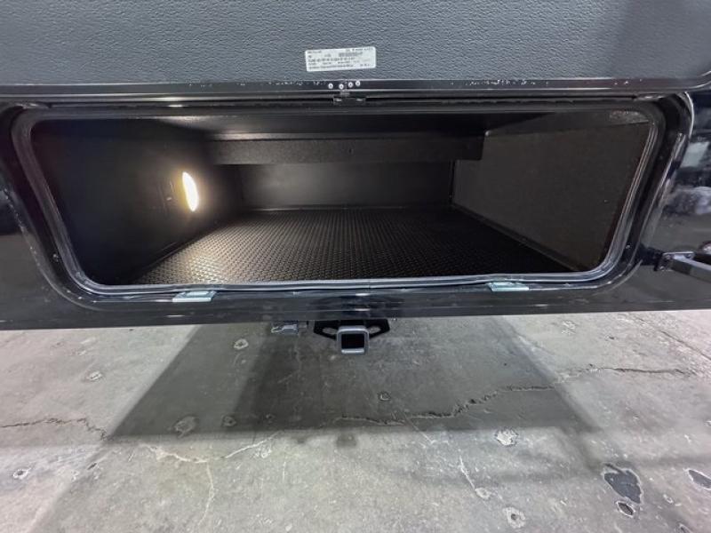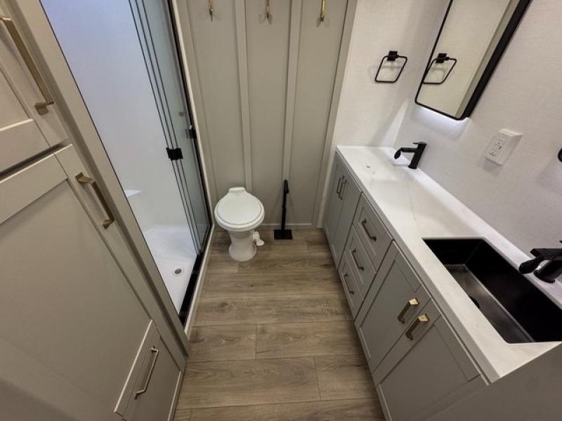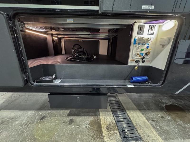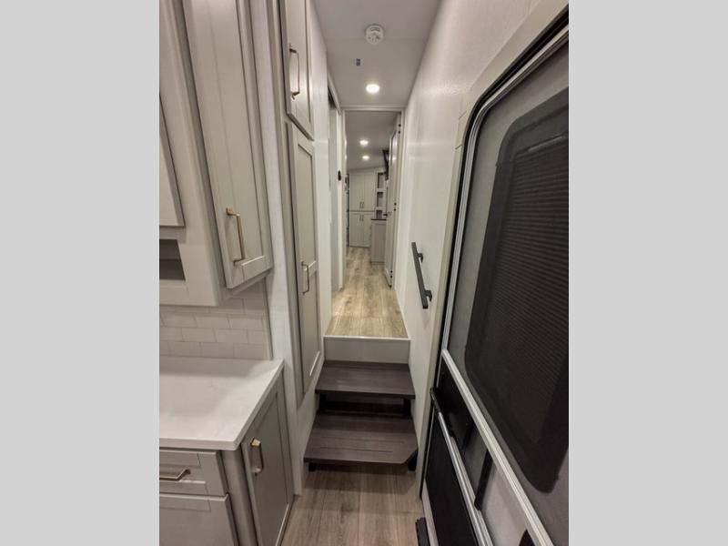 This unit is perfect for weekends at the campground or extended stays! There is ample seating with a sliding desk/dining table, 62" theater seating, and a 72" tri-fold sofa along the rear wall. You can easily relax and enjoy the telescoping TV with a cozy fireplace below. The kitchen offers all that you need to prepare and cook meals just like home with a 16-cu. ft. refrigerator for your perishables, a 30" residential microwave oven, and three burner range top and oven. You will love the kitchen island all outfitted with pull-out pet bowls and double pull-out trash bins with an integrated Stow & Go paper towel holder. There is also an 84" pantry with adjustable shelves for all of your canned and dry goods. Head up the steps to a find a full bath and a private bedroom with a king bed slide all the way up front. A sliding dresser top features hidden storage which is perfect for jewelry and other personal belongings. The front wardrobe features mirrored doors, and the corner closet has been prepped for a stackable washer and dryer if you choose to add that option.