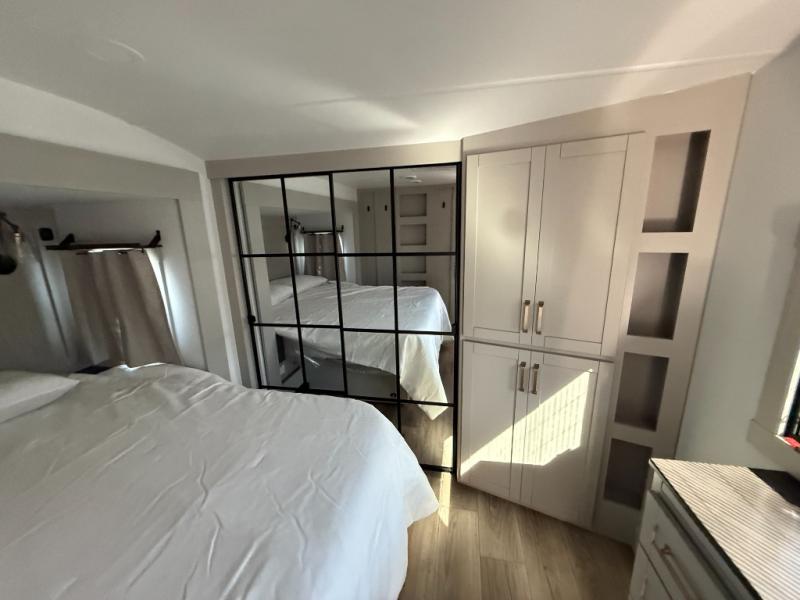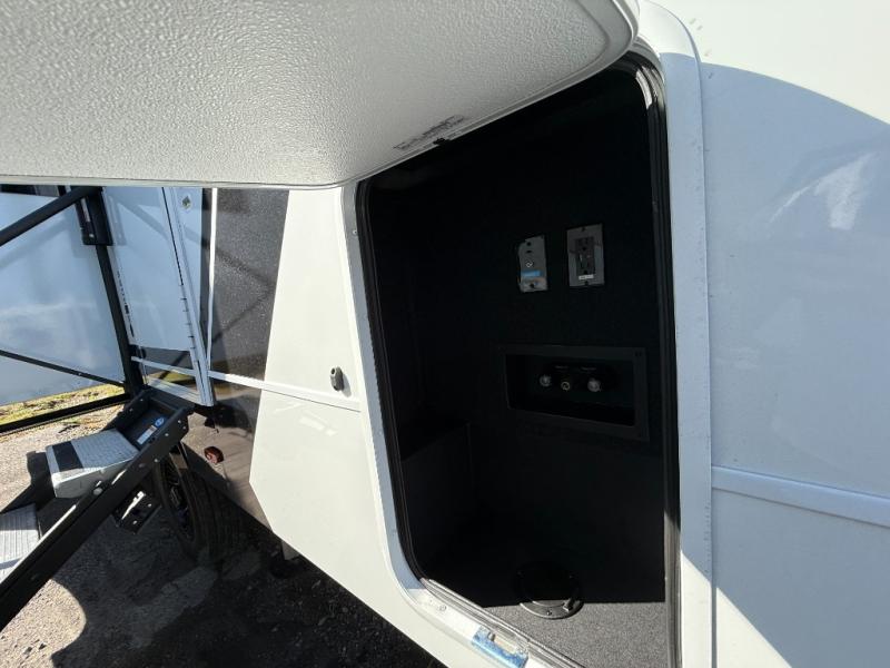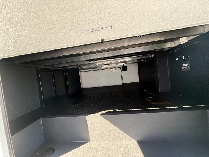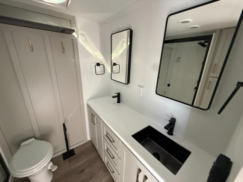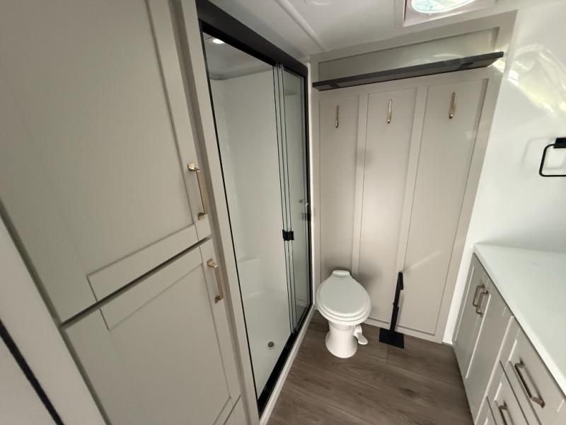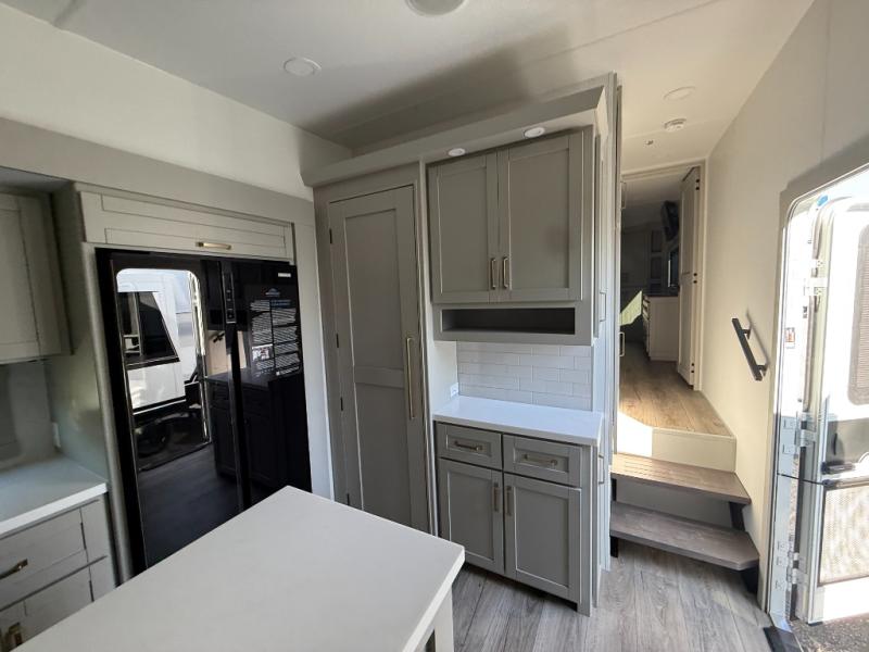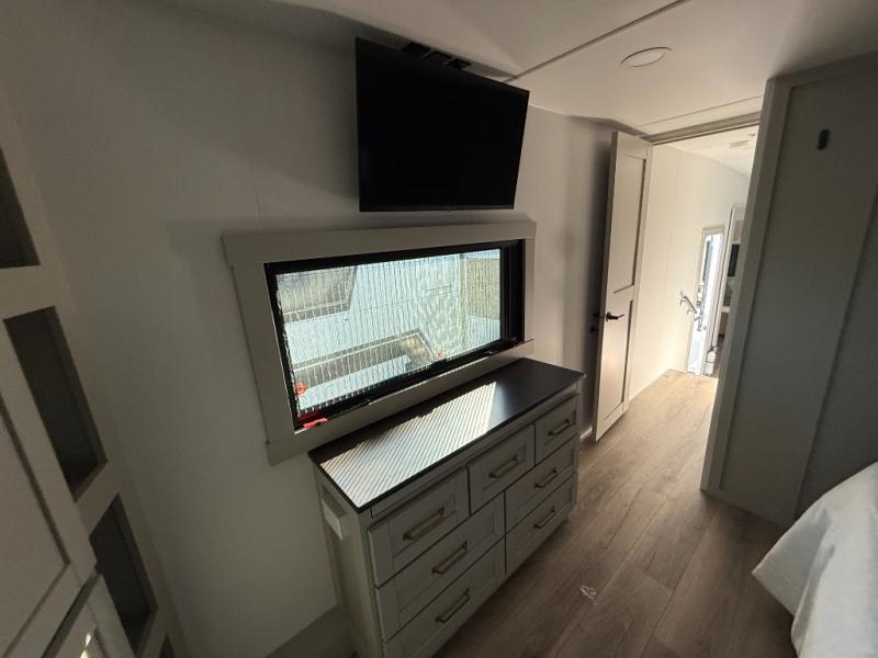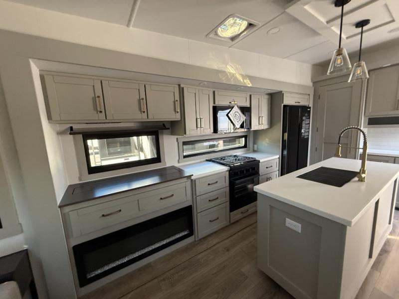This unit is perfect for weekends at the campground or extended stays! There is ample seating with a sliding desk/dining table, 62" theater seating, and a 72" tri-fold sofa along the rear wall. You can easily relax and enjoy the telescoping TV with a cozy fireplace below. The kitchen offers all that you need to prepare and cook meals just like home with a 16-cu. ft. refrigerator for your perishables, a 30" residential microwave oven, and three burner range top and oven. You will love the kitchen island all outfitted with pull-out pet bowls and double pull-out trash bins with an integrated Stow & Go paper towel holder. There is also an 84" pantry with adjustable shelves for all of your canned and dry goods. Head up the steps to a find a full bath and a private bedroom with a king bed slide all the way up front. A sliding dresser top features hidden storage which is perfect for jewelry and other personal belongings. The front wardrobe features mirrored doors, and the corner closet has been prepped for a stackable washer and dryer if you choose to add that option.