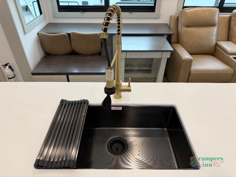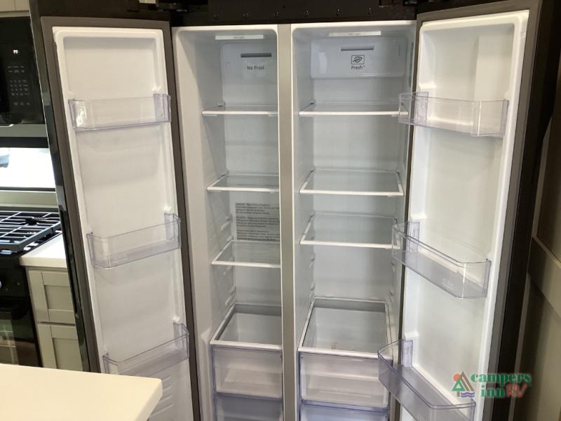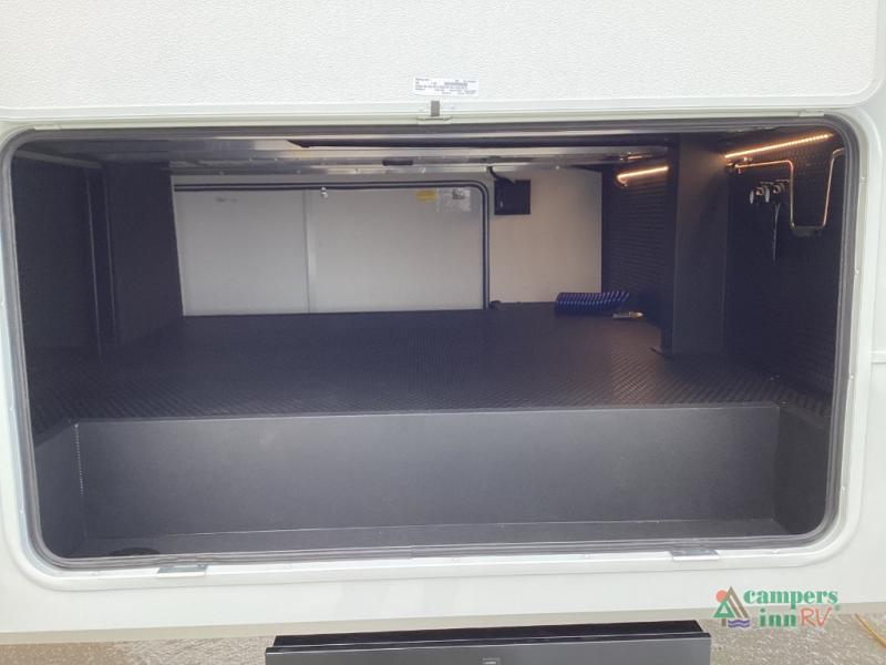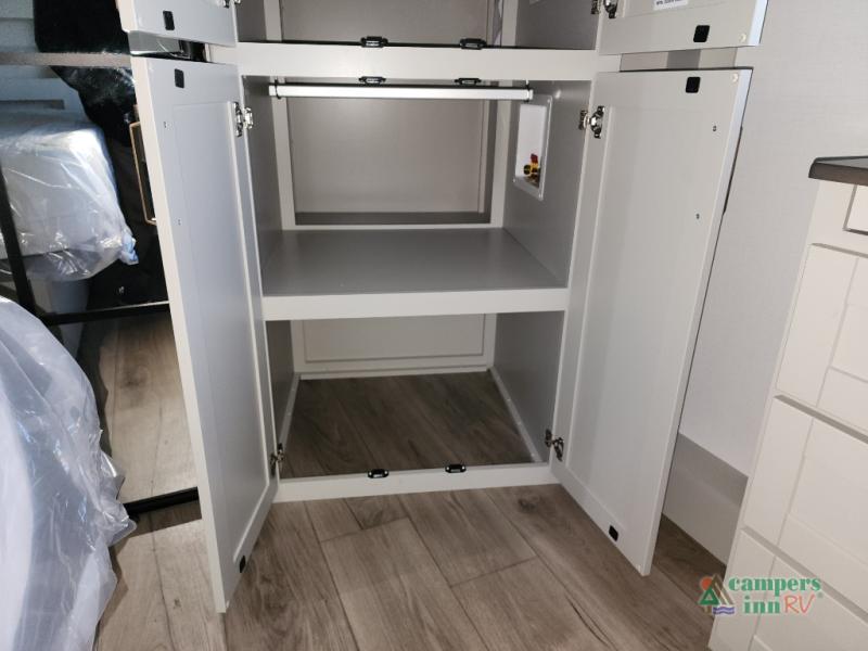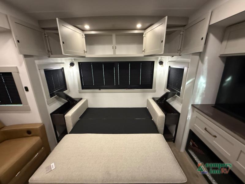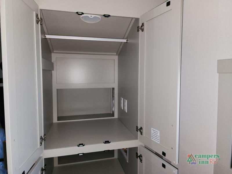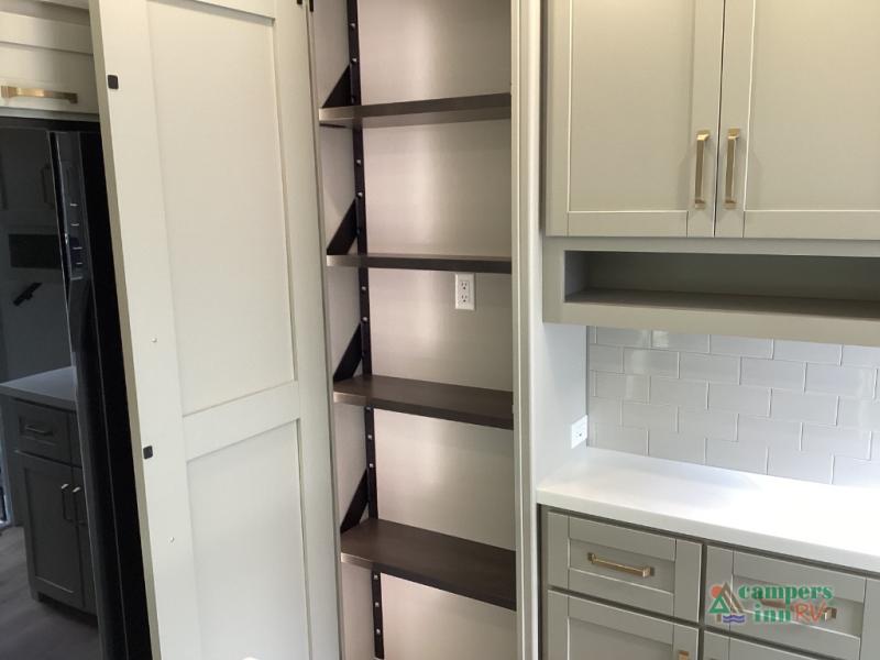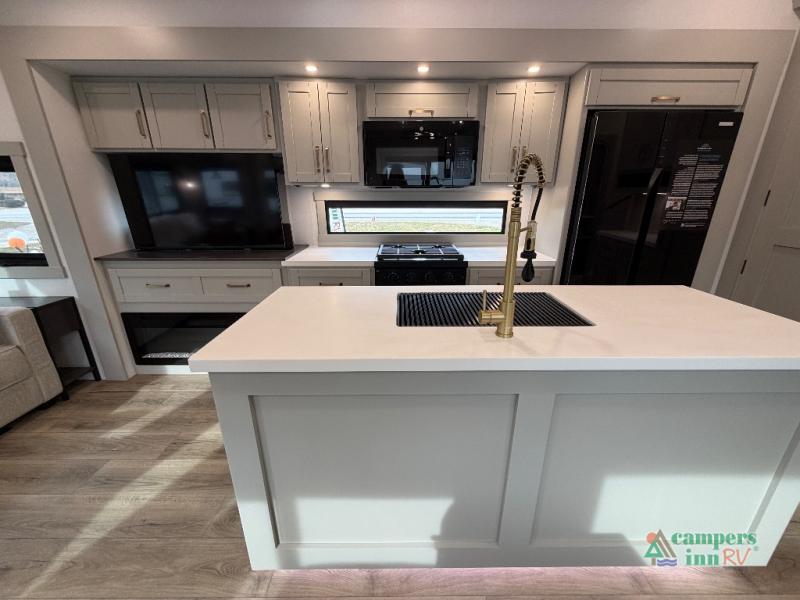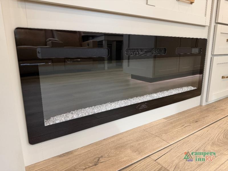 This unit is perfect for weekends at the campground or extended stays! There is ample seating with a sliding desk/dining table, 62" theater seating, and a 72" tri-fold sofa along the rear wall. You can easily relax and enjoy the telescoping TV with a cozy fireplace below. The kitchen offers all that you need to prepare and cook meals just like home with a 16-cu. ft. refrigerator for your perishables, a 30" residential microwave oven, and three burner range top and oven. You will love the kitchen island all outfitted with pull-out pet bowls and double pull-out trash bins with an integrated Stow & Go paper towel holder. There is also an 84" pantry with adjustable shelves for all of your canned and dry goods. Head up the steps to a find a full bath and a private bedroom with a king bed slide all the way up front. A sliding dresser top features hidden storage which is perfect for jewelry and other personal belongings. The front wardrobe features mirrored doors, and the corner closet has been prepped for a stackable washer and dryer if you choose to add that option.