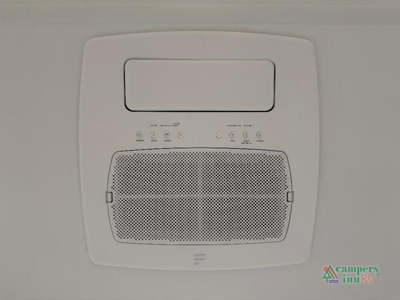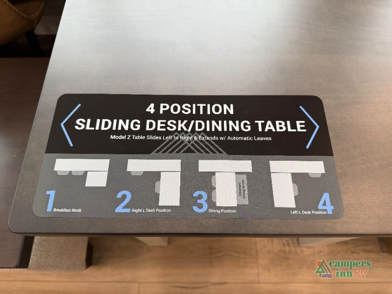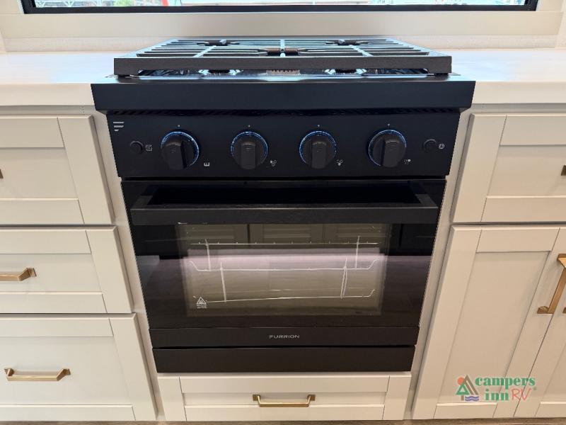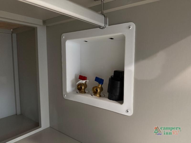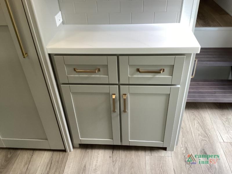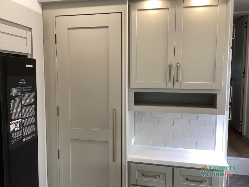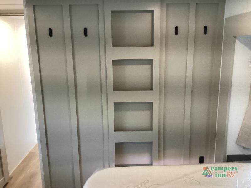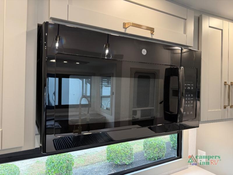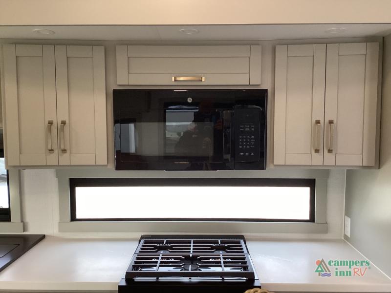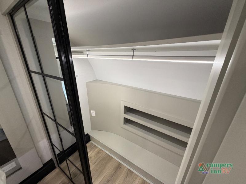This unit is perfect for weekends at the campground or extended stays! There is ample seating with a sliding desk/dining table, 62" theater seating, and a 72" tri-fold sofa along the rear wall. You can easily relax and enjoy the telescoping TV with a cozy fireplace below. The kitchen offers all that you need to prepare and cook meals just like home with a 16-cu. ft. refrigerator for your perishables, a 30" residential microwave oven, and three burner range top and oven. You will love the kitchen island all outfitted with pull-out pet bowls and double pull-out trash bins with an integrated Stow & Go paper towel holder. There is also an 84" pantry with adjustable shelves for all of your canned and dry goods. Head up the steps to a find a full bath and a private bedroom with a king bed slide all the way up front. A sliding dresser top features hidden storage which is perfect for jewelry and other personal belongings. The front wardrobe features mirrored doors, and the corner closet has been prepped for a stackable washer and dryer if you choose to add that option.