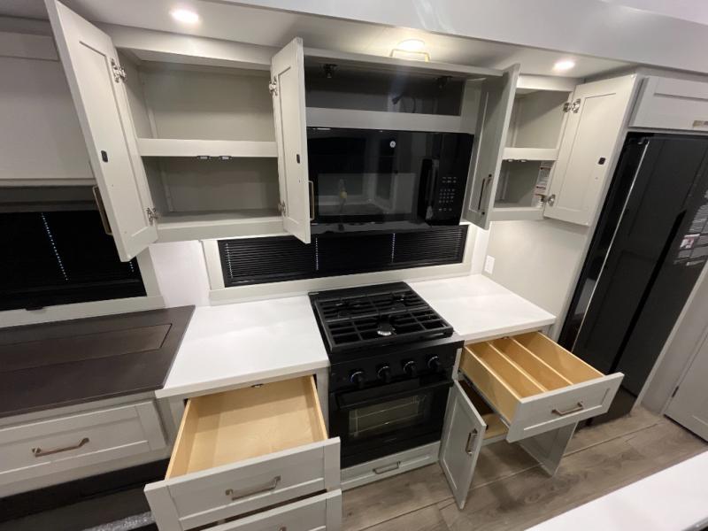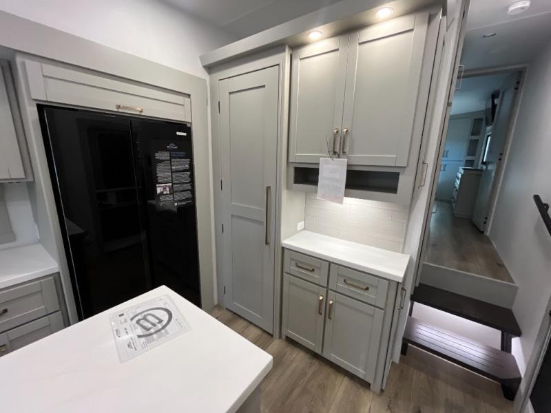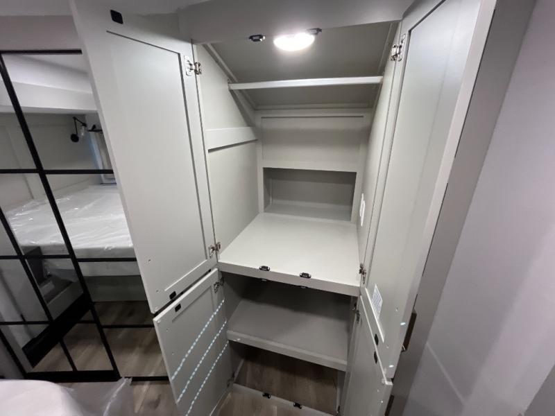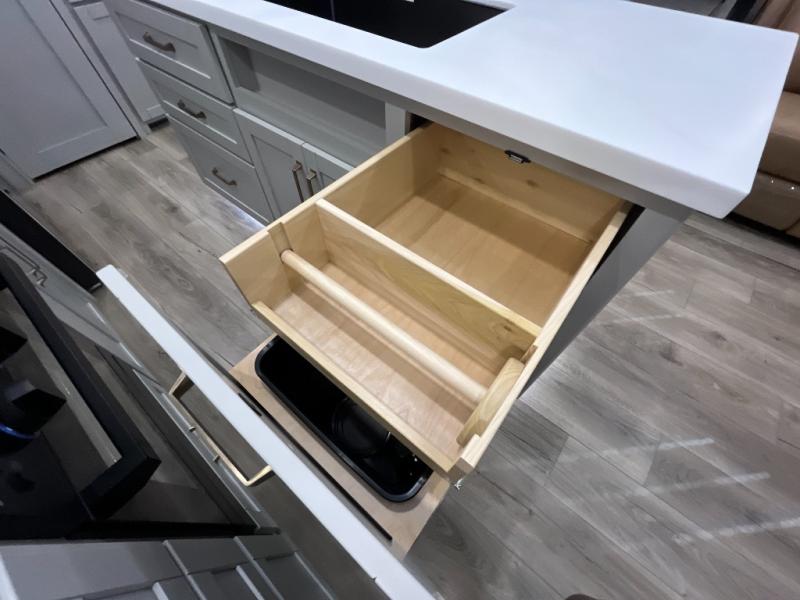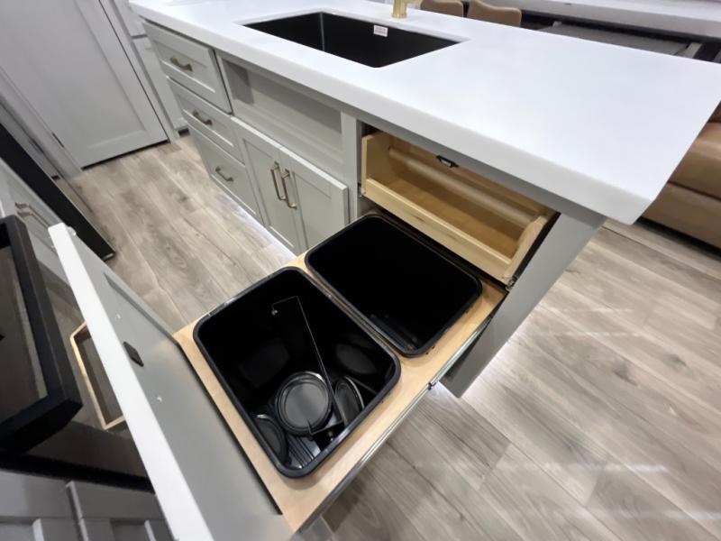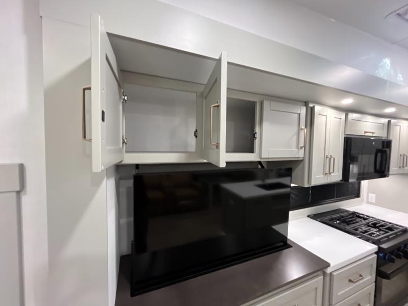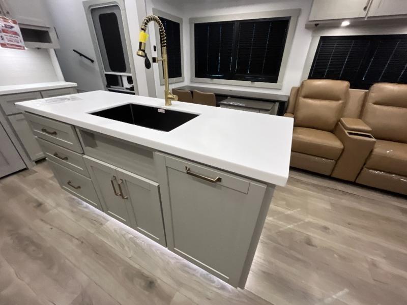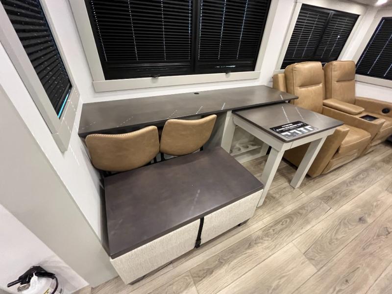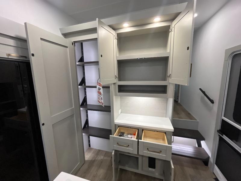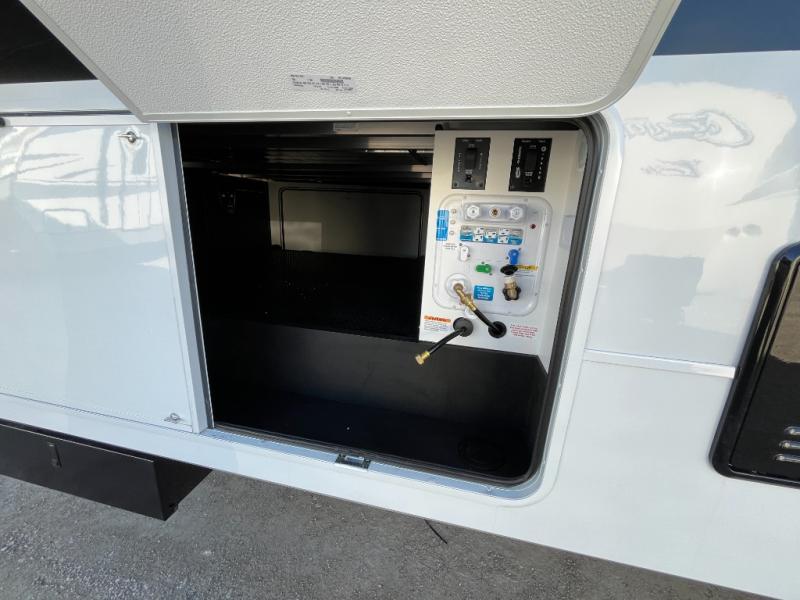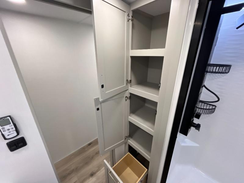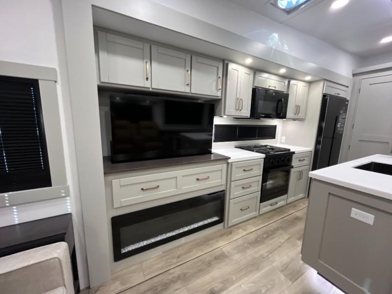 This unit is perfect for weekends at the campground or extended stays! There is ample seating with a sliding desk/dining table, 62" theater seating, and a 72" tri-fold sofa along the rear wall. You can easily relax and enjoy the telescoping TV with a cozy fireplace below. The kitchen offers all that you need to prepare and cook meals just like home with a 16-cu. ft. refrigerator for your perishables, a 30" residential microwave oven, and three burner range top and oven. You will love the kitchen island all outfitted with pull-out pet bowls and double pull-out trash bins with an integrated Stow & Go paper towel holder. There is also an 84" pantry with adjustable shelves for all of your canned and dry goods. Head up the steps to a find a full bath and a private bedroom with a king bed slide all the way up front. A sliding dresser top features hidden storage which is perfect for jewelry and other personal belongings. The front wardrobe features mirrored doors, and the corner closet has been prepped for a stackable washer and dryer if you choose to add that option.