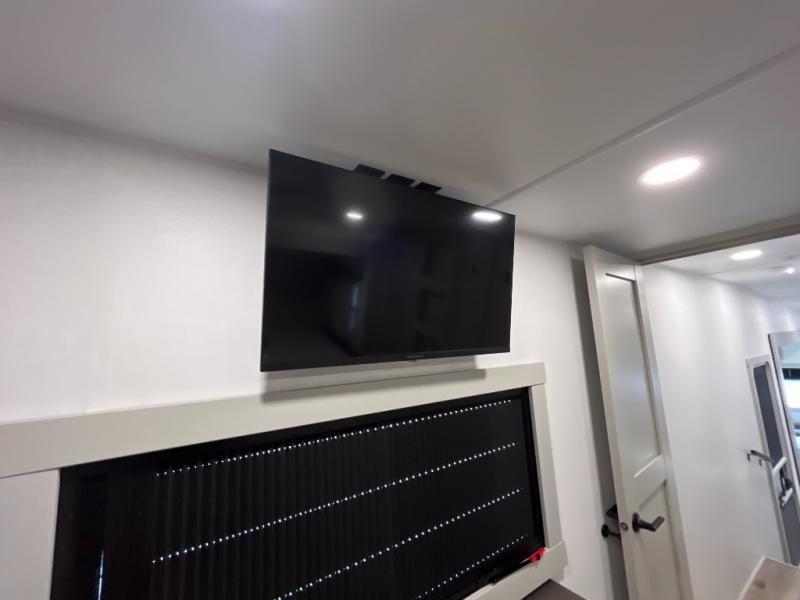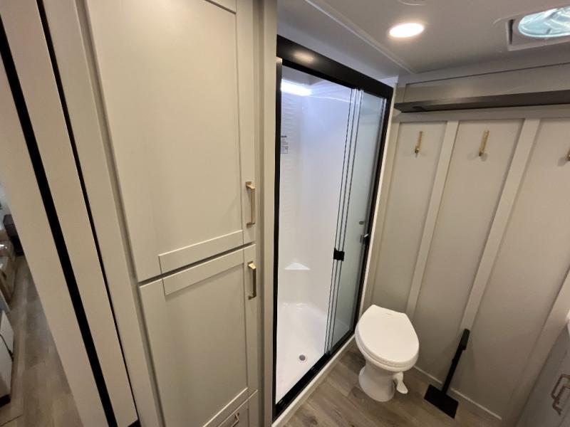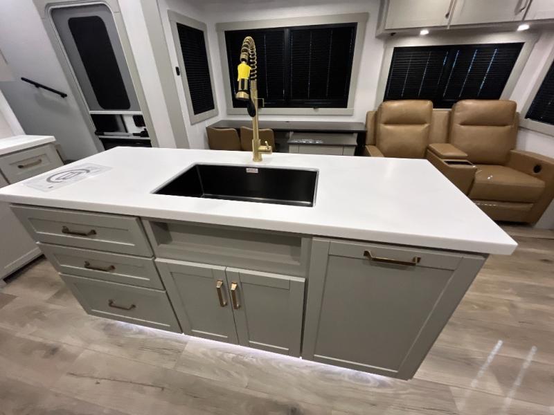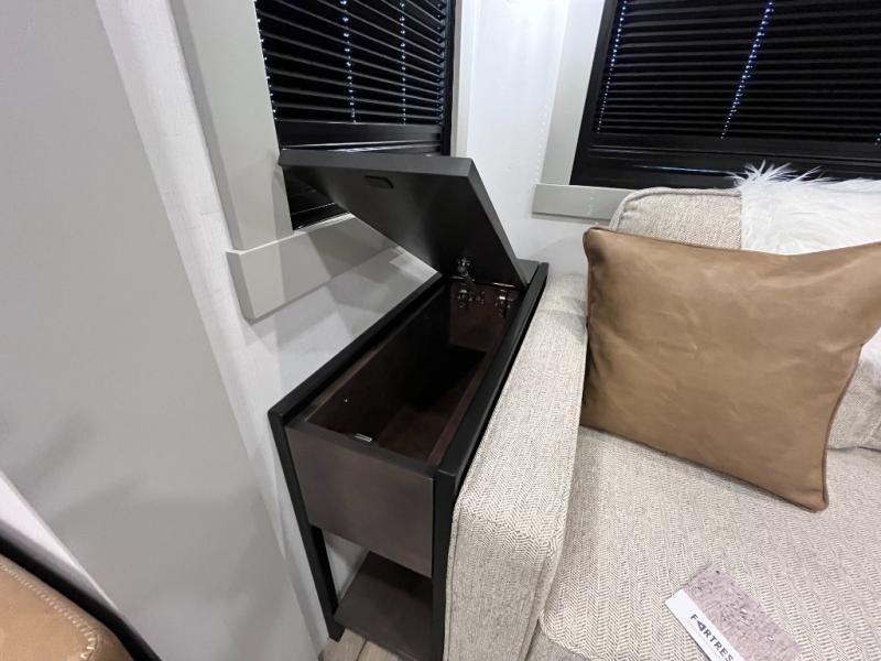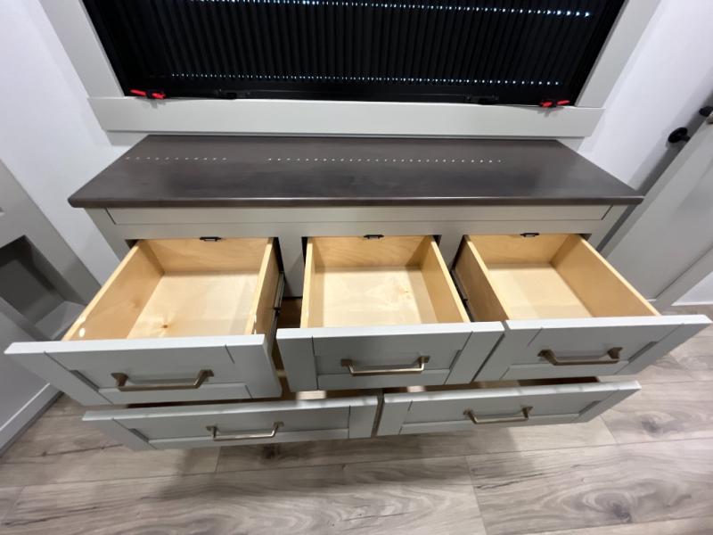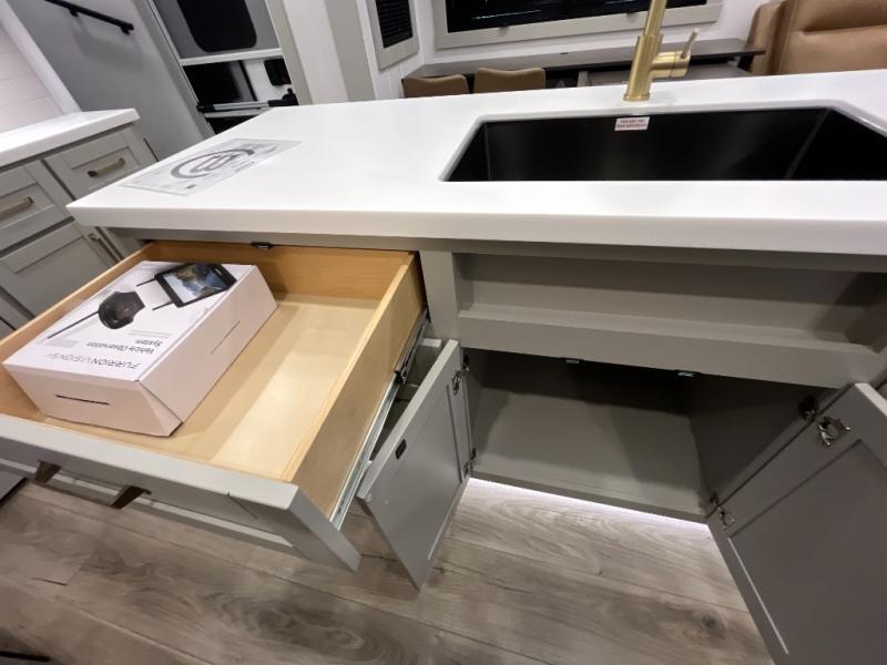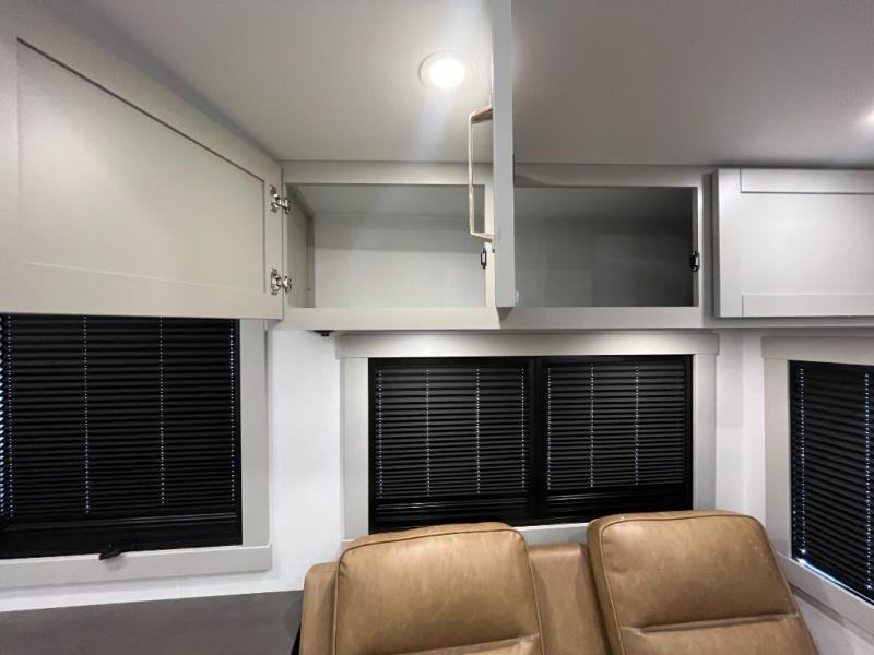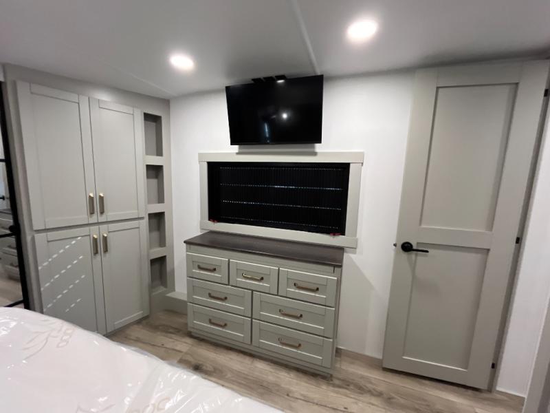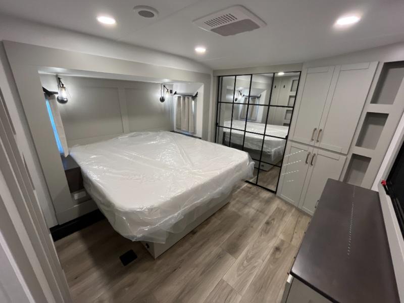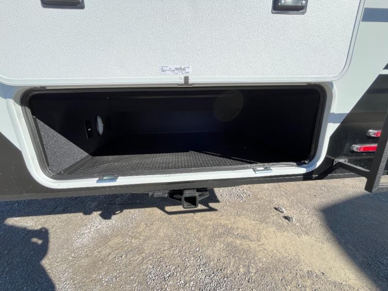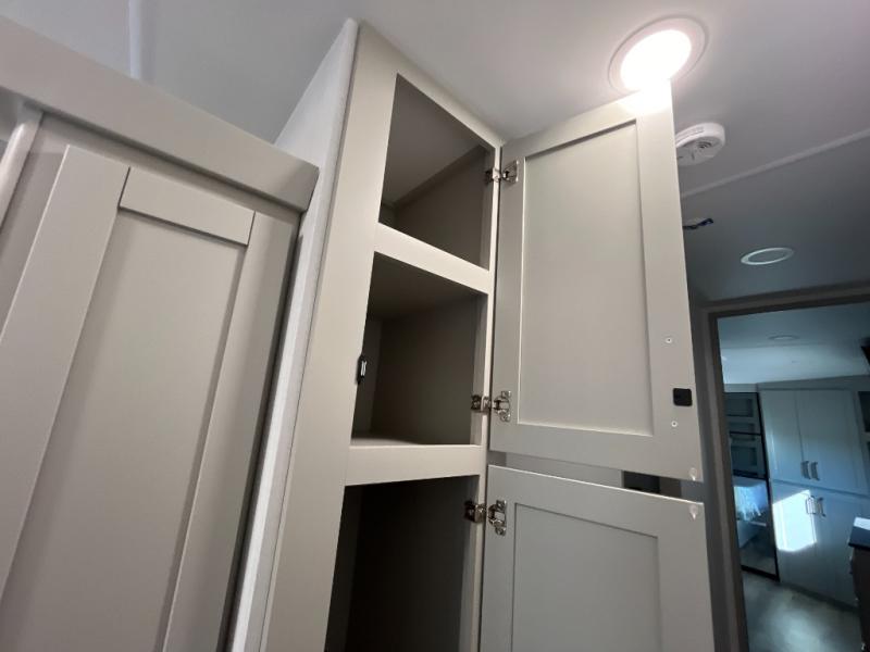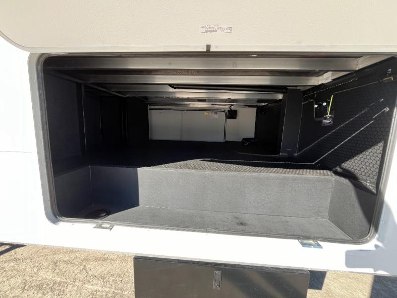 This unit is perfect for weekends at the campground or extended stays! There is ample seating with a sliding desk/dining table, 62" theater seating, and a 72" tri-fold sofa along the rear wall. You can easily relax and enjoy the telescoping TV with a cozy fireplace below. The kitchen offers all that you need to prepare and cook meals just like home with a 16-cu. ft. refrigerator for your perishables, a 30" residential microwave oven, and three burner range top and oven. You will love the kitchen island all outfitted with pull-out pet bowls and double pull-out trash bins with an integrated Stow & Go paper towel holder. There is also an 84" pantry with adjustable shelves for all of your canned and dry goods. Head up the steps to a find a full bath and a private bedroom with a king bed slide all the way up front. A sliding dresser top features hidden storage which is perfect for jewelry and other personal belongings. The front wardrobe features mirrored doors, and the corner closet has been prepped for a stackable washer and dryer if you choose to add that option.