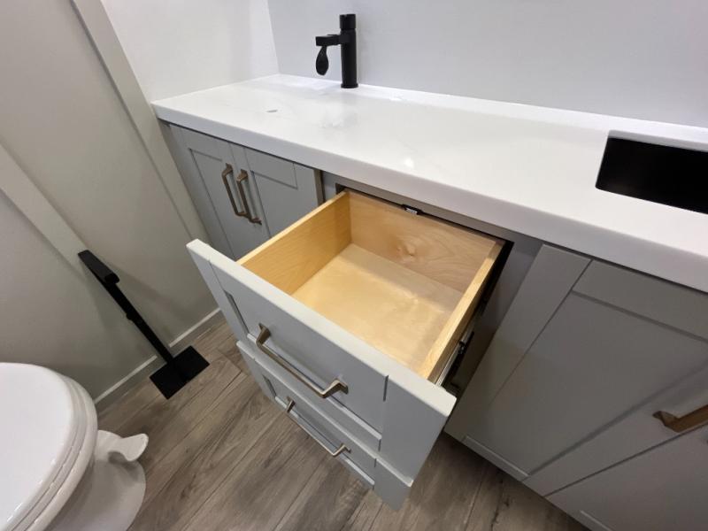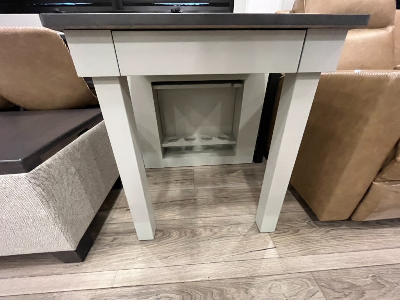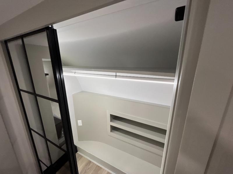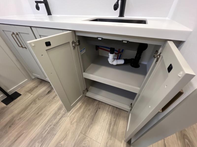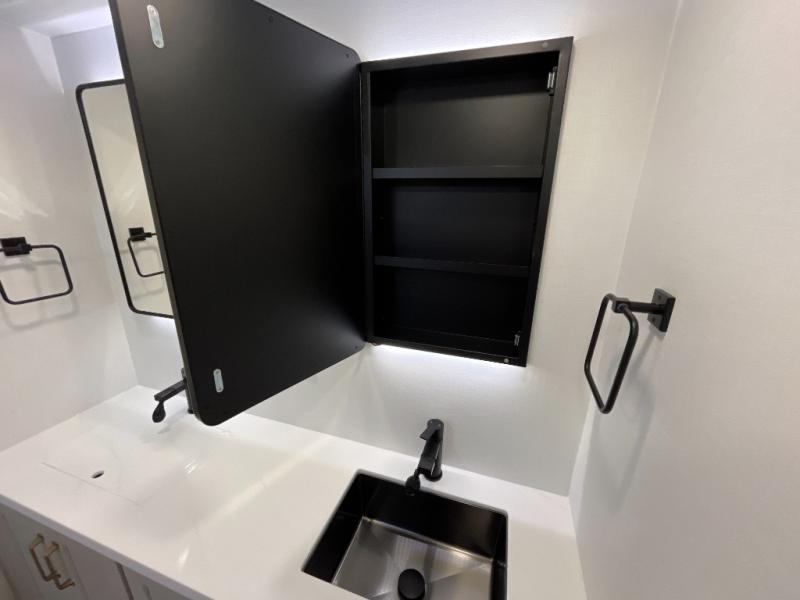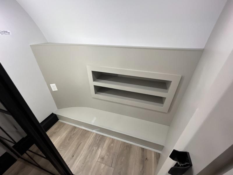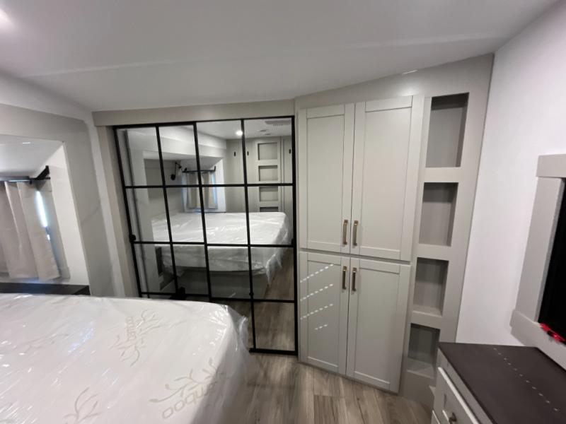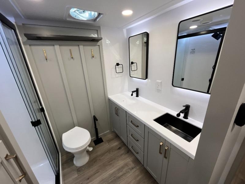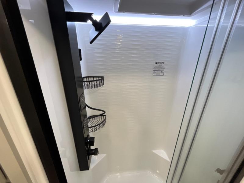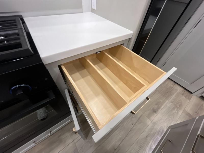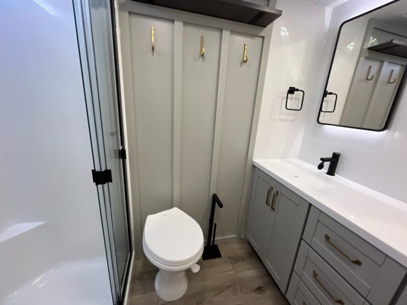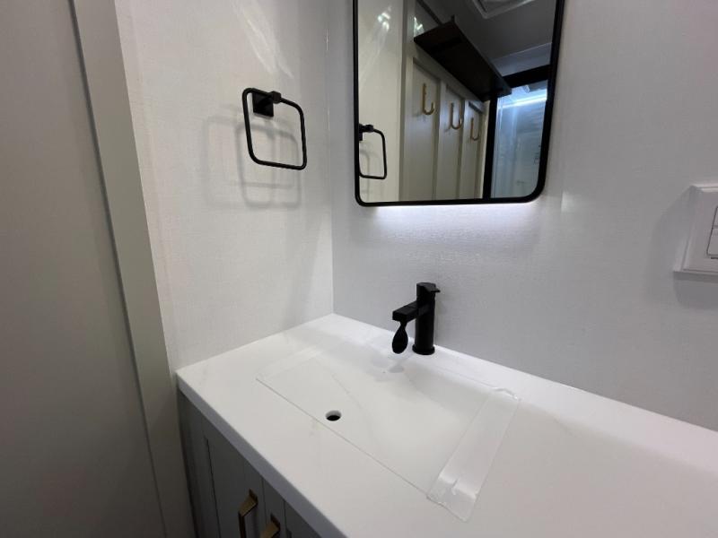 This unit is perfect for weekends at the campground or extended stays! There is ample seating with a sliding desk/dining table, 62" theater seating, and a 72" tri-fold sofa along the rear wall. You can easily relax and enjoy the telescoping TV with a cozy fireplace below. The kitchen offers all that you need to prepare and cook meals just like home with a 16-cu. ft. refrigerator for your perishables, a 30" residential microwave oven, and three burner range top and oven. You will love the kitchen island all outfitted with pull-out pet bowls and double pull-out trash bins with an integrated Stow & Go paper towel holder. There is also an 84" pantry with adjustable shelves for all of your canned and dry goods. Head up the steps to a find a full bath and a private bedroom with a king bed slide all the way up front. A sliding dresser top features hidden storage which is perfect for jewelry and other personal belongings. The front wardrobe features mirrored doors, and the corner closet has been prepped for a stackable washer and dryer if you choose to add that option.