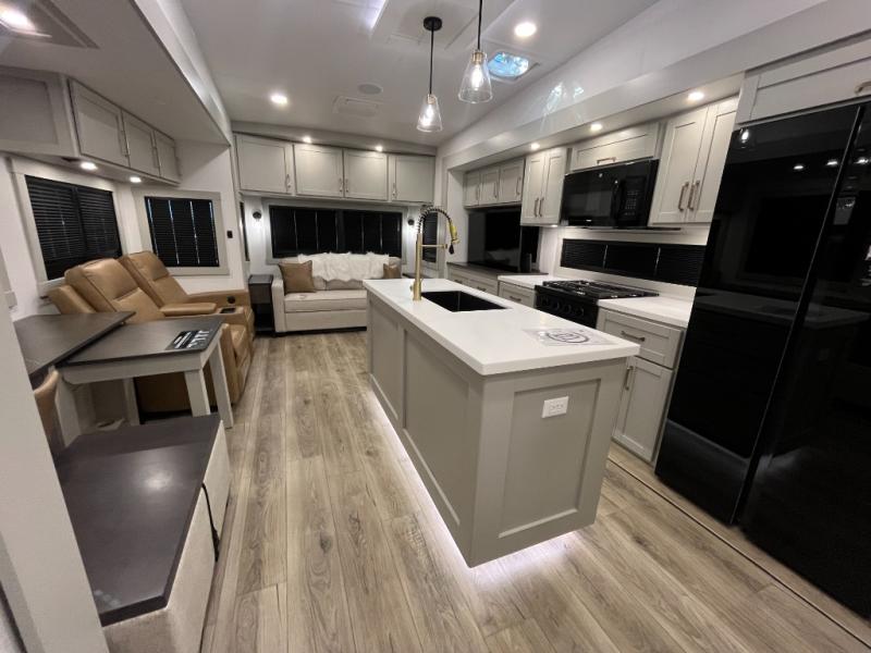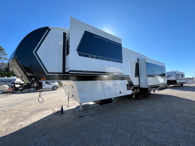 The Brinkley mid-profile Model Z fifth wheels bring you clean lines and an upscale look with plenty of style and exciting new features like the industry first brass plumbing connections. These units also feature an automotive grade front cap, plenty of exterior storage, dual exterior hot and cold showers, and wide stance leveling jacks for easy set up. Residential frameless windows provide a clean look and beautiful views, and ample electrical outlets and 6 USB/USB-C outlets allow all of your electronics and appliances to easily be used and charged.