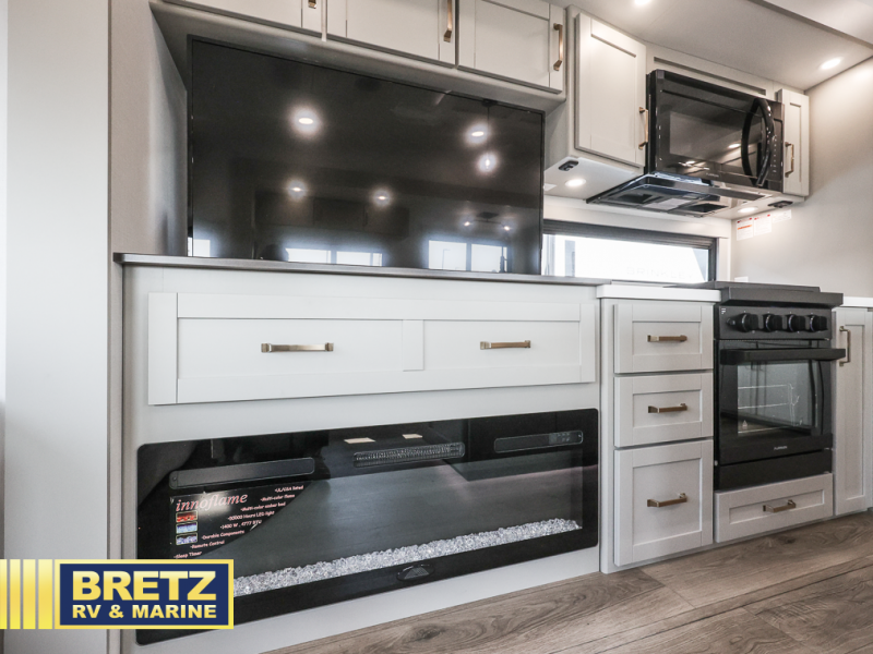 This unit is perfect for your family that needs sleeping space for eight! There is ample seating with a sliding desk/dining table, 62" theater seating, and a 72" tri-fold sofa along the rear wall. You can easily relax and enjoy the telescoping TV with a cozy fireplace below. The kitchen offers all that you need to prepare and cook meals just like home with a 16 cu. ft. refrigerator for your perishables, a 30" residential microwave oven, and three burner range top and oven. You will love the kitchen island all outfitted with pull-out pet bowls and double pull out trash bins with an integrated Stow & Go paper towel holder. There is also an 84" pantry with adjustable shelves for all of your canned and dry goods. Mid-coach, just ahead through the main entry, is a bonus room that can be used as a bedroom featuring a sofa bed with flip-up overhead bunk and trundle below, or an office with pull-out desk so that you can work easily while you travel, or it could also be used as a gaming room since there is also a 50" Smart TV. Head up the steps to a bathroom on your left and a private master suite with king bed slide all the way up front. A sliding dresser top features hidden storage which is perfect for jewelry and other personal belongings. The front wardrobe features mirrored doors and the corner closet has been prepped for a stackable washer and dryer if you choose to add that option.