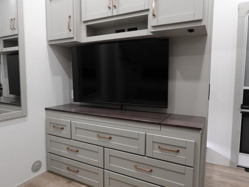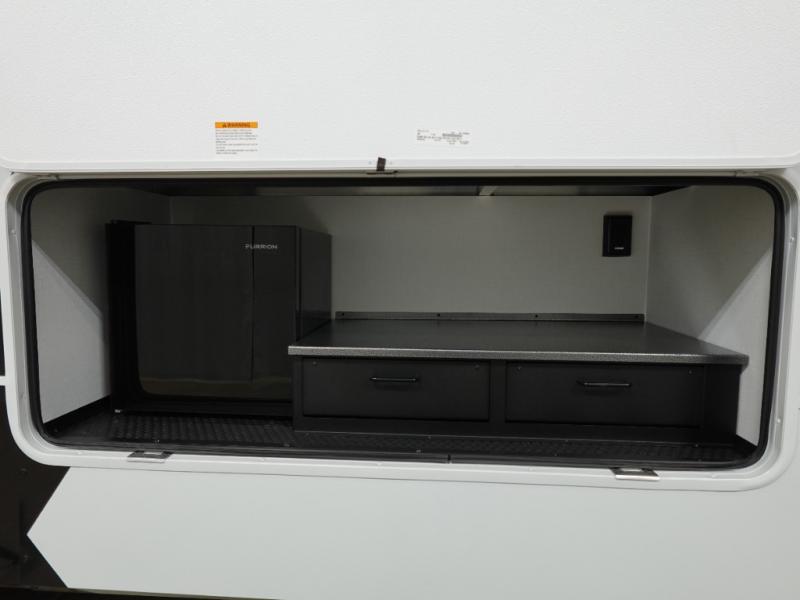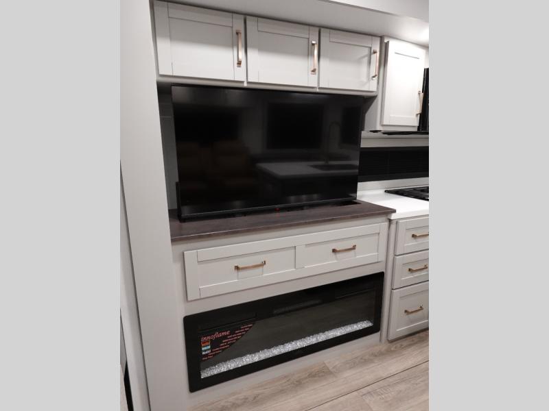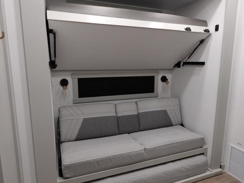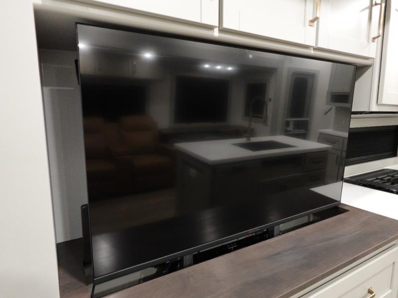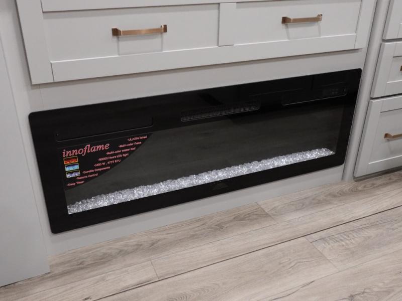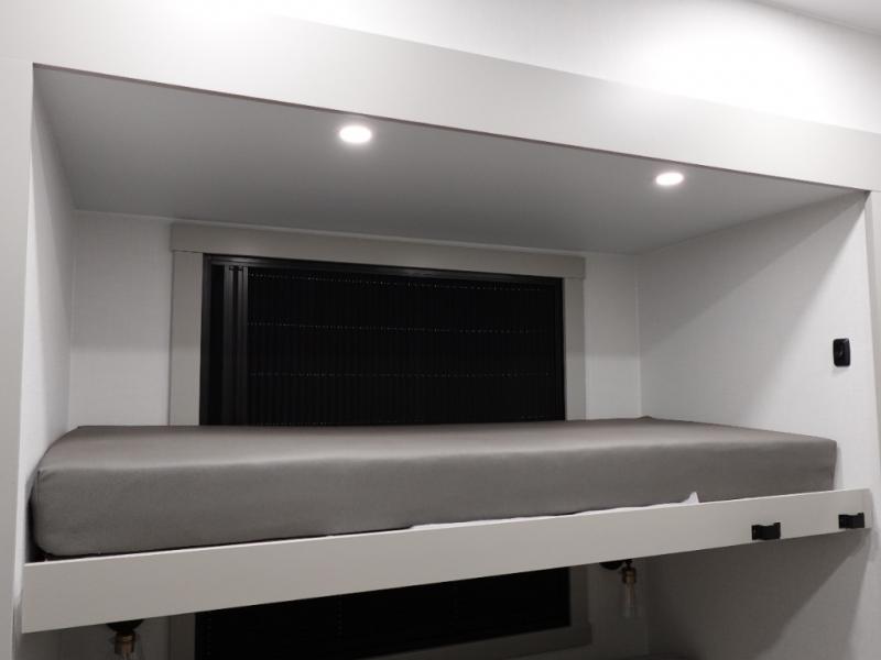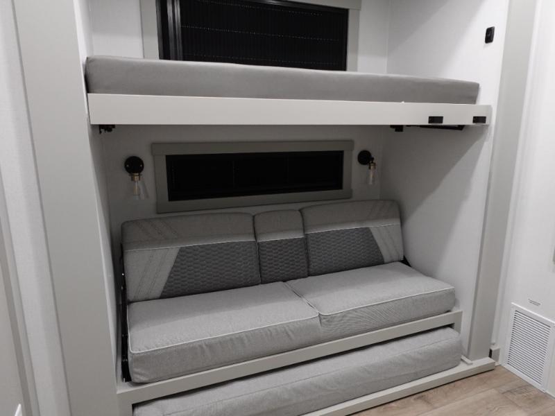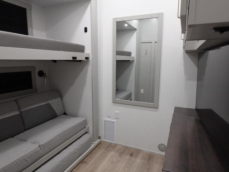 This unit is perfect for your family that needs sleeping space for eight! There is ample seating with a sliding desk/dining table, 62" theater seating, and a 72" tri-fold sofa along the rear wall. You can easily relax and enjoy the telescoping TV with a cozy fireplace below. The kitchen offers all that you need to prepare and cook meals just like home with a 16 cu. ft. refrigerator for your perishables, a 30" residential microwave oven, and three burner range top and oven. You will love the kitchen island all outfitted with pull-out pet bowls and double pull out trash bins with an integrated Stow & Go paper towel holder. There is also an 84" pantry with adjustable shelves for all of your canned and dry goods. Mid-coach, just ahead through the main entry, is a bonus room that can be used as a bedroom featuring a sofa bed with flip-up overhead bunk and trundle below, or an office with pull-out desk so that you can work easily while you travel, or it could also be used as a gaming room since there is also a 50" Smart TV. Head up the steps to a bathroom on your left and a private master suite with king bed slide all the way up front. A sliding dresser top features hidden storage which is perfect for jewelry and other personal belongings. The front wardrobe features mirrored doors and the corner closet has been prepped for a stackable washer and dryer if you choose to add that option.