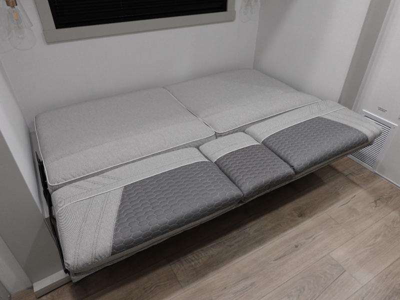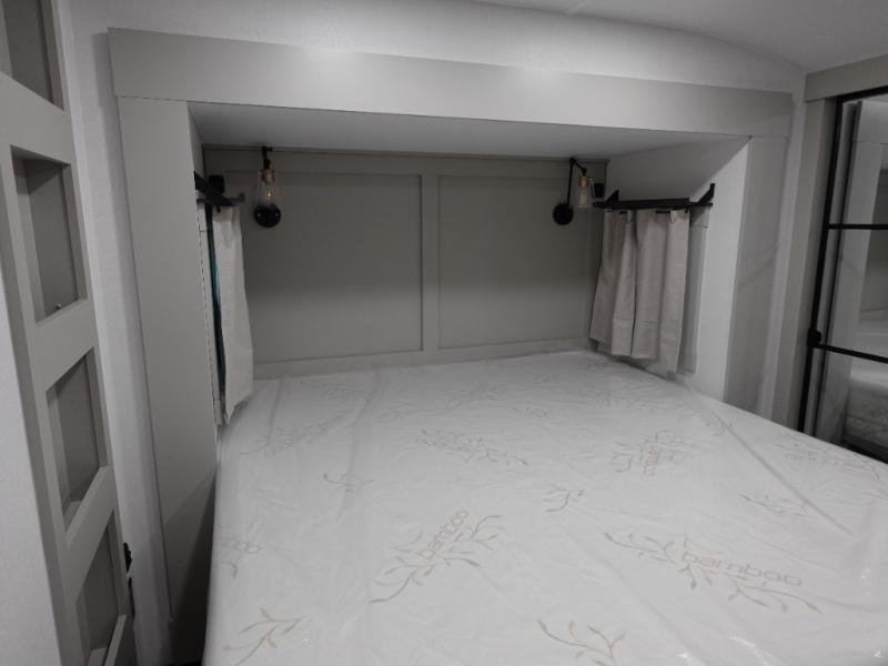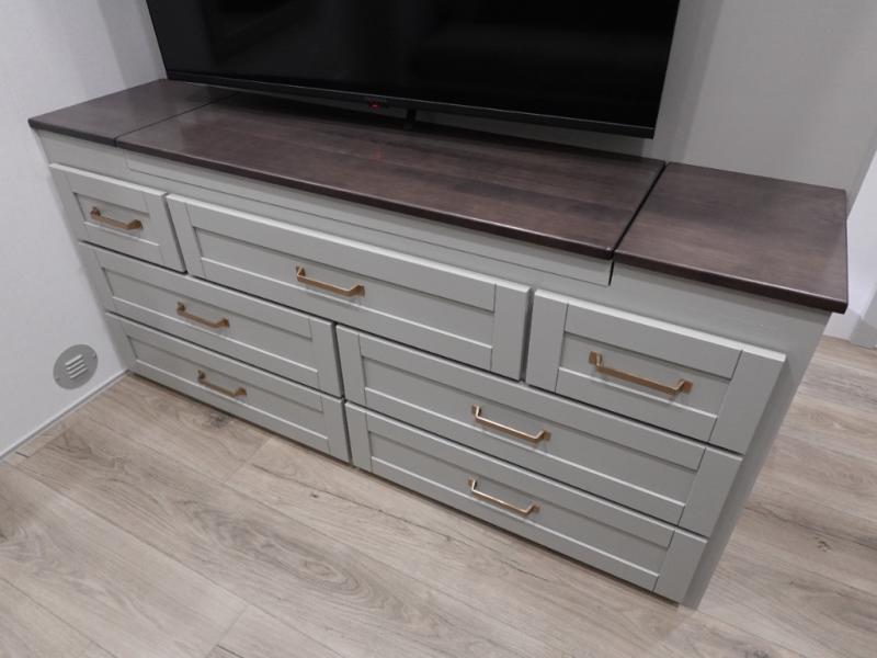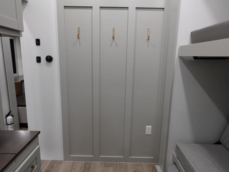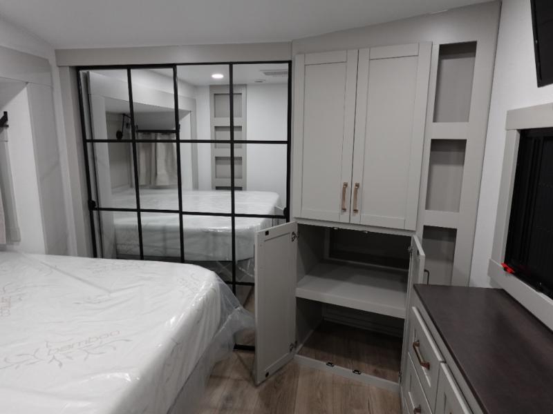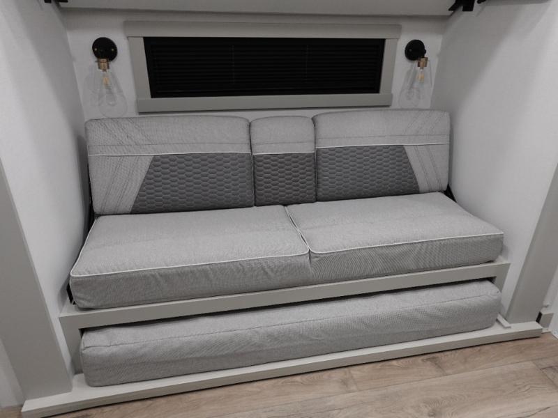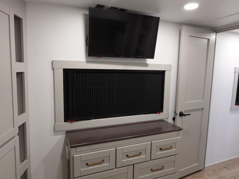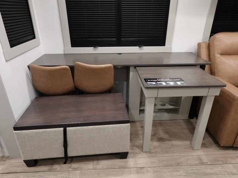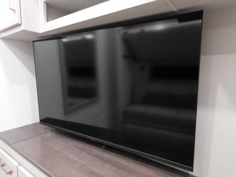 This unit is perfect for your family that needs sleeping space for eight! There is ample seating with a sliding desk/dining table, 62" theater seating, and a 72" tri-fold sofa along the rear wall. You can easily relax and enjoy the telescoping TV with a cozy fireplace below. The kitchen offers all that you need to prepare and cook meals just like home with a 16 cu. ft. refrigerator for your perishables, a 30" residential microwave oven, and three burner range top and oven. You will love the kitchen island all outfitted with pull-out pet bowls and double pull out trash bins with an integrated Stow & Go paper towel holder. There is also an 84" pantry with adjustable shelves for all of your canned and dry goods. Mid-coach, just ahead through the main entry, is a bonus room that can be used as a bedroom featuring a sofa bed with flip-up overhead bunk and trundle below, or an office with pull-out desk so that you can work easily while you travel, or it could also be used as a gaming room since there is also a 50" Smart TV. Head up the steps to a bathroom on your left and a private master suite with king bed slide all the way up front. A sliding dresser top features hidden storage which is perfect for jewelry and other personal belongings. The front wardrobe features mirrored doors and the corner closet has been prepped for a stackable washer and dryer if you choose to add that option.