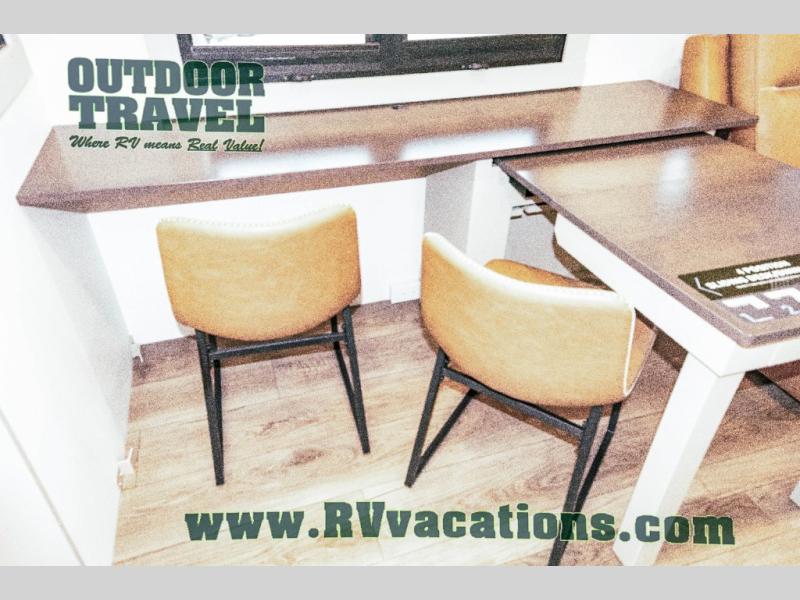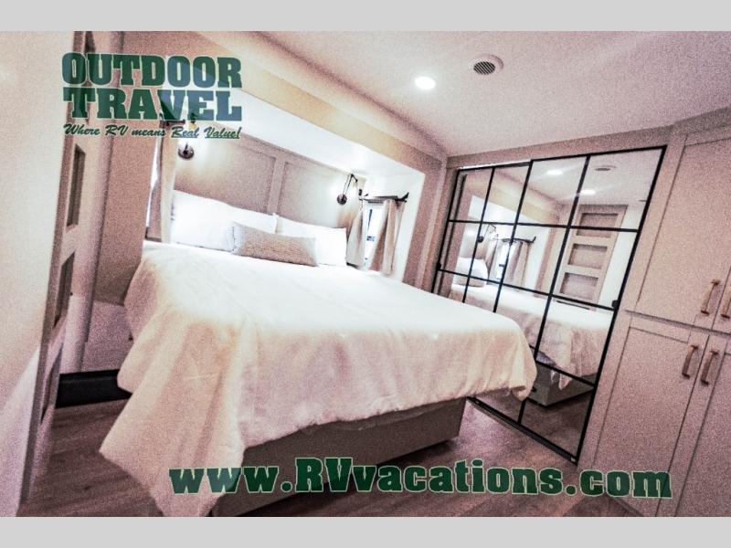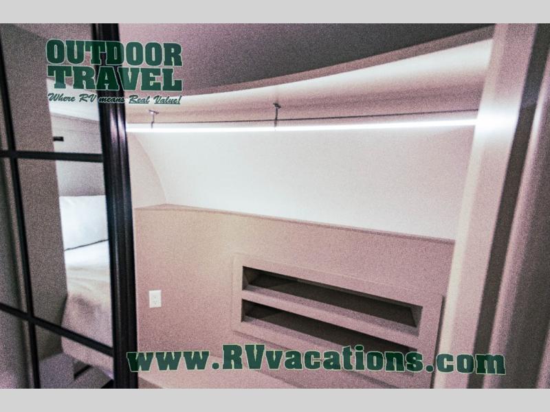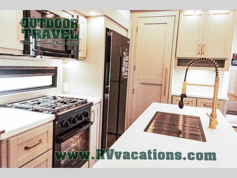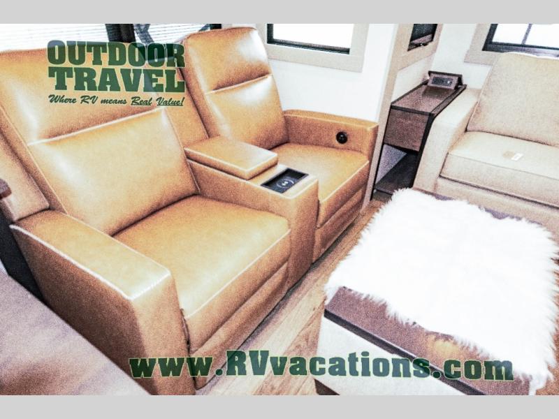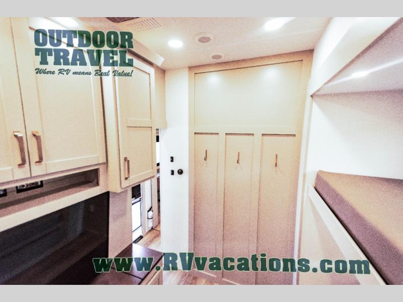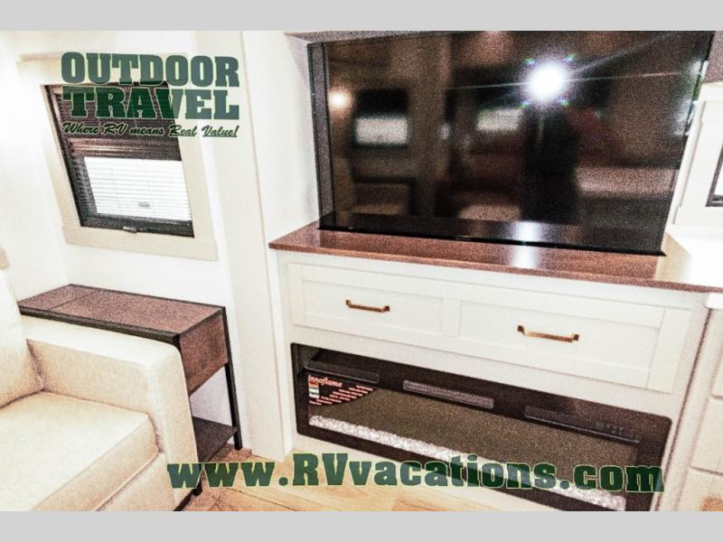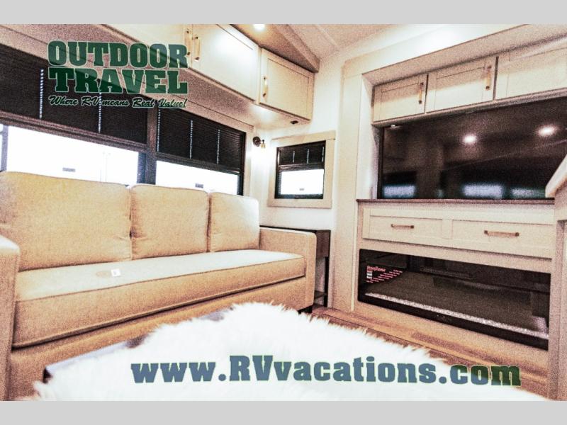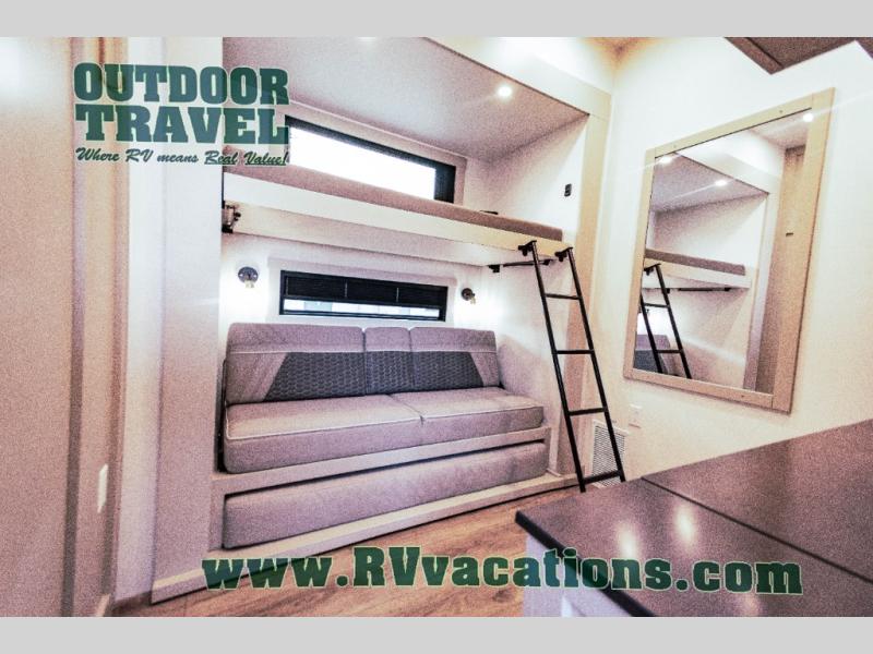 This unit is perfect for your family that needs sleeping space for eight! There is ample seating with a sliding desk/dining table, 62" theater seating, and a 72" tri-fold sofa along the rear wall. You can easily relax and enjoy the telescoping TV with a cozy fireplace below. The kitchen offers all that you need to prepare and cook meals just like home with a 16 cu. ft. refrigerator for your perishables, a 30" residential microwave oven, and three burner range top and oven. You will love the kitchen island all outfitted with pull-out pet bowls and double pull out trash bins with an integrated Stow & Go paper towel holder. There is also an 84" pantry with adjustable shelves for all of your canned and dry goods. Mid-coach, just ahead through the main entry, is a bonus room that can be used as a bedroom featuring a sofa bed with flip-up overhead bunk and trundle below, or an office with pull-out desk so that you can work easily while you travel, or it could also be used as a gaming room since there is also a 50" Smart TV. Head up the steps to a bathroom on your left and a private master suite with king bed slide all the way up front. A sliding dresser top features hidden storage which is perfect for jewelry and other personal belongings. The front wardrobe features mirrored doors and the corner closet has been prepped for a stackable washer and dryer if you choose to add that option.