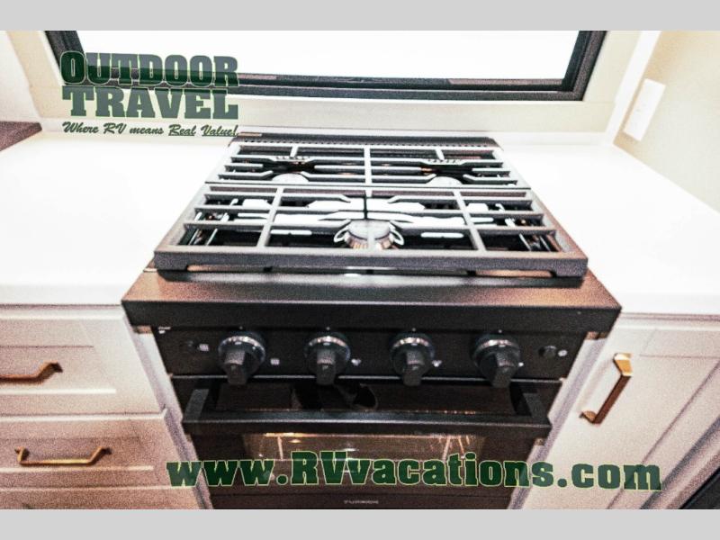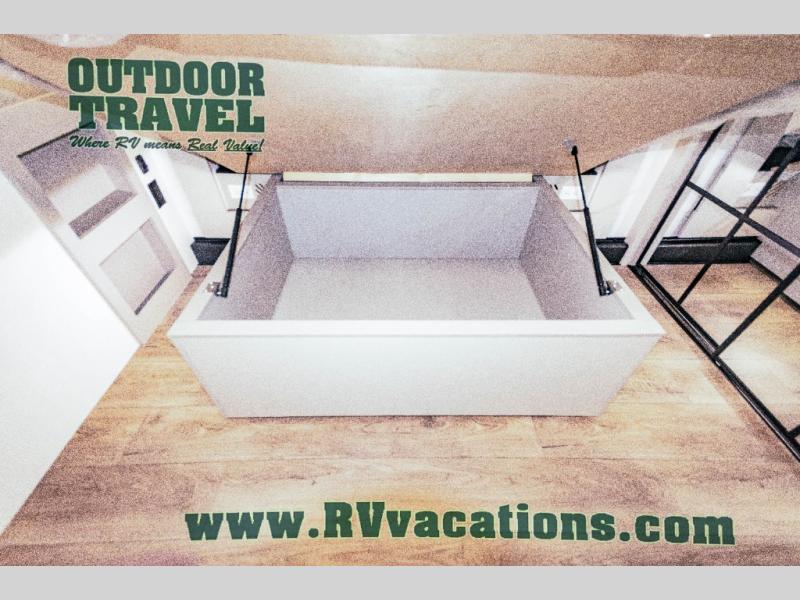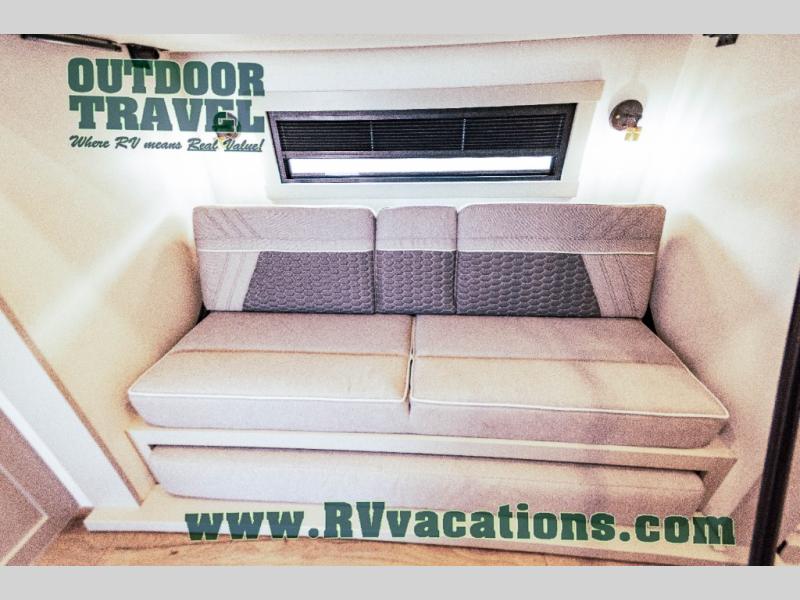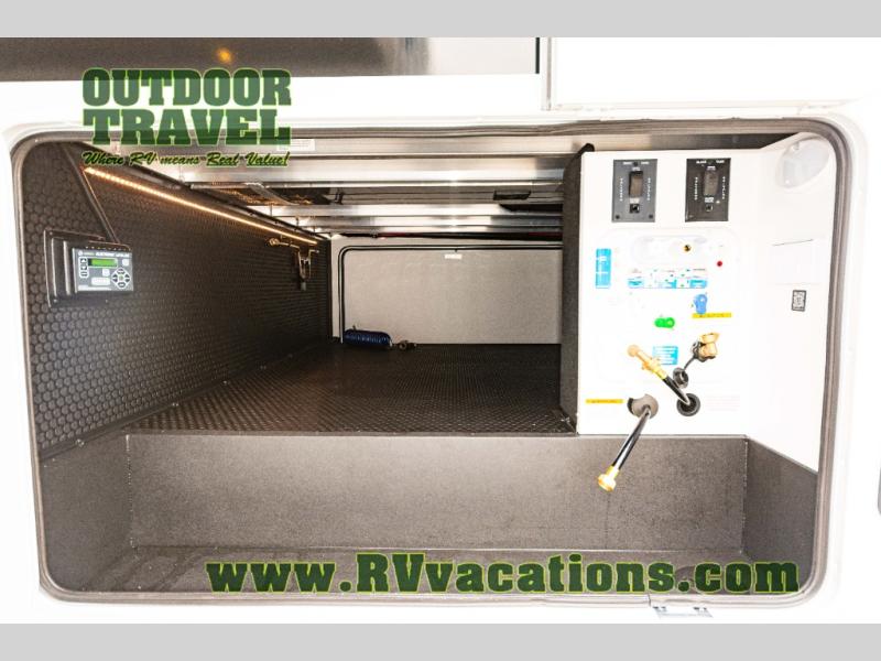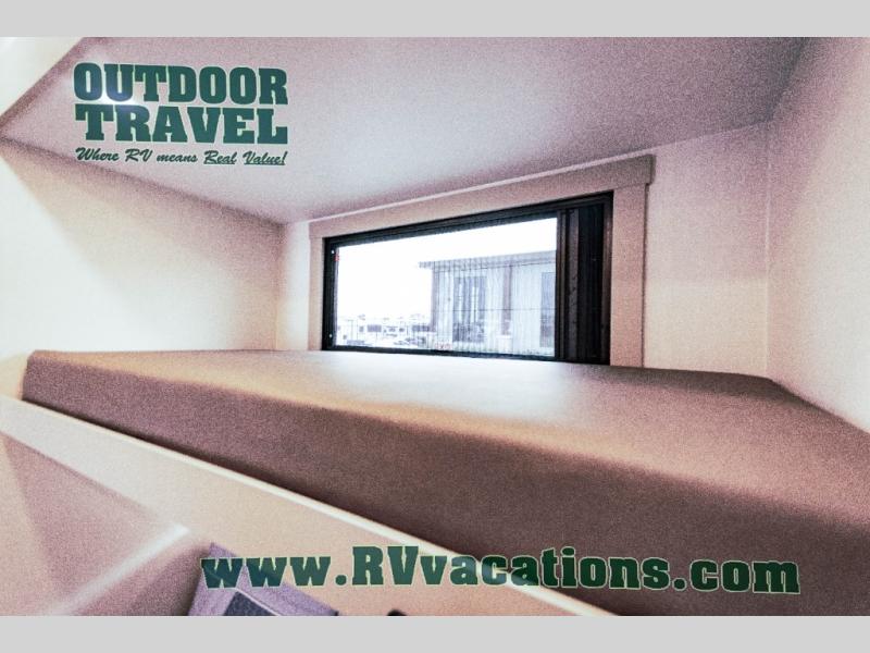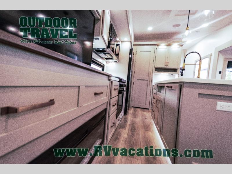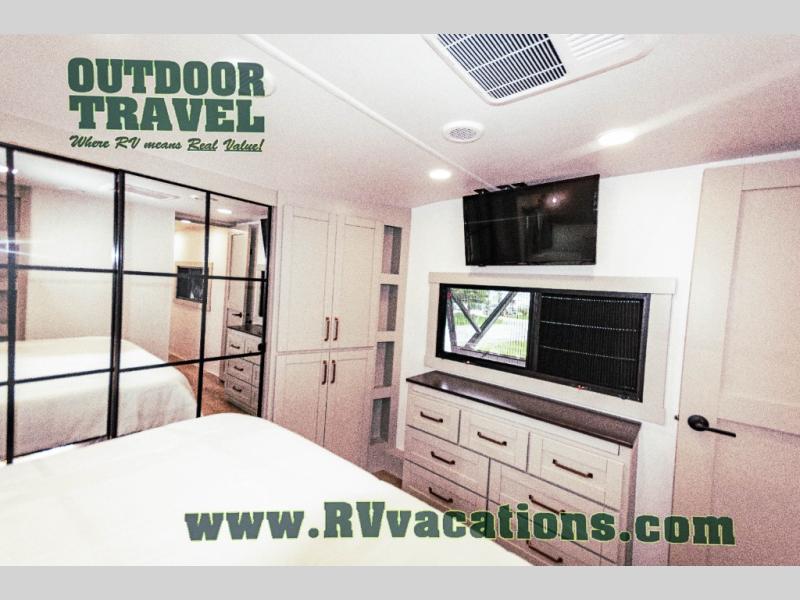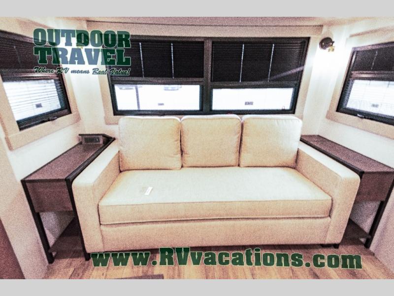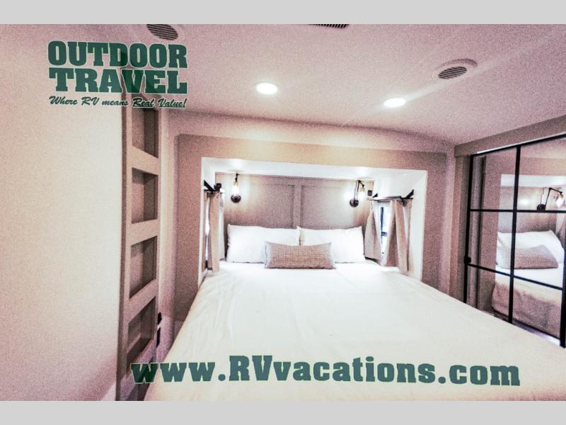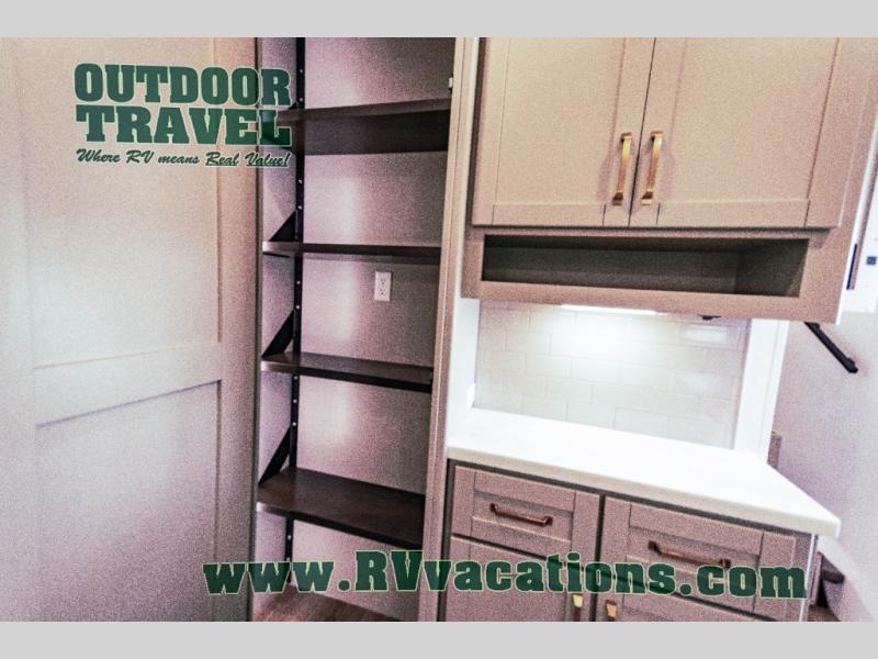 This unit is perfect for your family that needs sleeping space for eight! There is ample seating with a sliding desk/dining table, 62" theater seating, and a 72" tri-fold sofa along the rear wall. You can easily relax and enjoy the telescoping TV with a cozy fireplace below. The kitchen offers all that you need to prepare and cook meals just like home with a 16 cu. ft. refrigerator for your perishables, a 30" residential microwave oven, and three burner range top and oven. You will love the kitchen island all outfitted with pull-out pet bowls and double pull out trash bins with an integrated Stow & Go paper towel holder. There is also an 84" pantry with adjustable shelves for all of your canned and dry goods. Mid-coach, just ahead through the main entry, is a bonus room that can be used as a bedroom featuring a sofa bed with flip-up overhead bunk and trundle below, or an office with pull-out desk so that you can work easily while you travel, or it could also be used as a gaming room since there is also a 50" Smart TV. Head up the steps to a bathroom on your left and a private master suite with king bed slide all the way up front. A sliding dresser top features hidden storage which is perfect for jewelry and other personal belongings. The front wardrobe features mirrored doors and the corner closet has been prepped for a stackable washer and dryer if you choose to add that option.