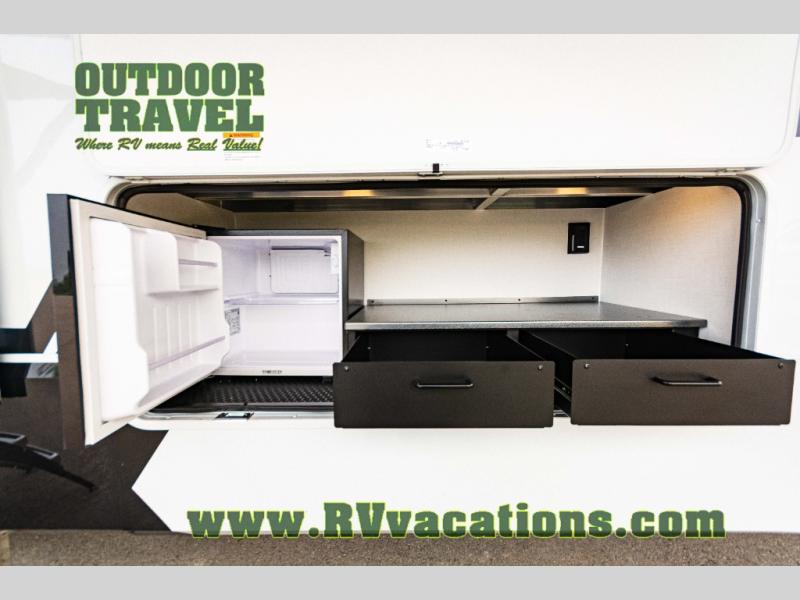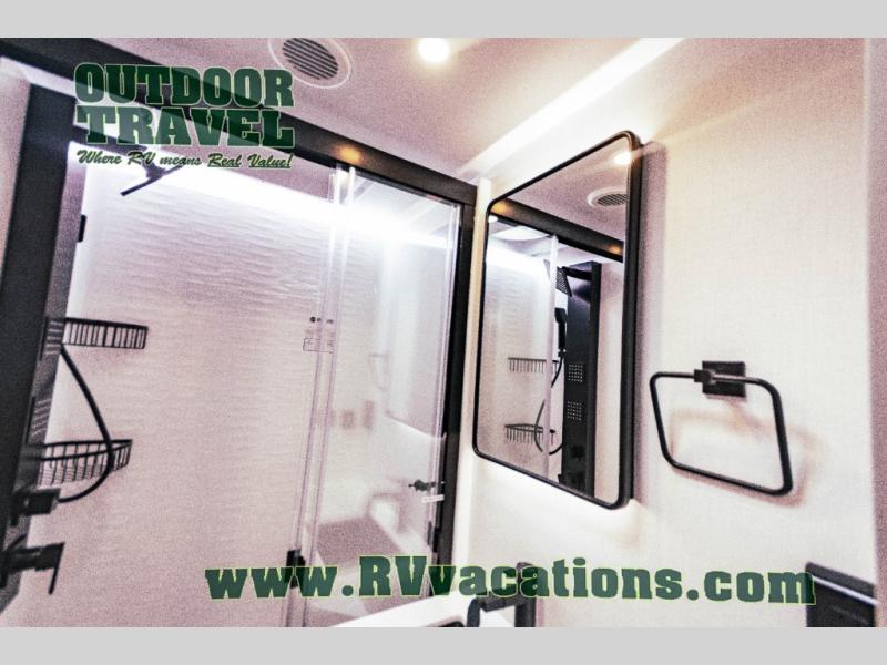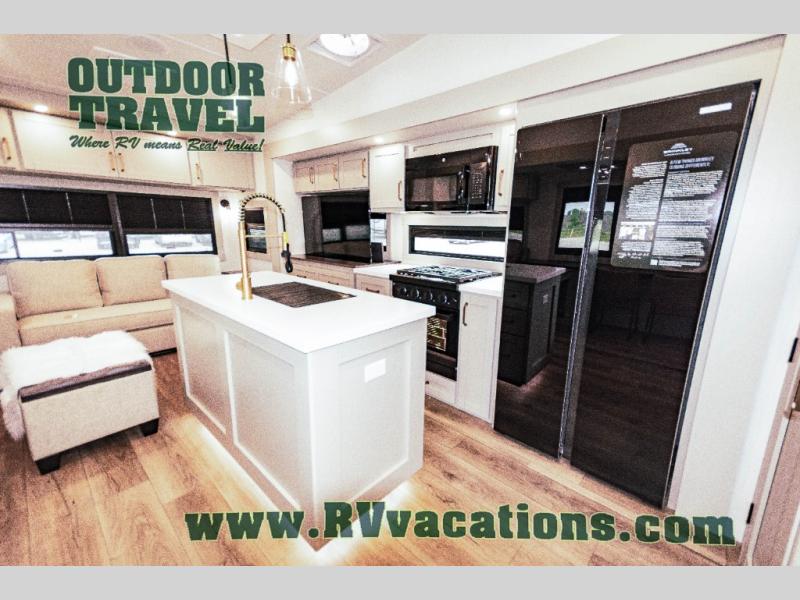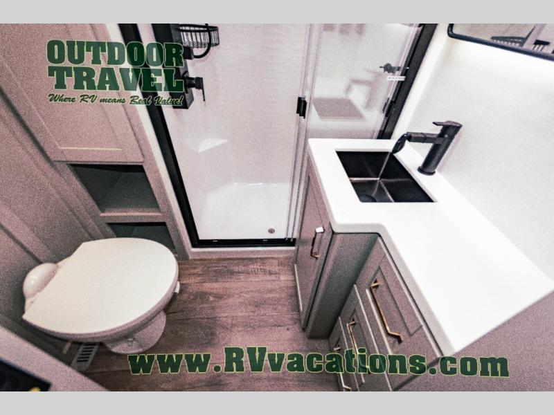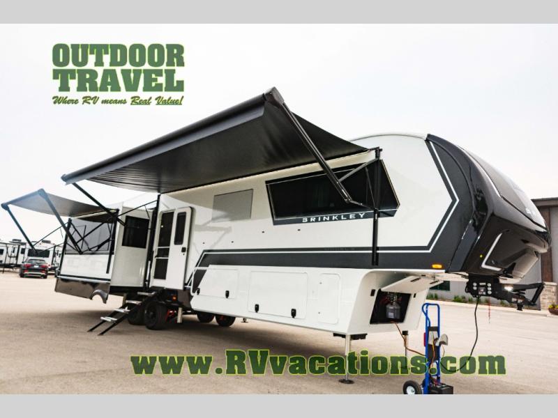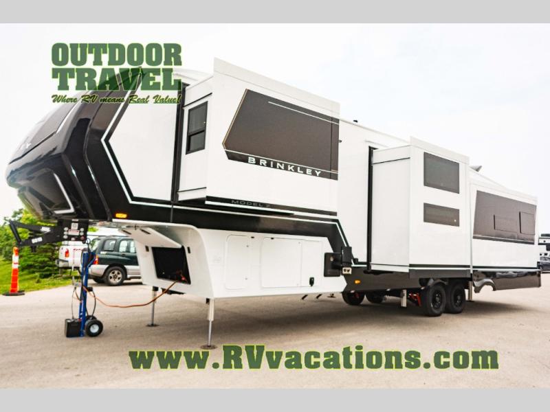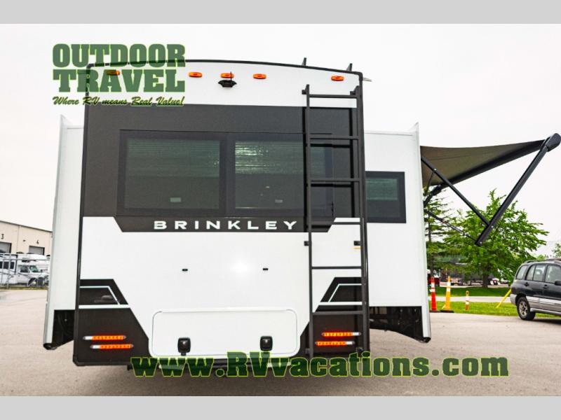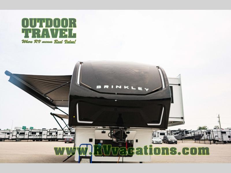 The Brinkley mid-profile Model Z fifth wheels bring you clean lines and an upscale look with plenty of style and exciting new features like the industry first brass plumbing connections. These units also feature an automotive grade front cap, plenty of exterior storage, dual exterior hot and cold showers, and wide stance leveling jacks for easy set up. Residential frameless windows provide a clean look and beautiful views, and ample electrical outlets and 6 USB/USB-C outlets allow all of your electronics and appliances to easily be used and charged.