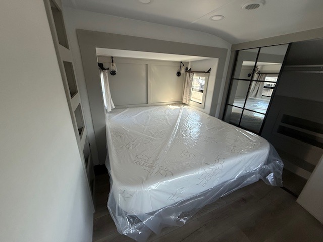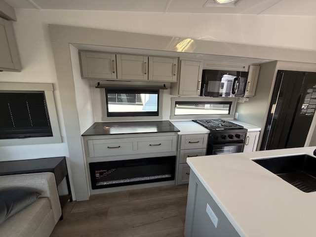 This unit is perfect for your family that needs sleeping space for eight! There is ample seating with a sliding desk/dining table, 62" theater seating, and a 72" tri-fold sofa along the rear wall. You can easily relax and enjoy the telescoping TV with a cozy fireplace below. The kitchen offers all that you need to prepare and cook meals just like home with a 16 cu. ft. refrigerator for your perishables, a 30" residential microwave oven, and three burner range top and oven. You will love the kitchen island all outfitted with pull-out pet bowls and double pull out trash bins with an integrated Stow & Go paper towel holder. There is also an 84" pantry with adjustable shelves for all of your canned and dry goods. Mid-coach, just ahead through the main entry, is a bonus room that can be used as a bedroom featuring a sofa bed with flip-up overhead bunk and trundle below, or an office with pull-out desk so that you can work easily while you travel, or it could also be used as a gaming room since there is also a 50" Smart TV. Head up the steps to a bathroom on your left and a private master suite with king bed slide all the way up front. A sliding dresser top features hidden storage which is perfect for jewelry and other personal belongings. The front wardrobe features mirrored doors and the corner closet has been prepped for a stackable washer and dryer if you choose to add that option.