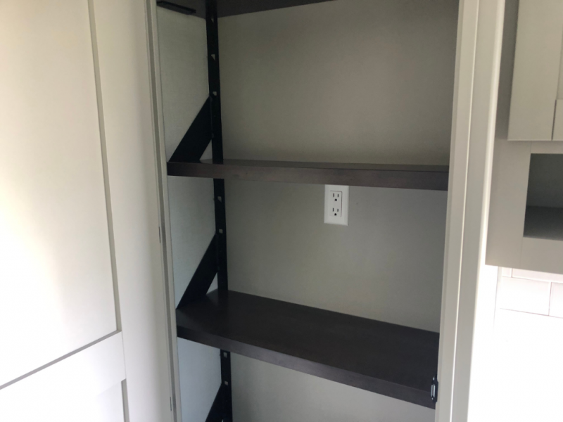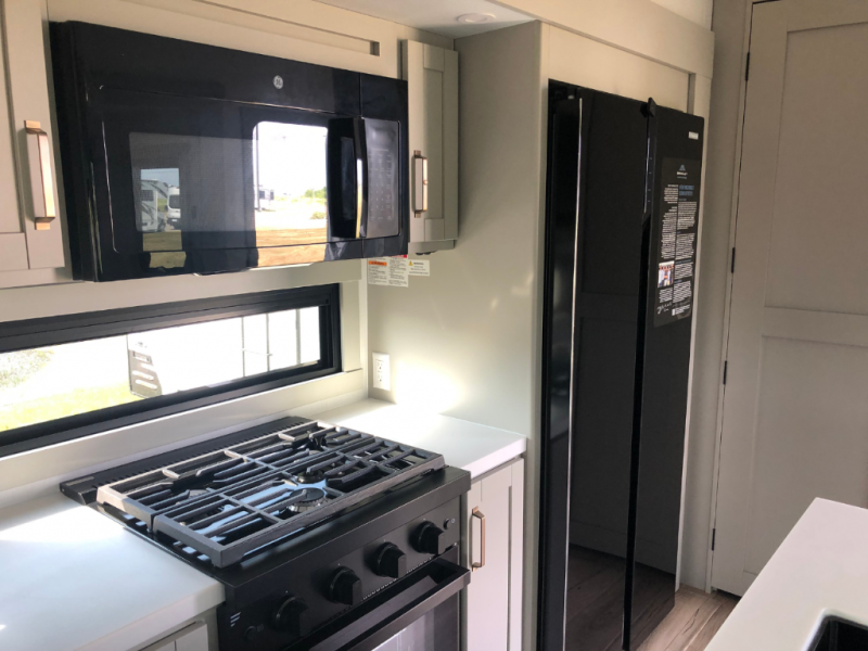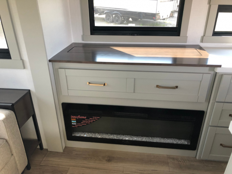 This unit is perfect for your family that needs sleeping space for eight! There is ample seating with a sliding desk/dining table, 62" theater seating, and a 72" tri-fold sofa along the rear wall. You can easily relax and enjoy the telescoping TV with a cozy fireplace below. The kitchen offers all that you need to prepare and cook meals just like home with a 16 cu. ft. refrigerator for your perishables, a 30" residential microwave oven, and three burner range top and oven. You will love the kitchen island all outfitted with pull-out pet bowls and double pull out trash bins with an integrated Stow & Go paper towel holder. There is also an 84" pantry with adjustable shelves for all of your canned and dry goods. Mid-coach, just ahead through the main entry, is a bonus room that can be used as a bedroom featuring a sofa bed with flip-up overhead bunk and trundle below, or an office with pull-out desk so that you can work easily while you travel, or it could also be used as a gaming room since there is also a 50" Smart TV. Head up the steps to a bathroom on your left and a private master suite with king bed slide all the way up front. A sliding dresser top features hidden storage which is perfect for jewelry and other personal belongings. The front wardrobe features mirrored doors and the corner closet has been prepped for a stackable washer and dryer if you choose to add that option.