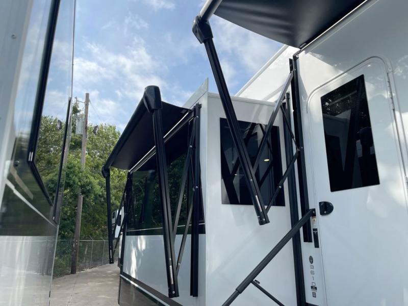 This unit is perfect for your family that needs sleeping space for eight! There is ample seating with a sliding desk/dining table, 62" theater seating, and a 72" tri-fold sofa along the rear wall. You can easily relax and enjoy the telescoping TV with a cozy fireplace below. The kitchen offers all that you need to prepare and cook meals just like home with a 16 cu. ft. refrigerator for your perishables, a 30" residential microwave oven, and three burner range top and oven. You will love the kitchen island all outfitted with pull-out pet bowls and double pull out trash bins with an integrated Stow & Go paper towel holder. There is also an 84" pantry with adjustable shelves for all of your canned and dry goods. Mid-coach, just ahead through the main entry, is a bonus room that can be used as a bedroom featuring a sofa bed with flip-up overhead bunk and trundle below, or an office with pull-out desk so that you can work easily while you travel, or it could also be used as a gaming room since there is also a 50" Smart TV. Head up the steps to a bathroom on your left and a private master suite with king bed slide all the way up front. A sliding dresser top features hidden storage which is perfect for jewelry and other personal belongings. The front wardrobe features mirrored doors and the corner closet has been prepped for a stackable washer and dryer if you choose to add that option.