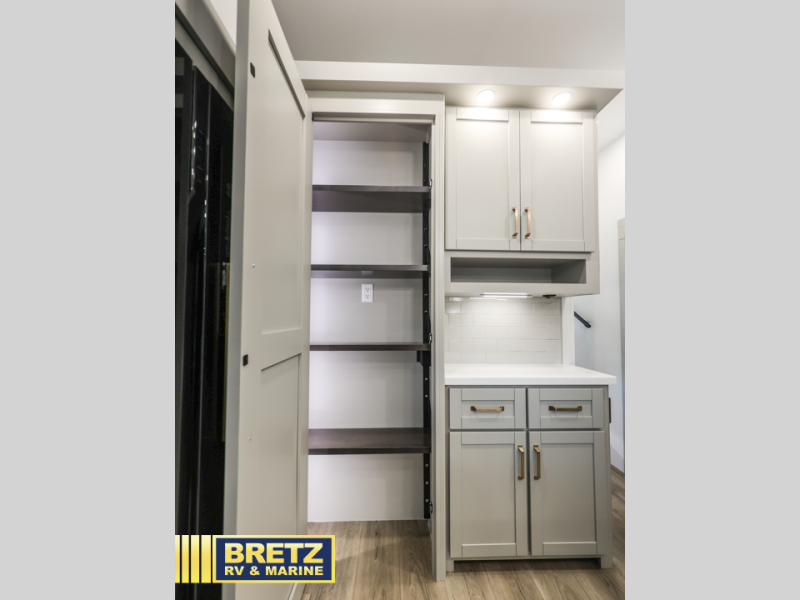 This unit is perfect for your family that needs sleeping space for eight! There is ample seating with a sliding desk/dining table, 62" theater seating, and a 72" tri-fold sofa along the rear wall. You can easily relax and enjoy the telescoping TV with a cozy fireplace below. The kitchen offers all that you need to prepare and cook meals just like home with a 16 cu. ft. refrigerator for your perishables, a 30" residential microwave oven, and three burner range top and oven. You will love the kitchen island all outfitted with pull-out pet bowls and double pull out trash bins with an integrated Stow & Go paper towel holder. There is also an 84" pantry with adjustable shelves for all of your canned and dry goods. Mid-coach, just ahead through the main entry, is a bonus room that can be used as a bedroom featuring a sofa bed with flip-up overhead bunk and trundle below, or an office with pull-out desk so that you can work easily while you travel, or it could also be used as a gaming room since there is also a 50" Smart TV. Head up the steps to a bathroom on your left and a private master suite with king bed slide all the way up front. A sliding dresser top features hidden storage which is perfect for jewelry and other personal belongings. The front wardrobe features mirrored doors and the corner closet has been prepped for a stackable washer and dryer if you choose to add that option.