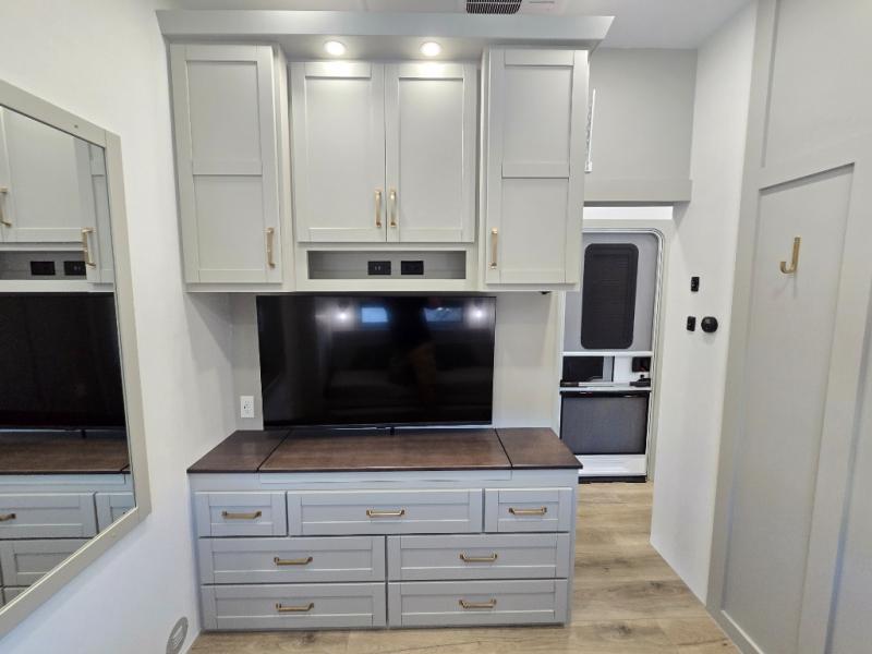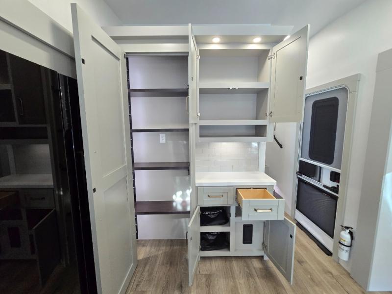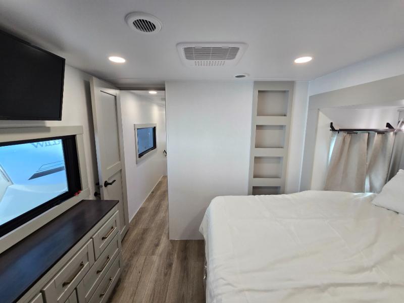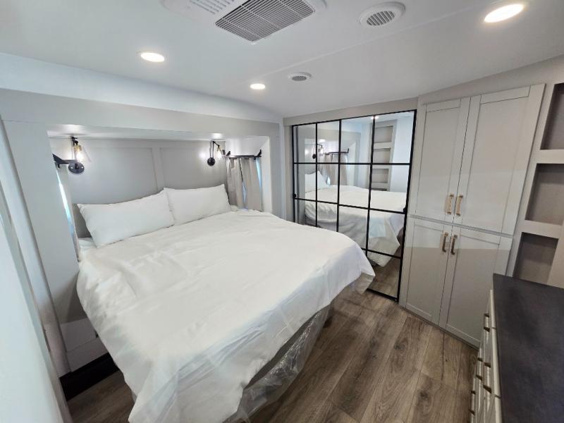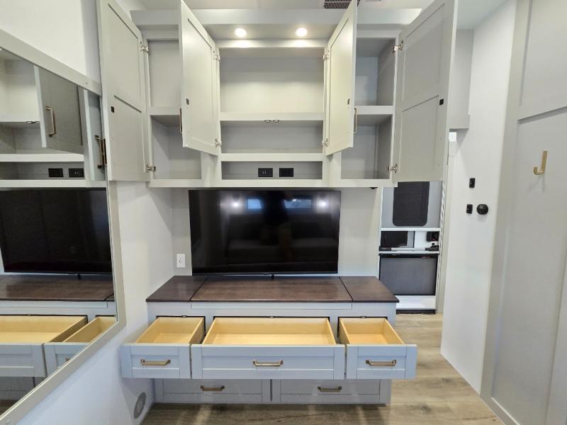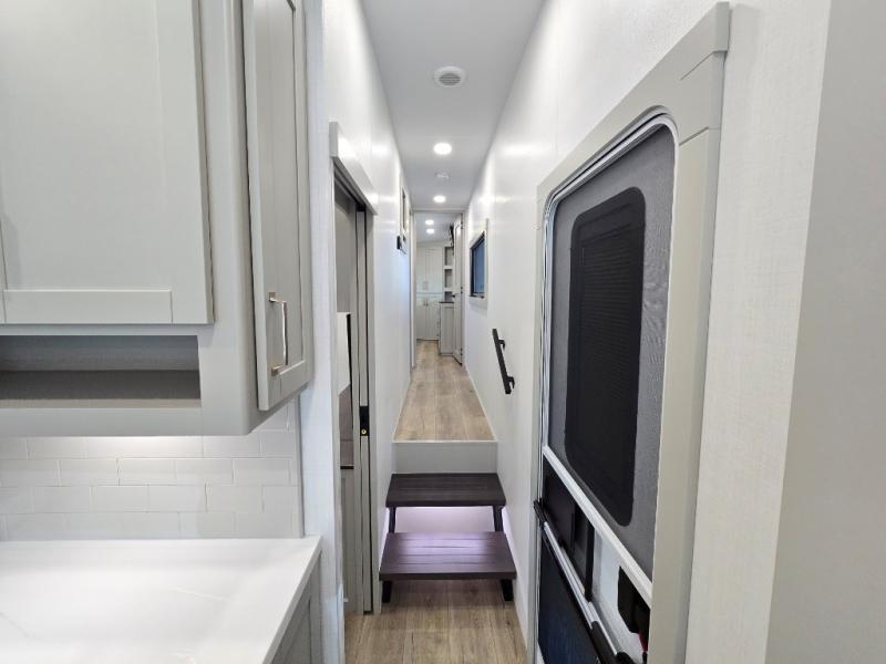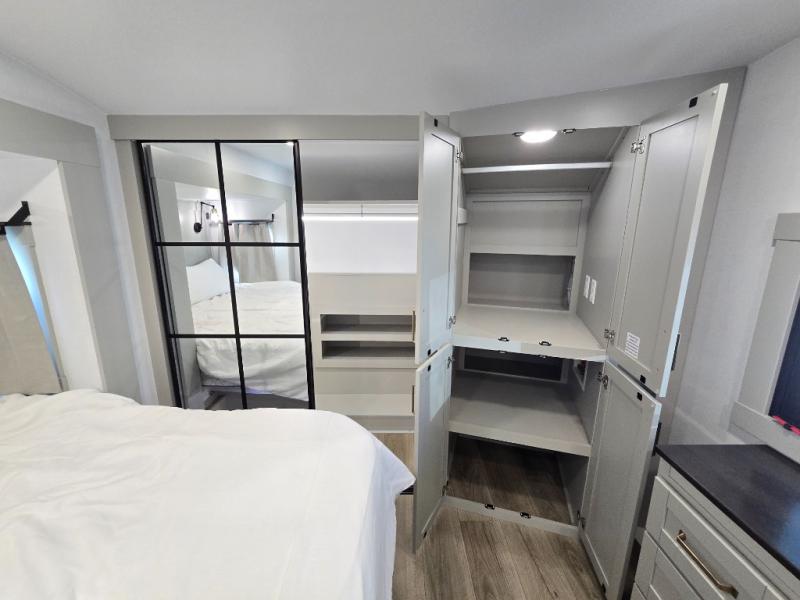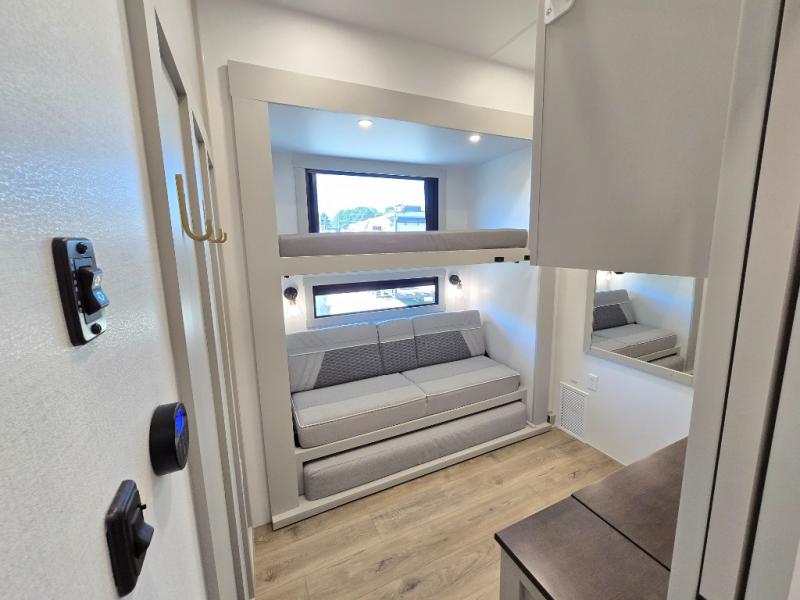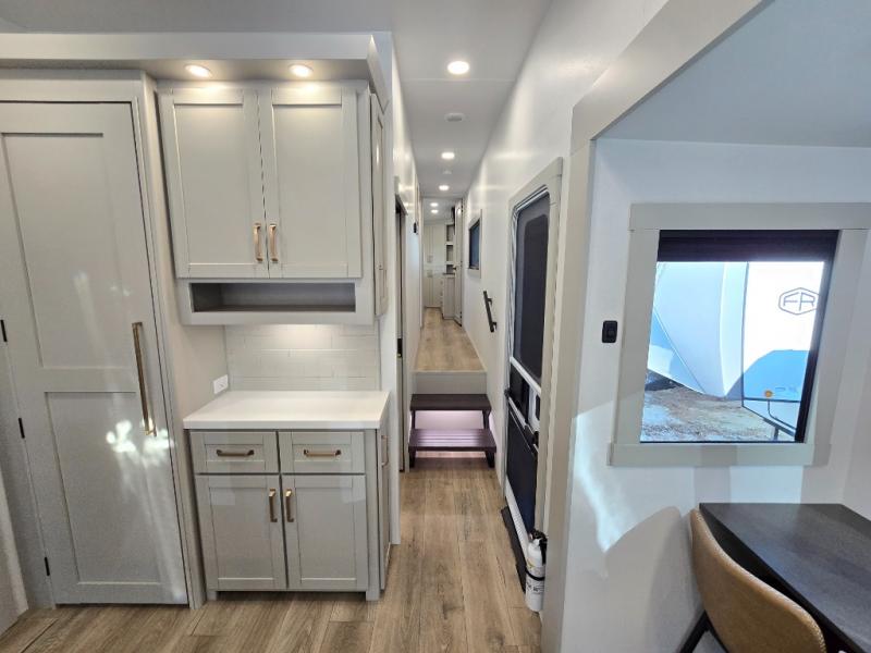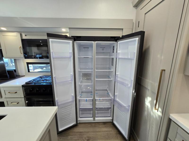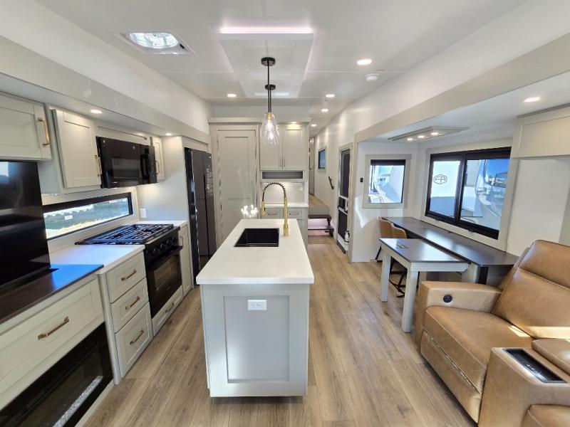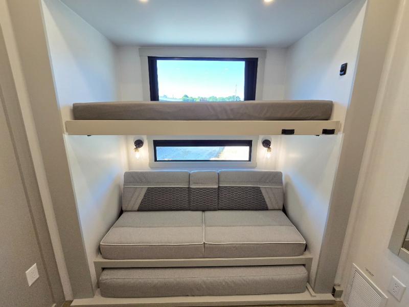 This unit is perfect for your family that needs sleeping space for eight! There is ample seating with a sliding desk/dining table, 62" theater seating, and a 72" tri-fold sofa along the rear wall. You can easily relax and enjoy the telescoping TV with a cozy fireplace below. The kitchen offers all that you need to prepare and cook meals just like home with a 16 cu. ft. refrigerator for your perishables, a 30" residential microwave oven, and three burner range top and oven. You will love the kitchen island all outfitted with pull-out pet bowls and double pull out trash bins with an integrated Stow & Go paper towel holder. There is also an 84" pantry with adjustable shelves for all of your canned and dry goods. Mid-coach, just ahead through the main entry, is a bonus room that can be used as a bedroom featuring a sofa bed with flip-up overhead bunk and trundle below, or an office with pull-out desk so that you can work easily while you travel, or it could also be used as a gaming room since there is also a 50" Smart TV. Head up the steps to a bathroom on your left and a private master suite with king bed slide all the way up front. A sliding dresser top features hidden storage which is perfect for jewelry and other personal belongings. The front wardrobe features mirrored doors and the corner closet has been prepped for a stackable washer and dryer if you choose to add that option.