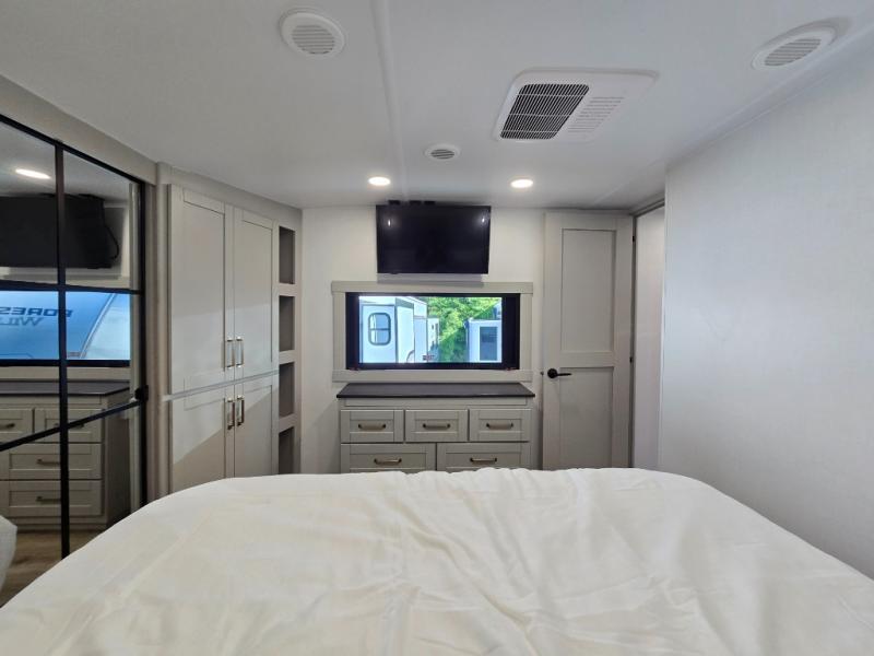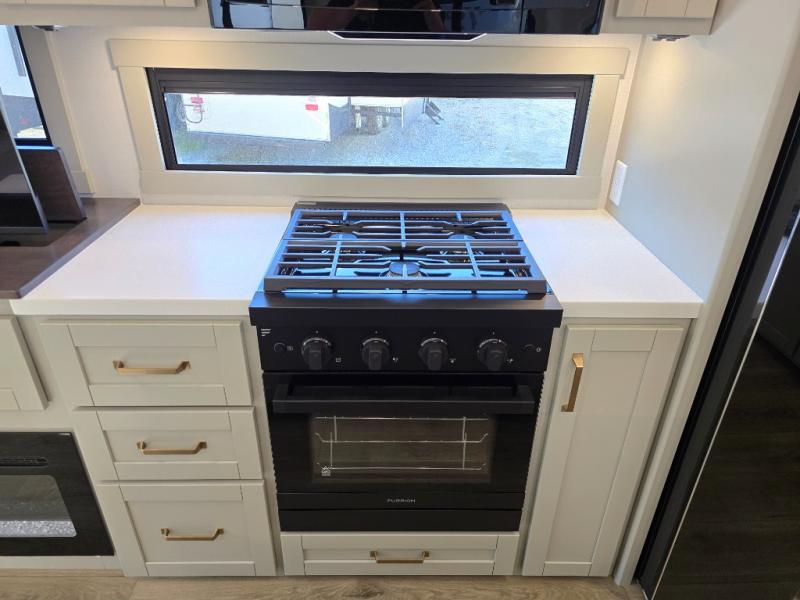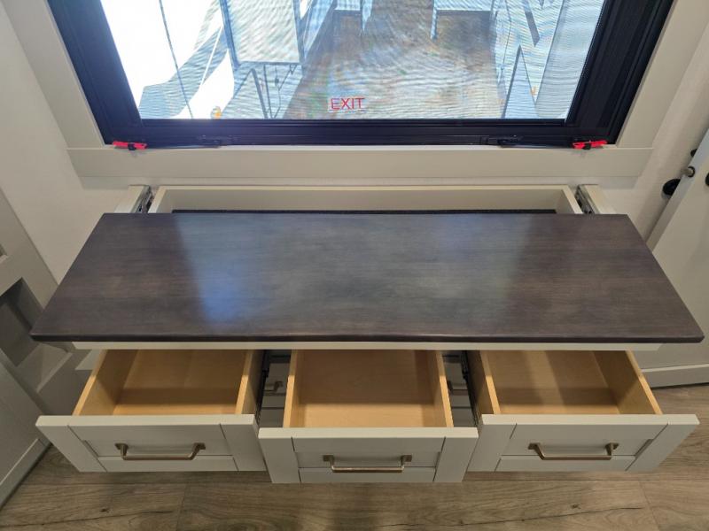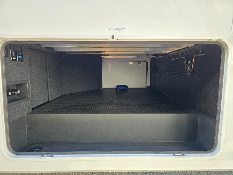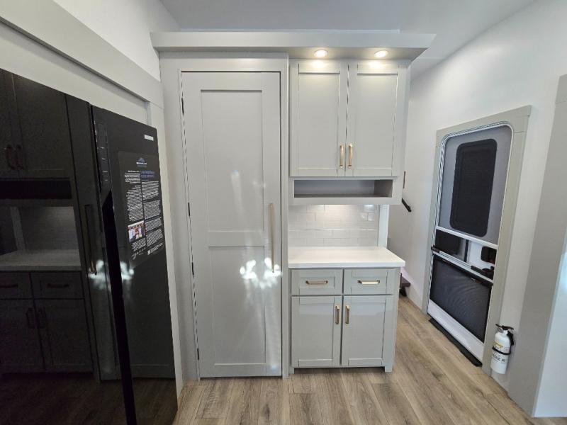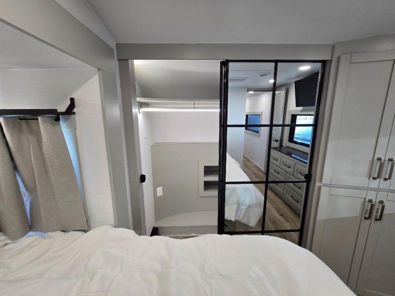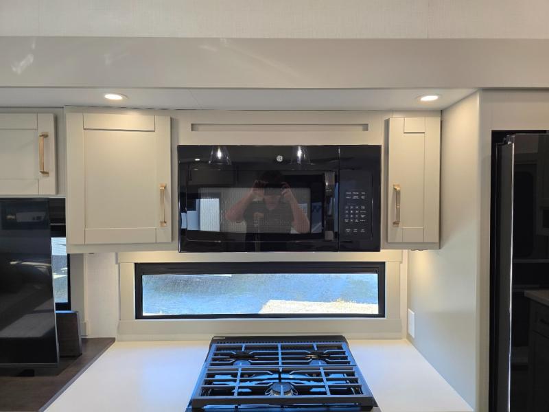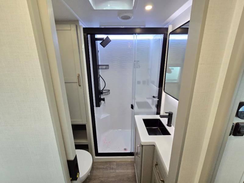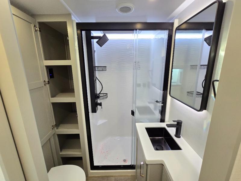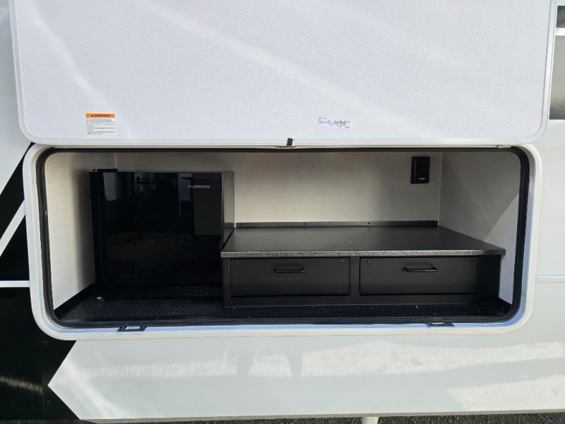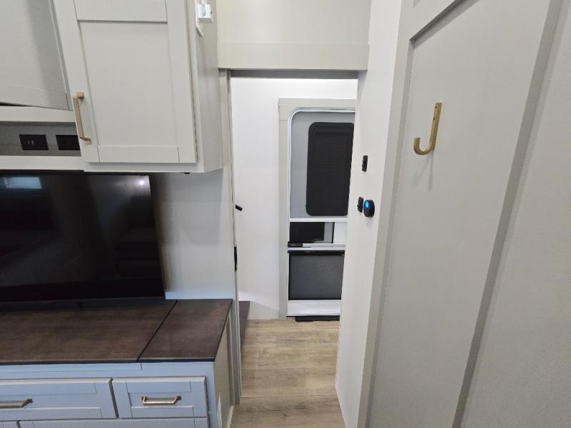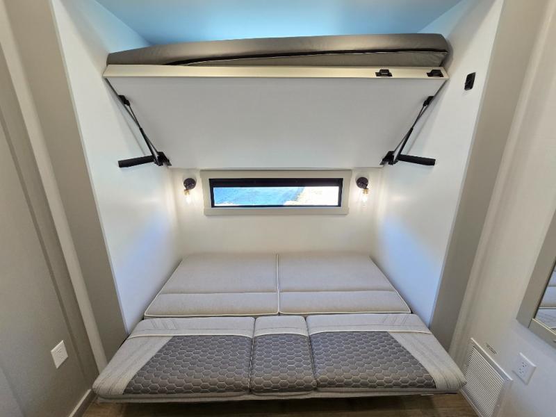 This unit is perfect for your family that needs sleeping space for eight! There is ample seating with a sliding desk/dining table, 62" theater seating, and a 72" tri-fold sofa along the rear wall. You can easily relax and enjoy the telescoping TV with a cozy fireplace below. The kitchen offers all that you need to prepare and cook meals just like home with a 16 cu. ft. refrigerator for your perishables, a 30" residential microwave oven, and three burner range top and oven. You will love the kitchen island all outfitted with pull-out pet bowls and double pull out trash bins with an integrated Stow & Go paper towel holder. There is also an 84" pantry with adjustable shelves for all of your canned and dry goods. Mid-coach, just ahead through the main entry, is a bonus room that can be used as a bedroom featuring a sofa bed with flip-up overhead bunk and trundle below, or an office with pull-out desk so that you can work easily while you travel, or it could also be used as a gaming room since there is also a 50" Smart TV. Head up the steps to a bathroom on your left and a private master suite with king bed slide all the way up front. A sliding dresser top features hidden storage which is perfect for jewelry and other personal belongings. The front wardrobe features mirrored doors and the corner closet has been prepped for a stackable washer and dryer if you choose to add that option.