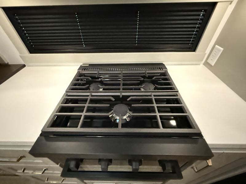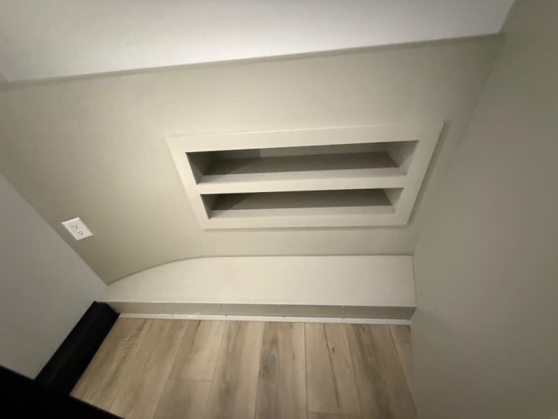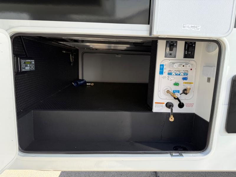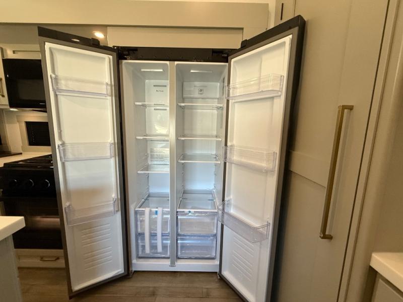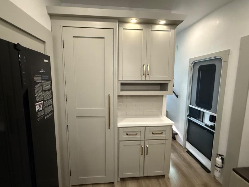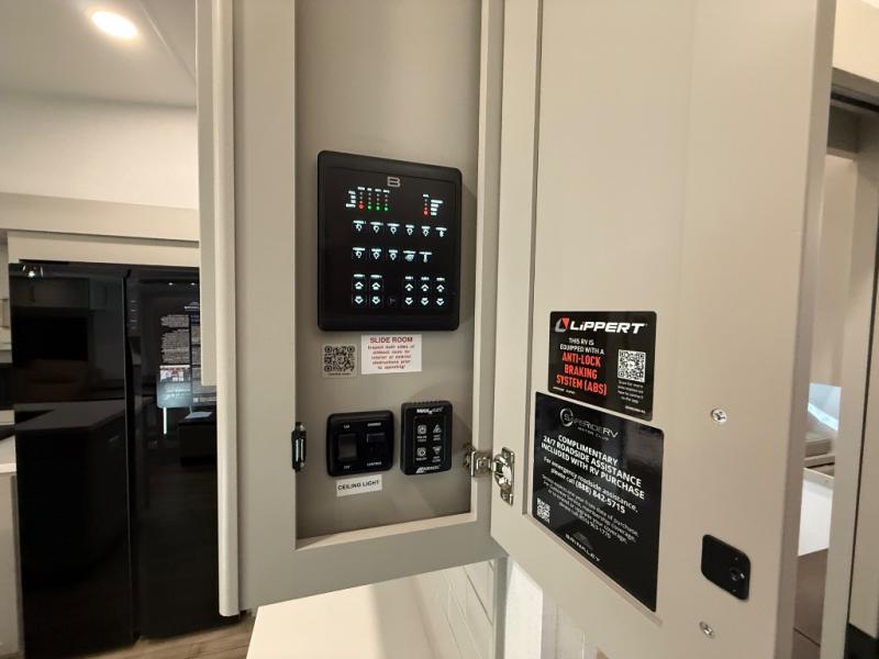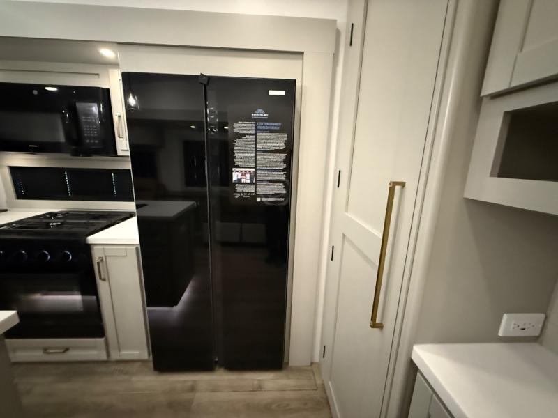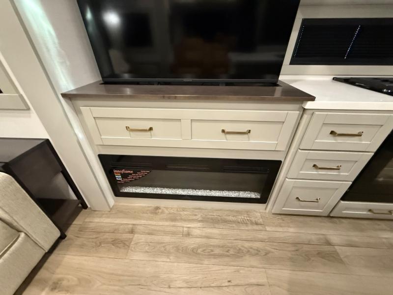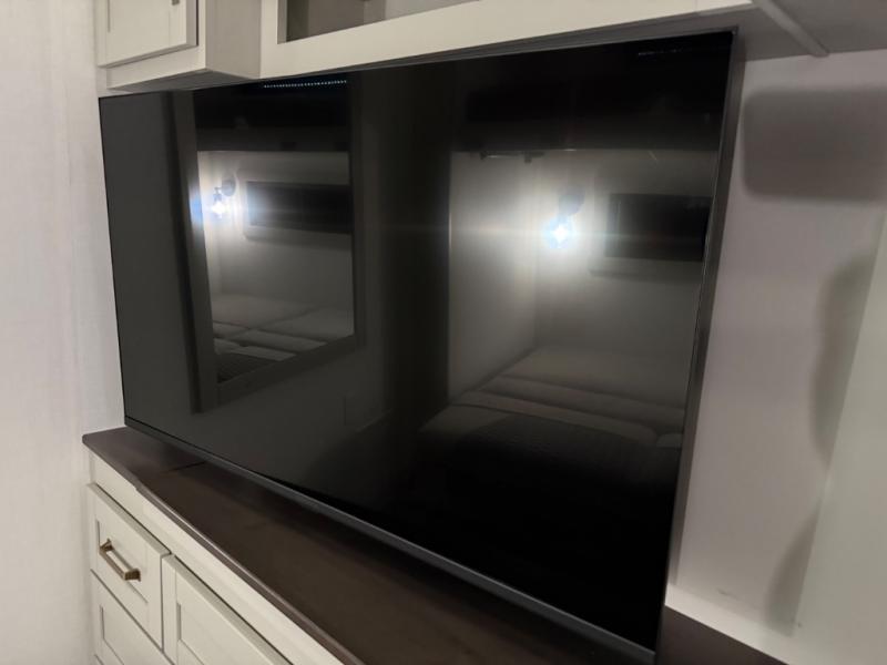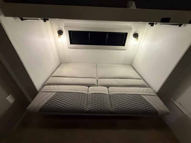 This unit is perfect for your family that needs sleeping space for eight! There is ample seating with a sliding desk/dining table, 62" theater seating, and a 72" tri-fold sofa along the rear wall. You can easily relax and enjoy the telescoping TV with a cozy fireplace below. The kitchen offers all that you need to prepare and cook meals just like home with a 16 cu. ft. refrigerator for your perishables, a 30" residential microwave oven, and three burner range top and oven. You will love the kitchen island all outfitted with pull-out pet bowls and double pull out trash bins with an integrated Stow & Go paper towel holder. There is also an 84" pantry with adjustable shelves for all of your canned and dry goods. Mid-coach, just ahead through the main entry, is a bonus room that can be used as a bedroom featuring a sofa bed with flip-up overhead bunk and trundle below, or an office with pull-out desk so that you can work easily while you travel, or it could also be used as a gaming room since there is also a 50" Smart TV. Head up the steps to a bathroom on your left and a private master suite with king bed slide all the way up front. A sliding dresser top features hidden storage which is perfect for jewelry and other personal belongings. The front wardrobe features mirrored doors and the corner closet has been prepped for a stackable washer and dryer if you choose to add that option.