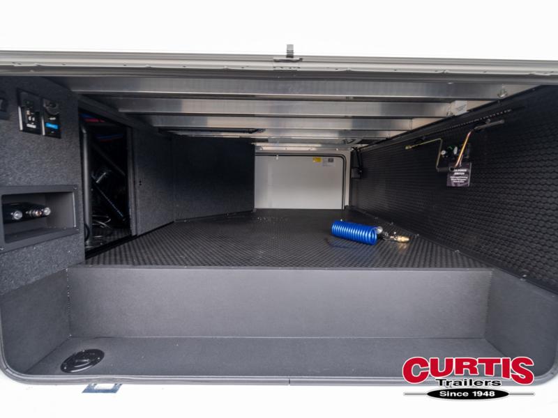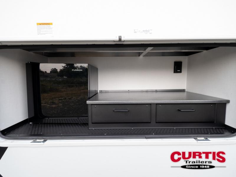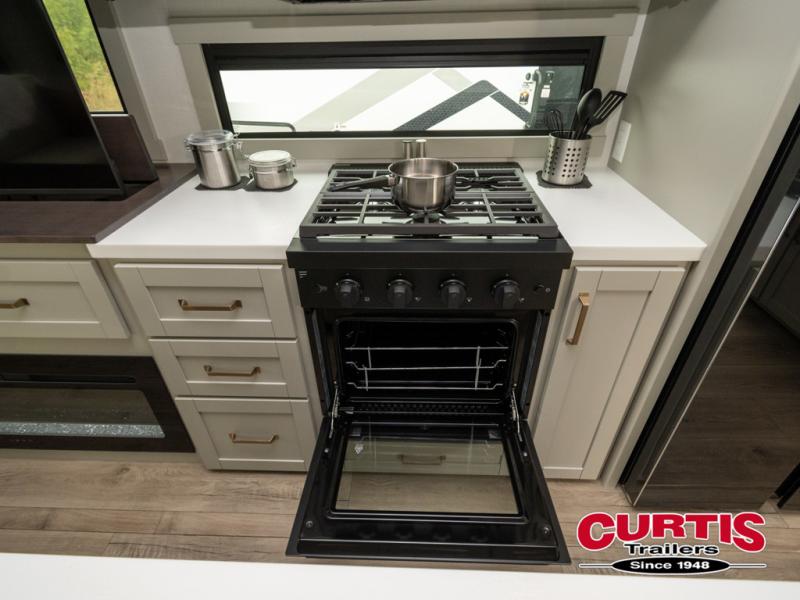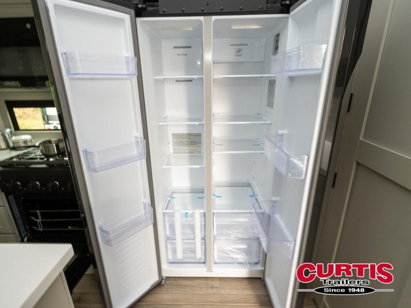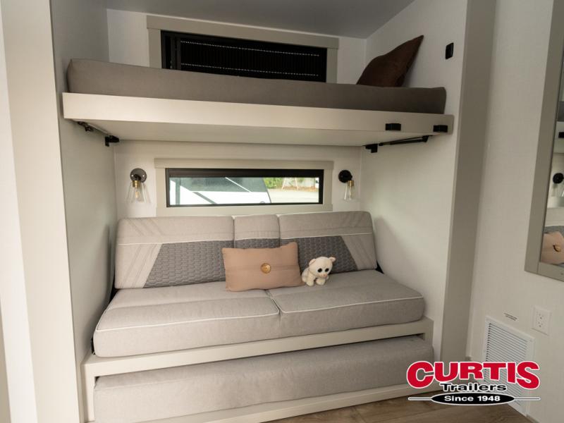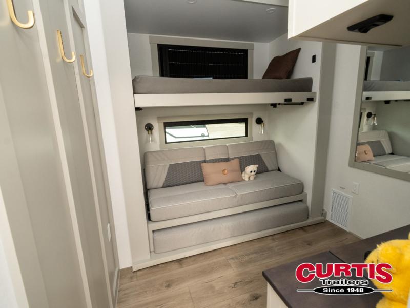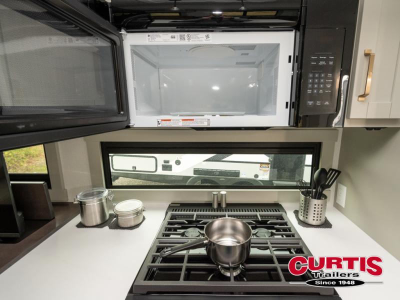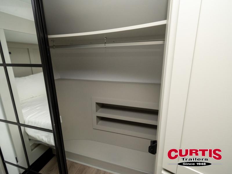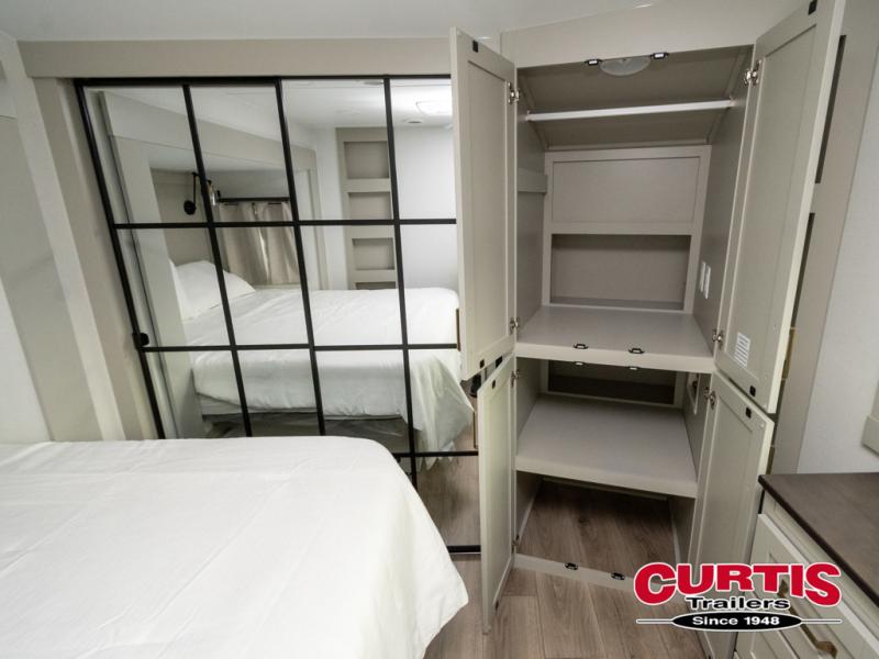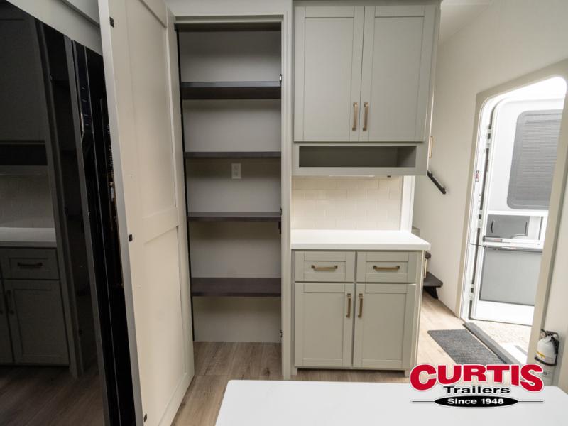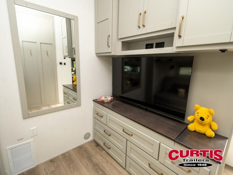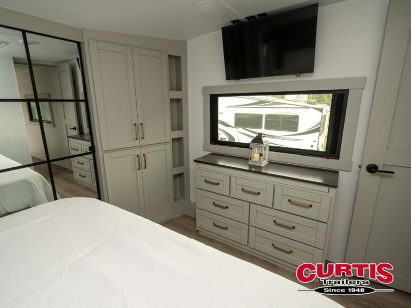 This unit is perfect for your family that needs sleeping space for eight! There is ample seating with a sliding desk/dining table, 62" theater seating, and a 72" tri-fold sofa along the rear wall. You can easily relax and enjoy the telescoping TV with a cozy fireplace below. The kitchen offers all that you need to prepare and cook meals just like home with a 16 cu. ft. refrigerator for your perishables, a 30" residential microwave oven, and three burner range top and oven. You will love the kitchen island all outfitted with pull-out pet bowls and double pull out trash bins with an integrated Stow & Go paper towel holder. There is also an 84" pantry with adjustable shelves for all of your canned and dry goods. Mid-coach, just ahead through the main entry, is a bonus room that can be used as a bedroom featuring a sofa bed with flip-up overhead bunk and trundle below, or an office with pull-out desk so that you can work easily while you travel, or it could also be used as a gaming room since there is also a 50" Smart TV. Head up the steps to a bathroom on your left and a private master suite with king bed slide all the way up front. A sliding dresser top features hidden storage which is perfect for jewelry and other personal belongings. The front wardrobe features mirrored doors and the corner closet has been prepped for a stackable washer and dryer if you choose to add that option.